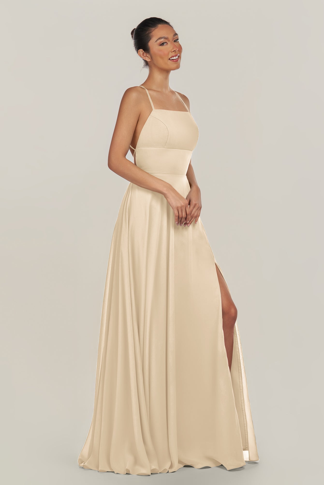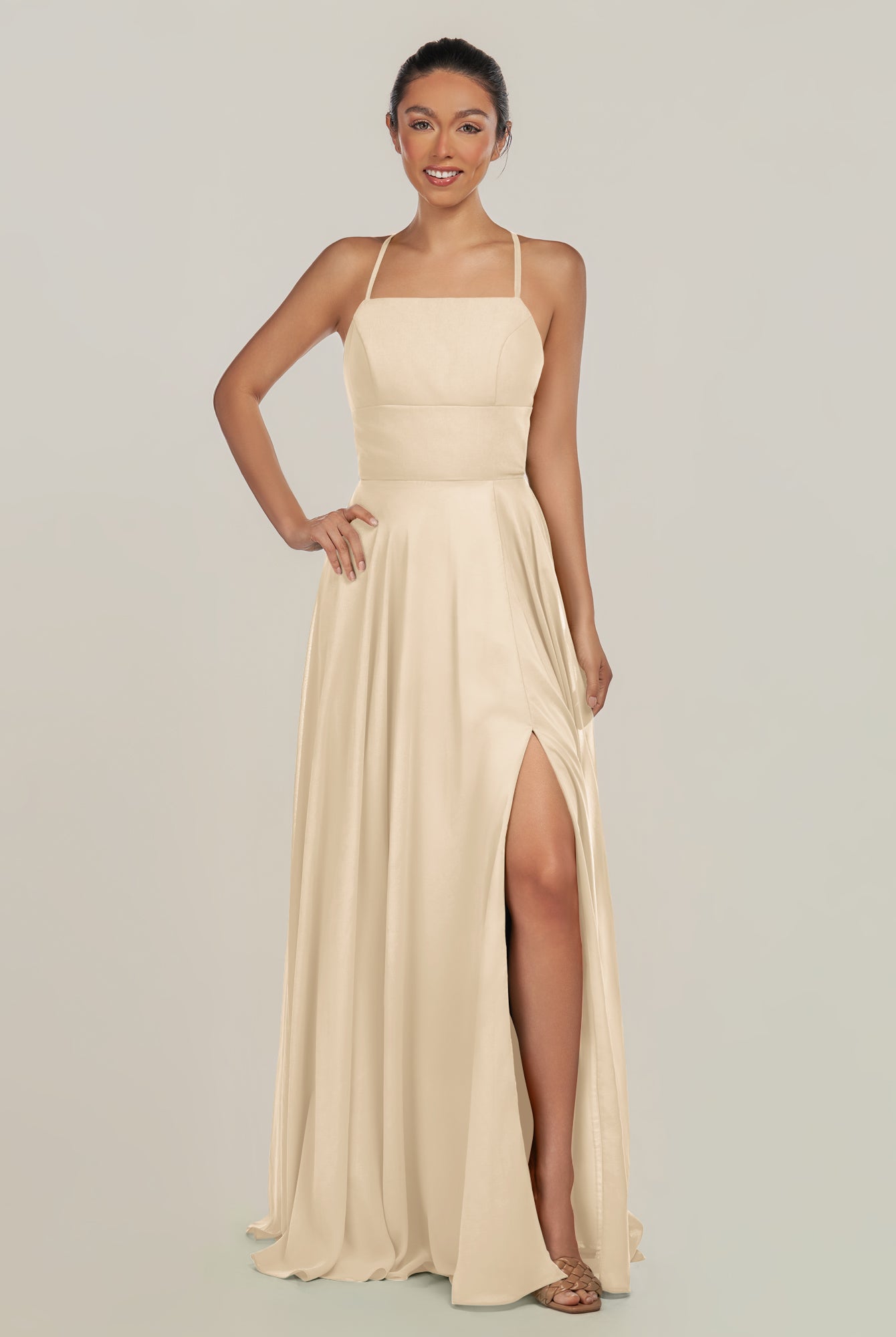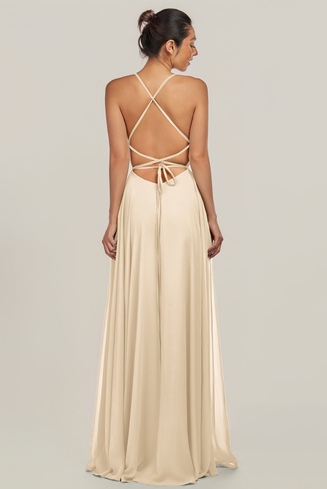 Dena | Almond - A Line Chiffon Spaghetti Straps Long Bridesmaid Dress with Slit