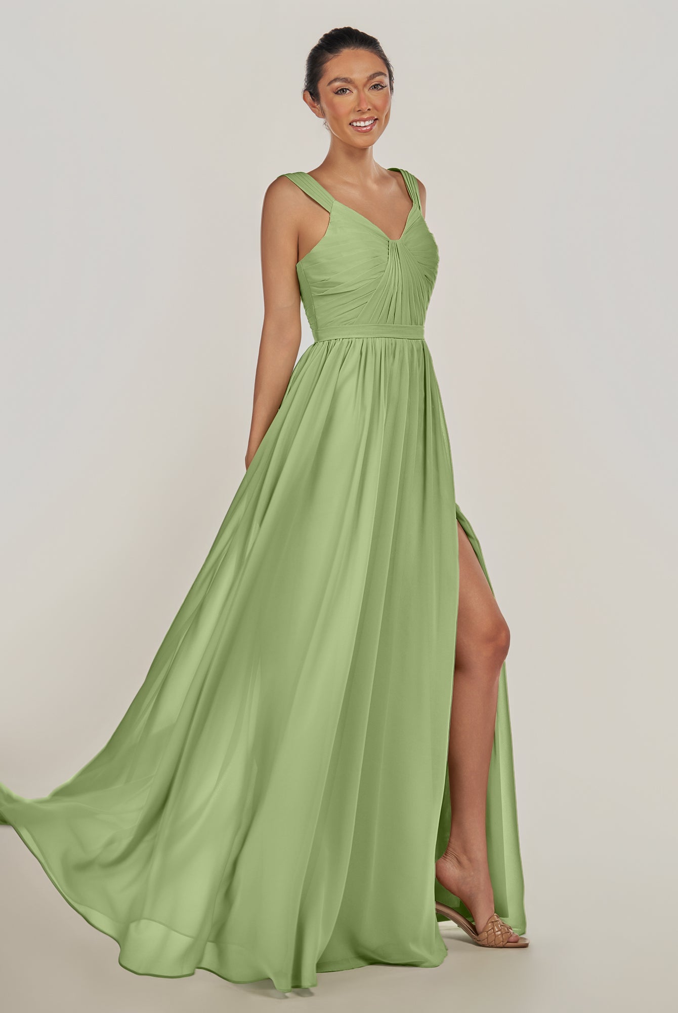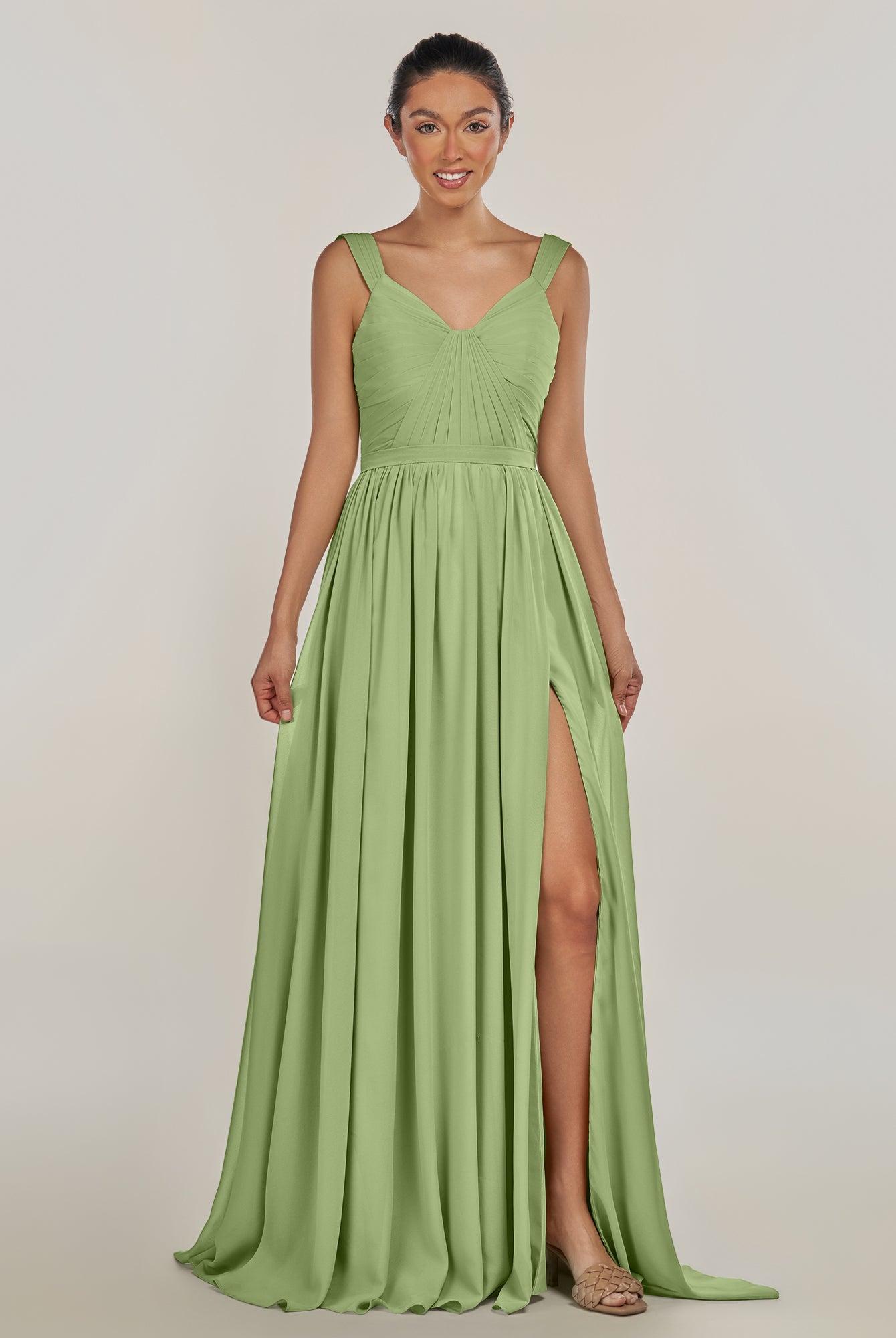 Fira | Matcha - A Line Chiffon V Neck Pleated Long Bridesmaid Dress with Slit
