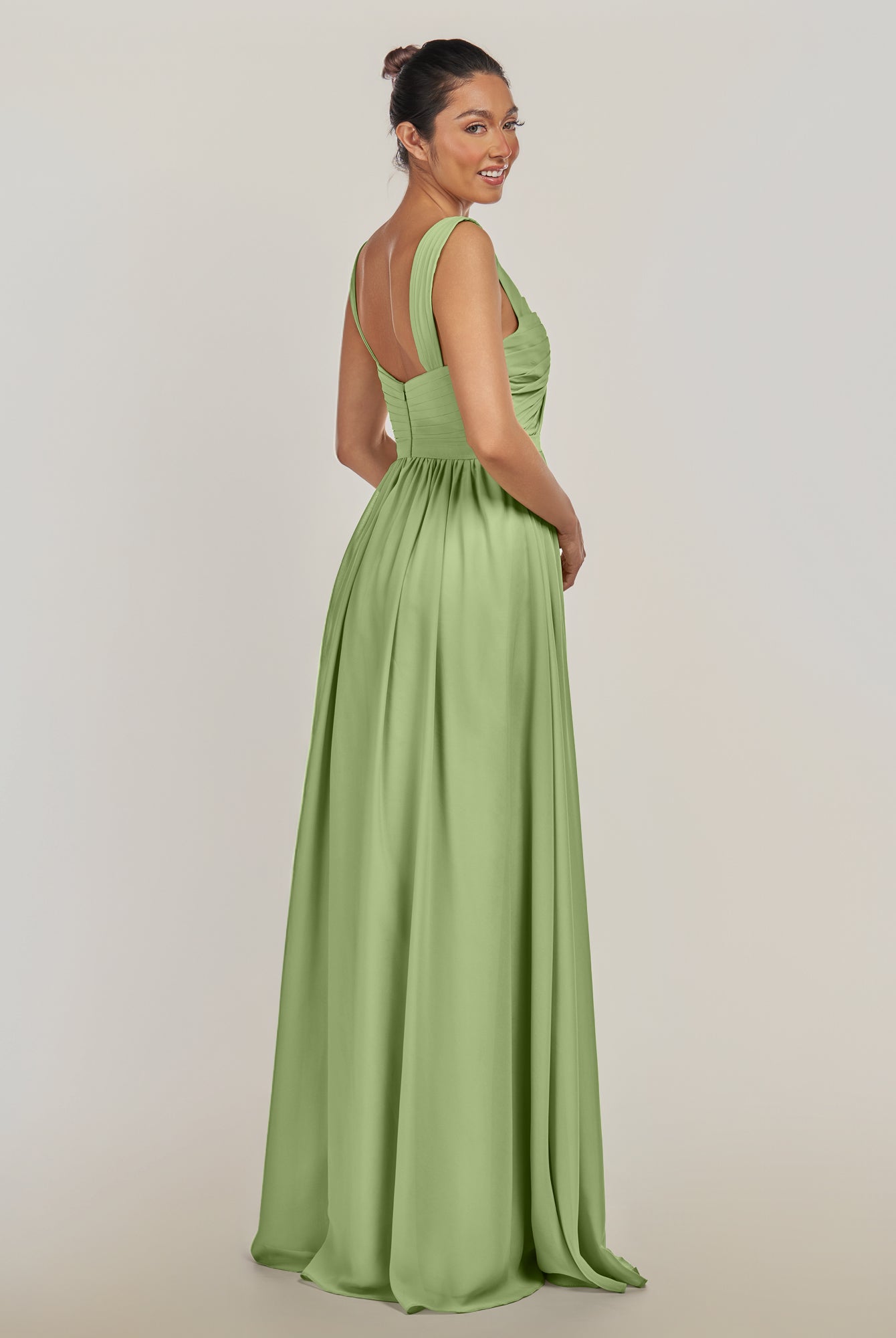 Zyria | Pale Pistachio - A Line Chiffon V Neck Ruched Long Bridesmaid Dress with Slit