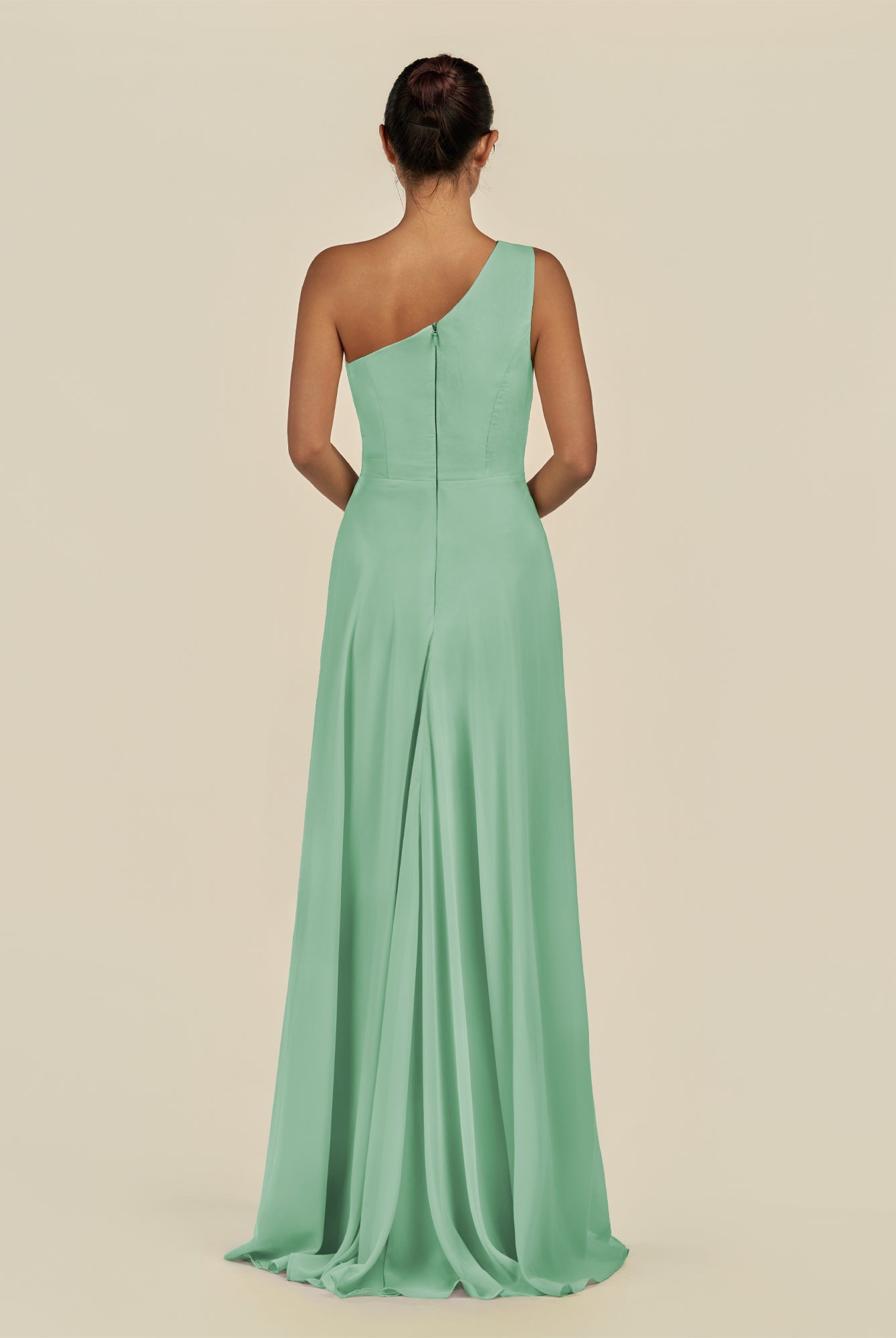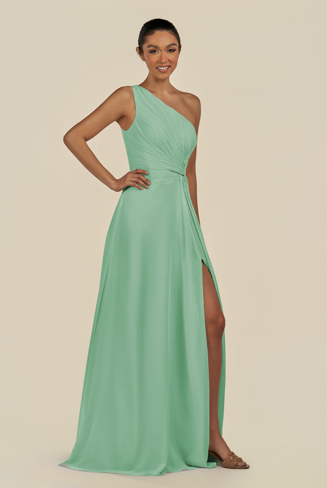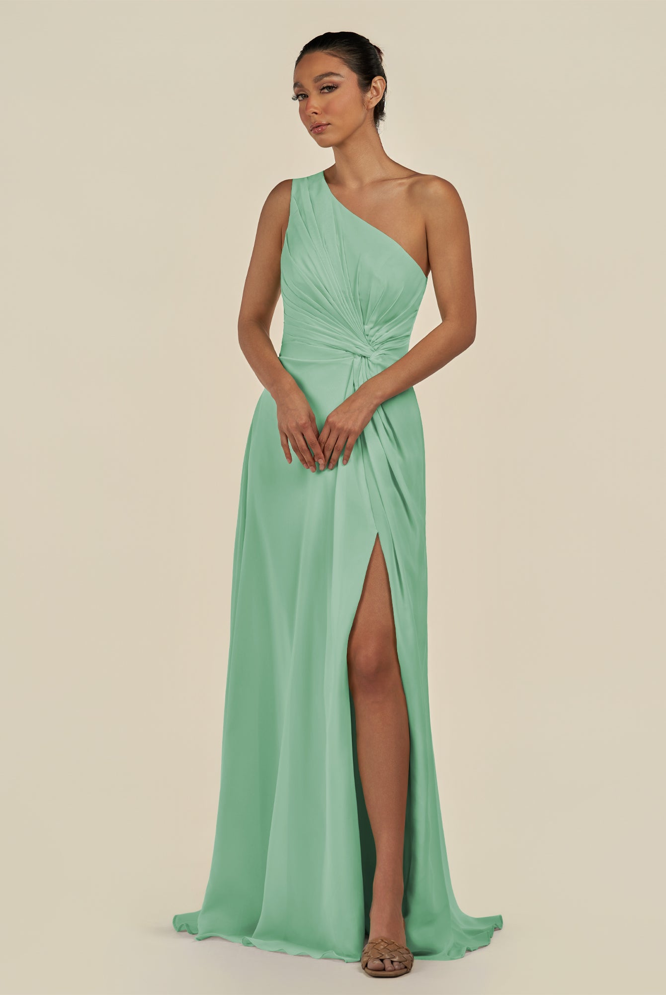 Gaela | Pale Pistachio - A Line One Shoulder Chiffon Pleated Long Bridesmaid Dress with Slit