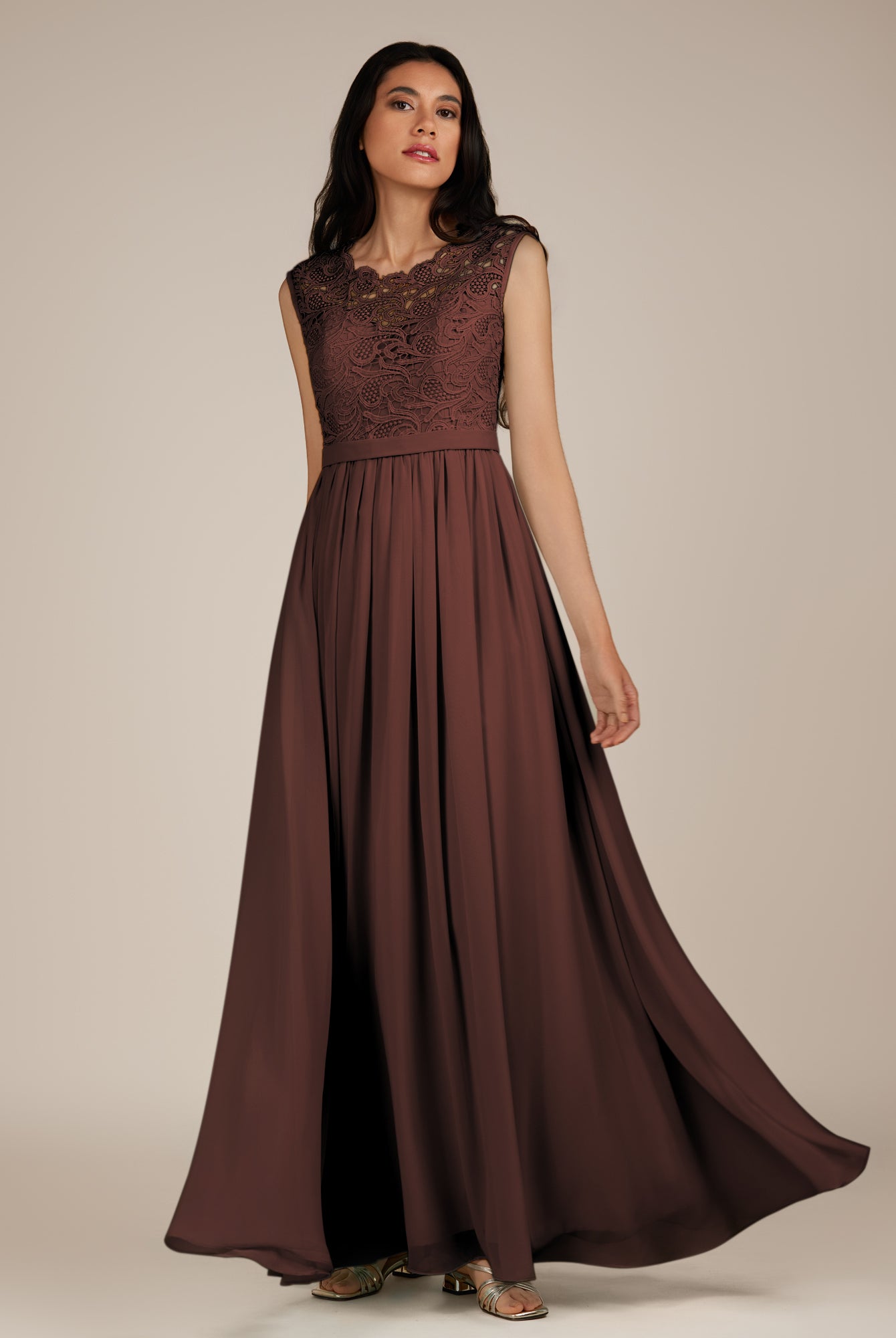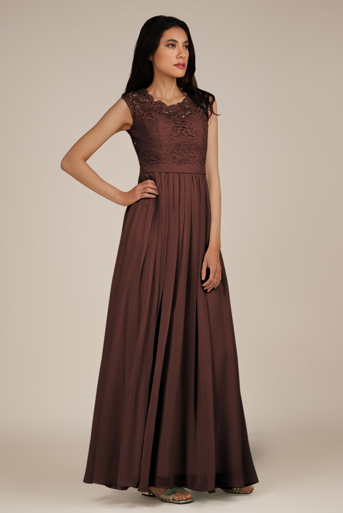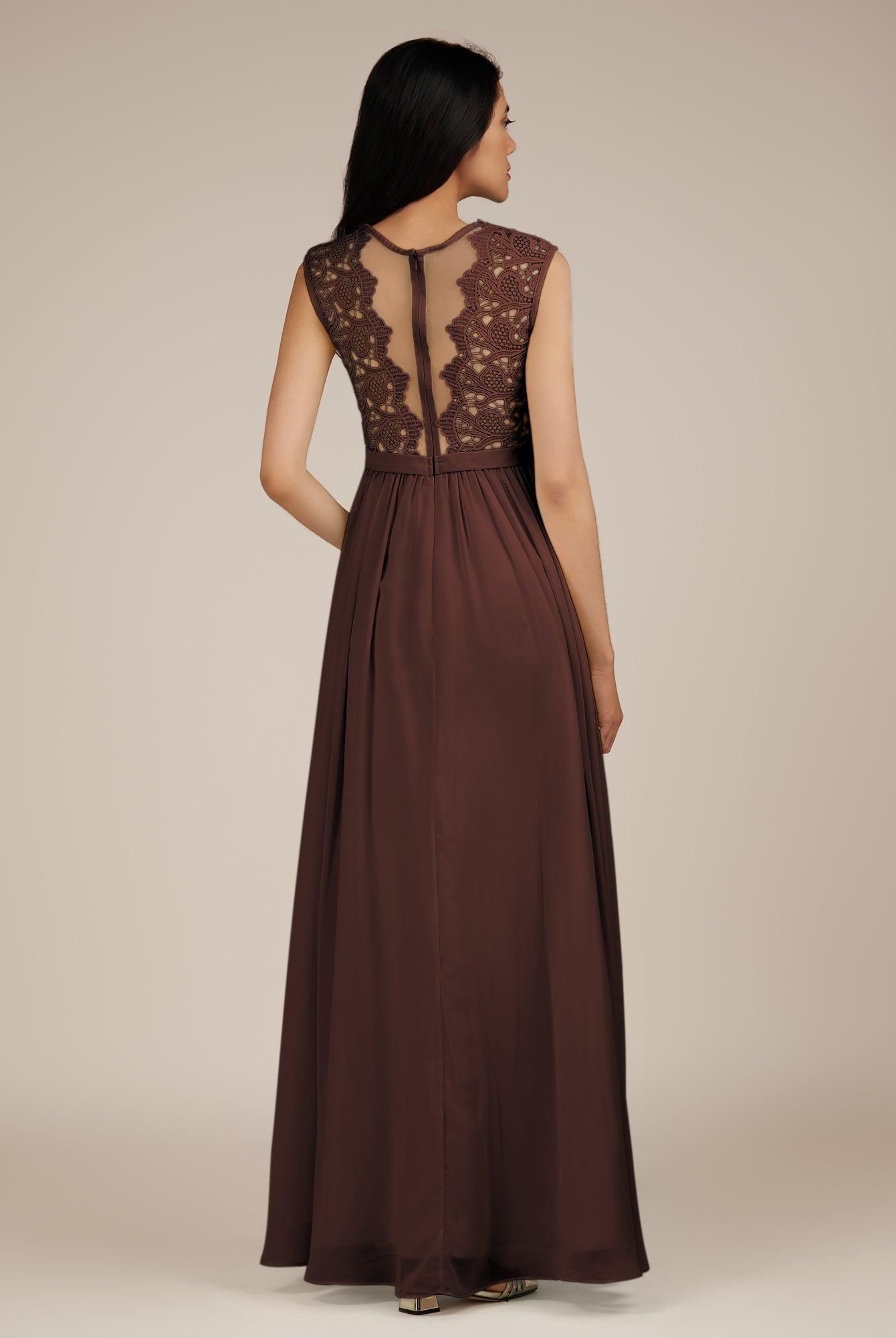 Niamh | Espresso - A Line Illusion Neck Chiffon Long Bridesmaid Dress