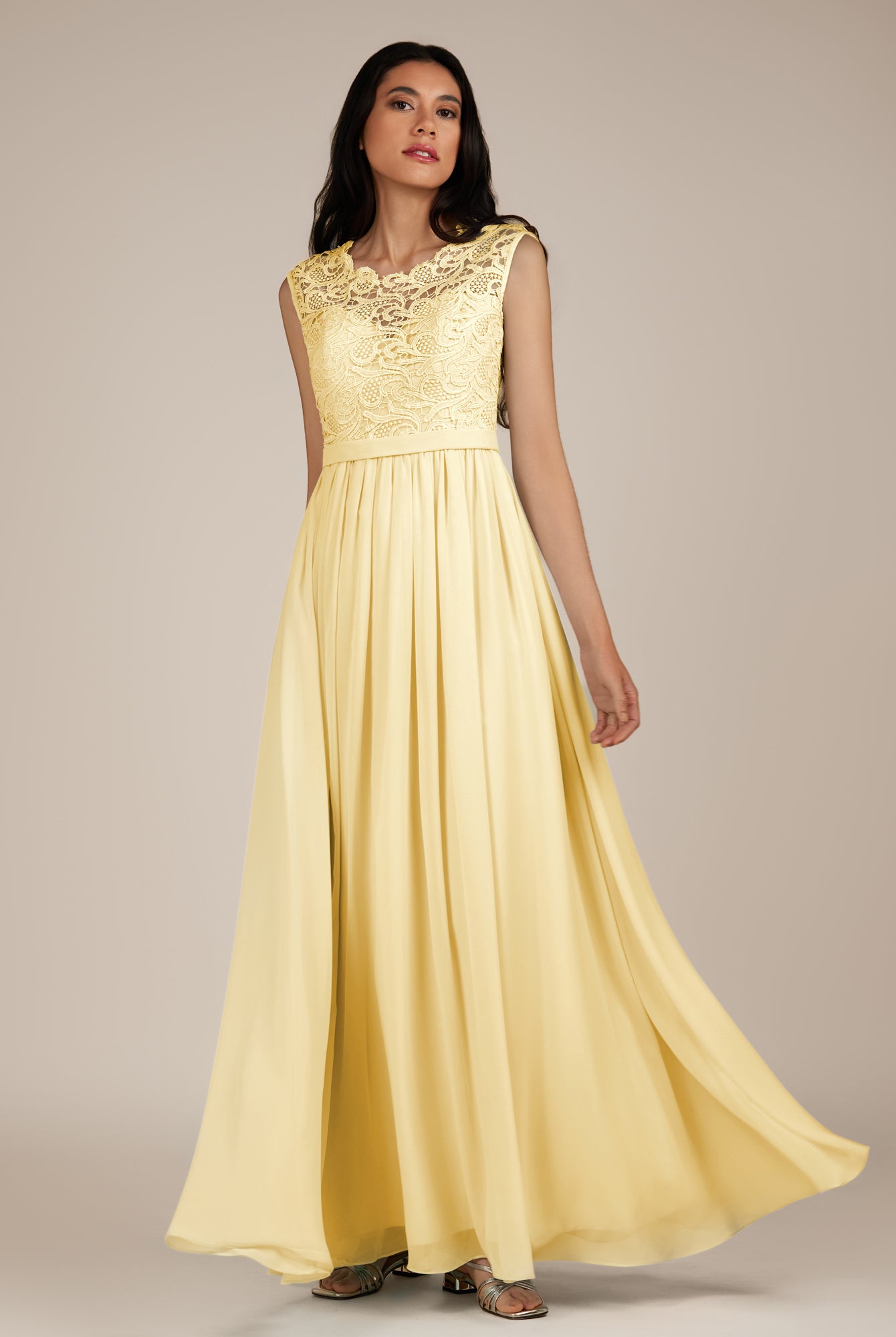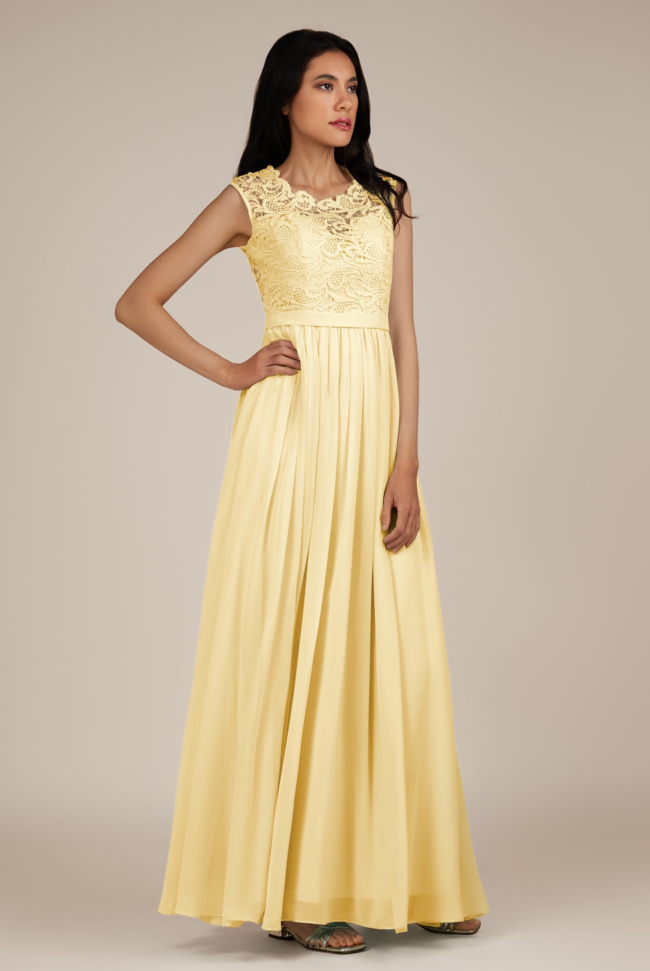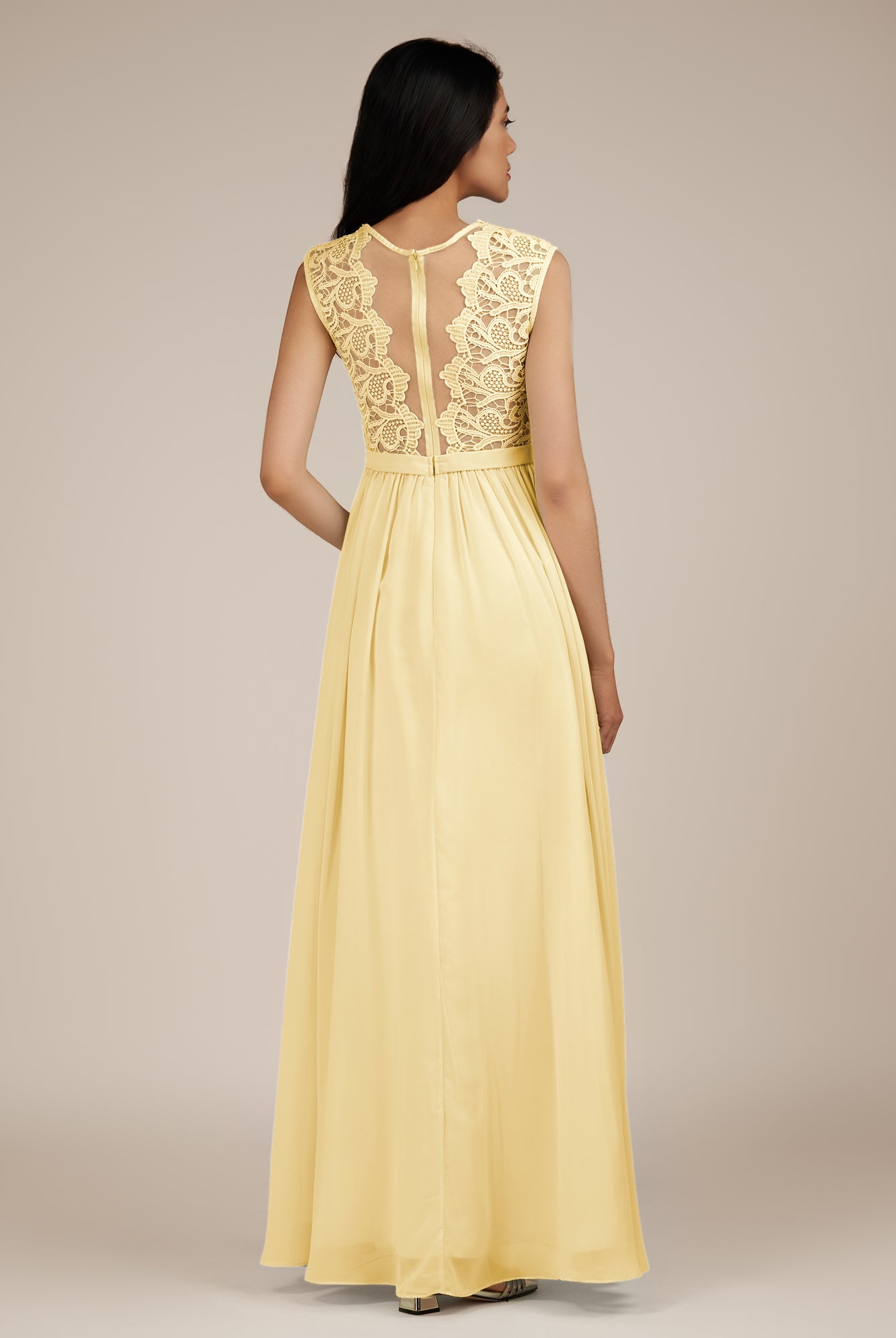 Niamh | Pastel Yellow - A Line Illusion Neck Chiffon Long Bridesmaid Dress