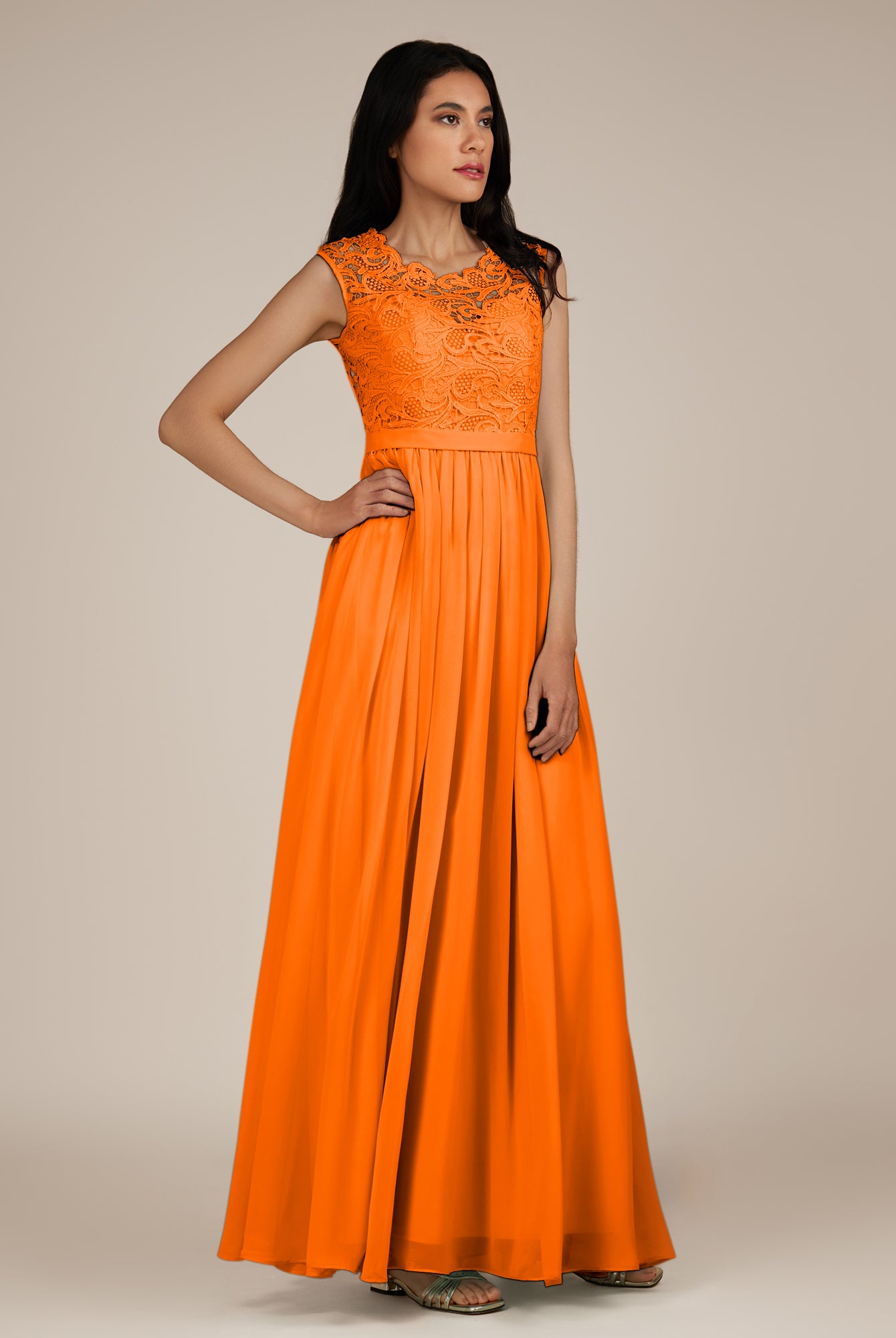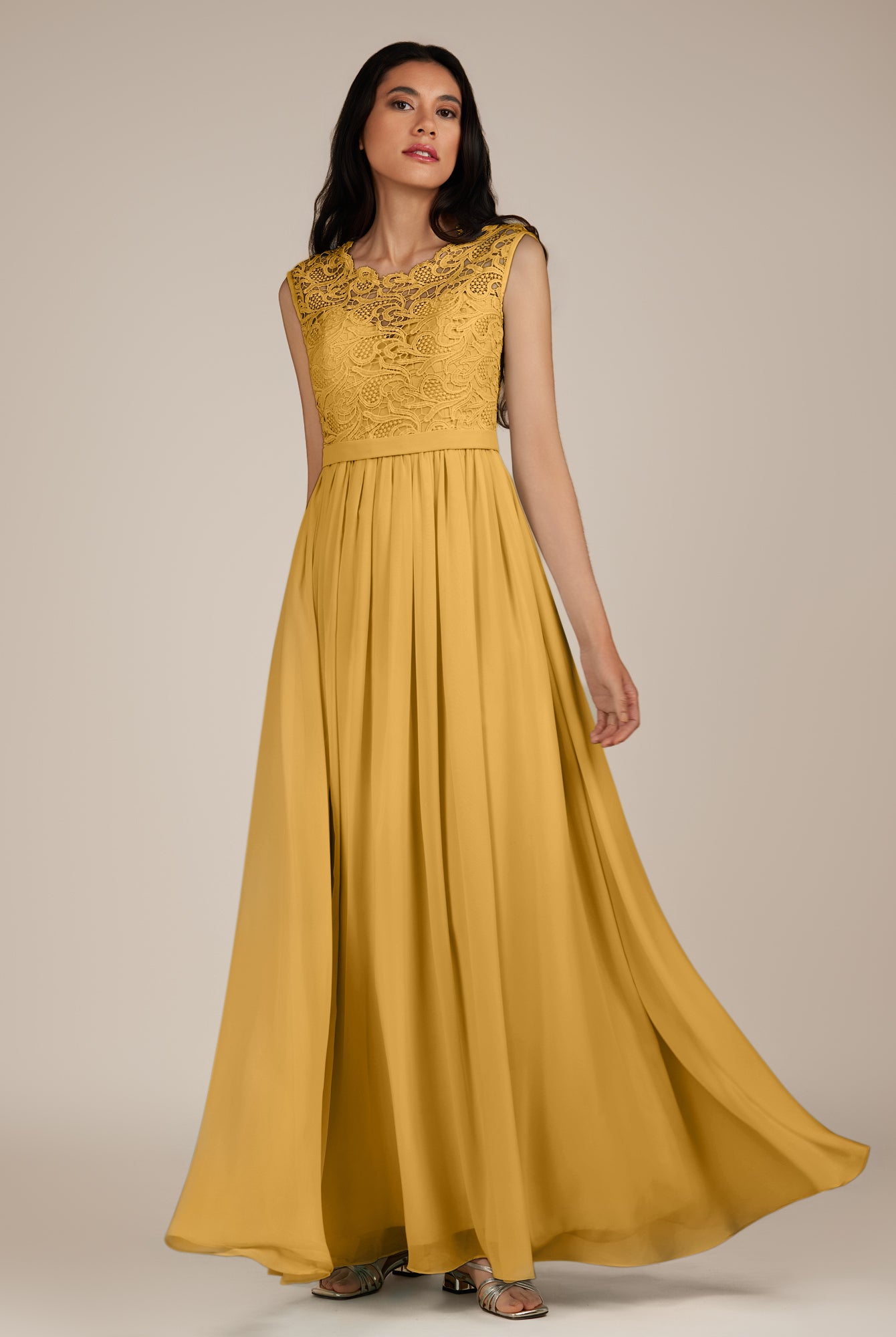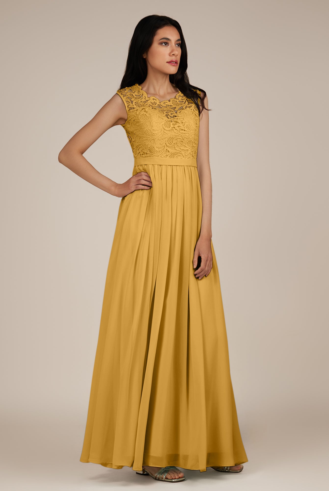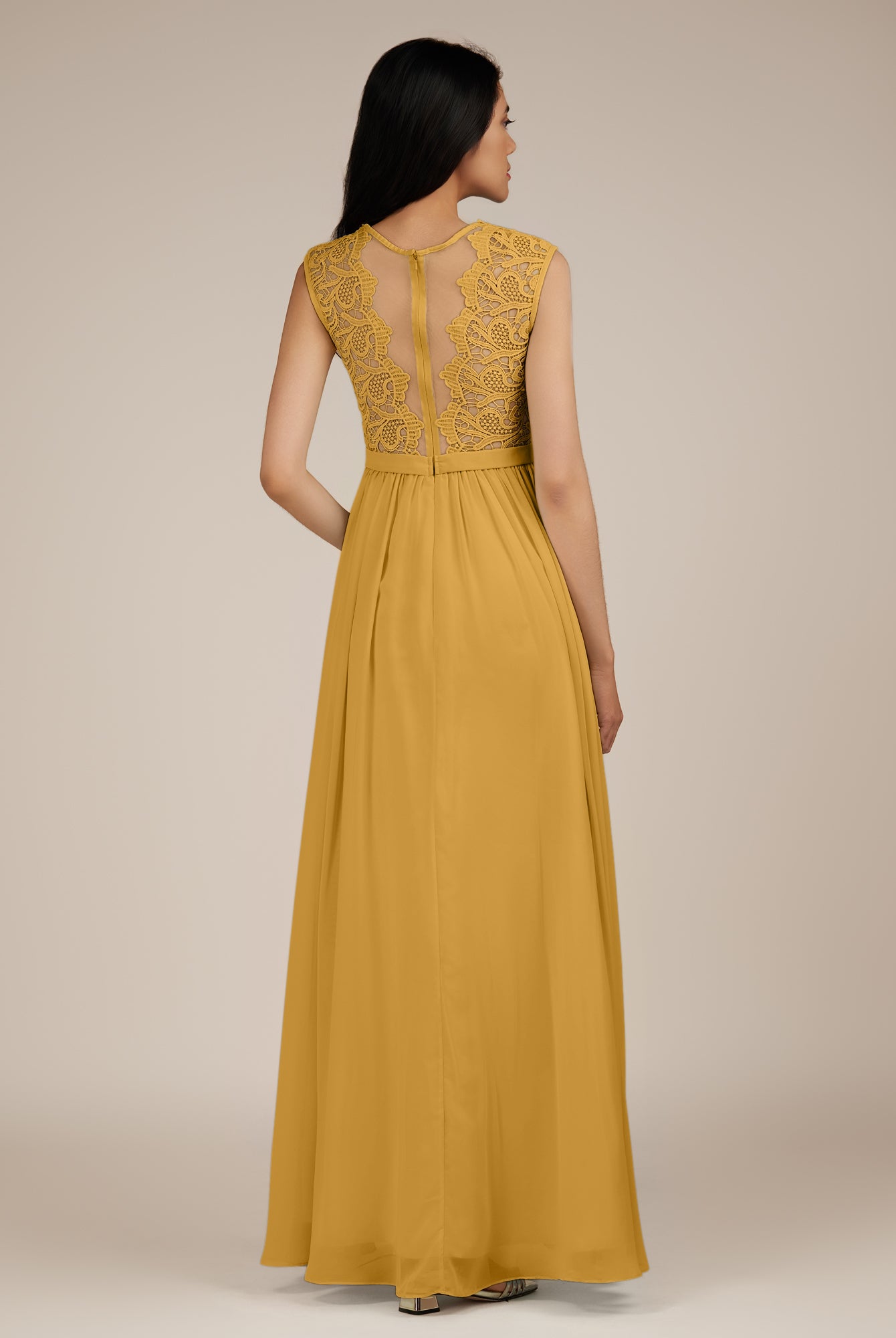 Niamh | Marigold - A Line Illusion Neck Chiffon Long Bridesmaid Dress