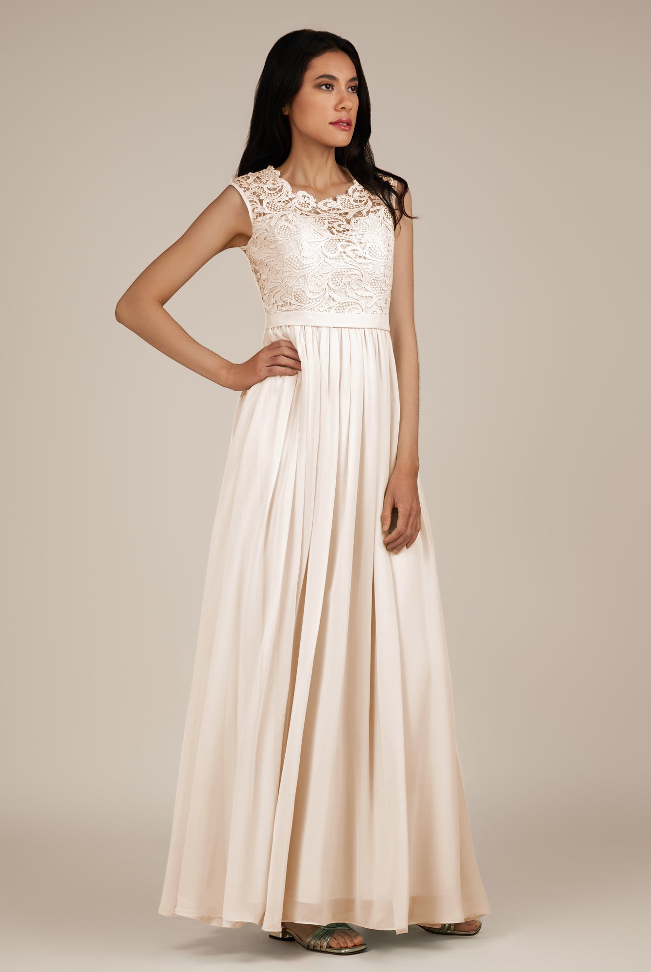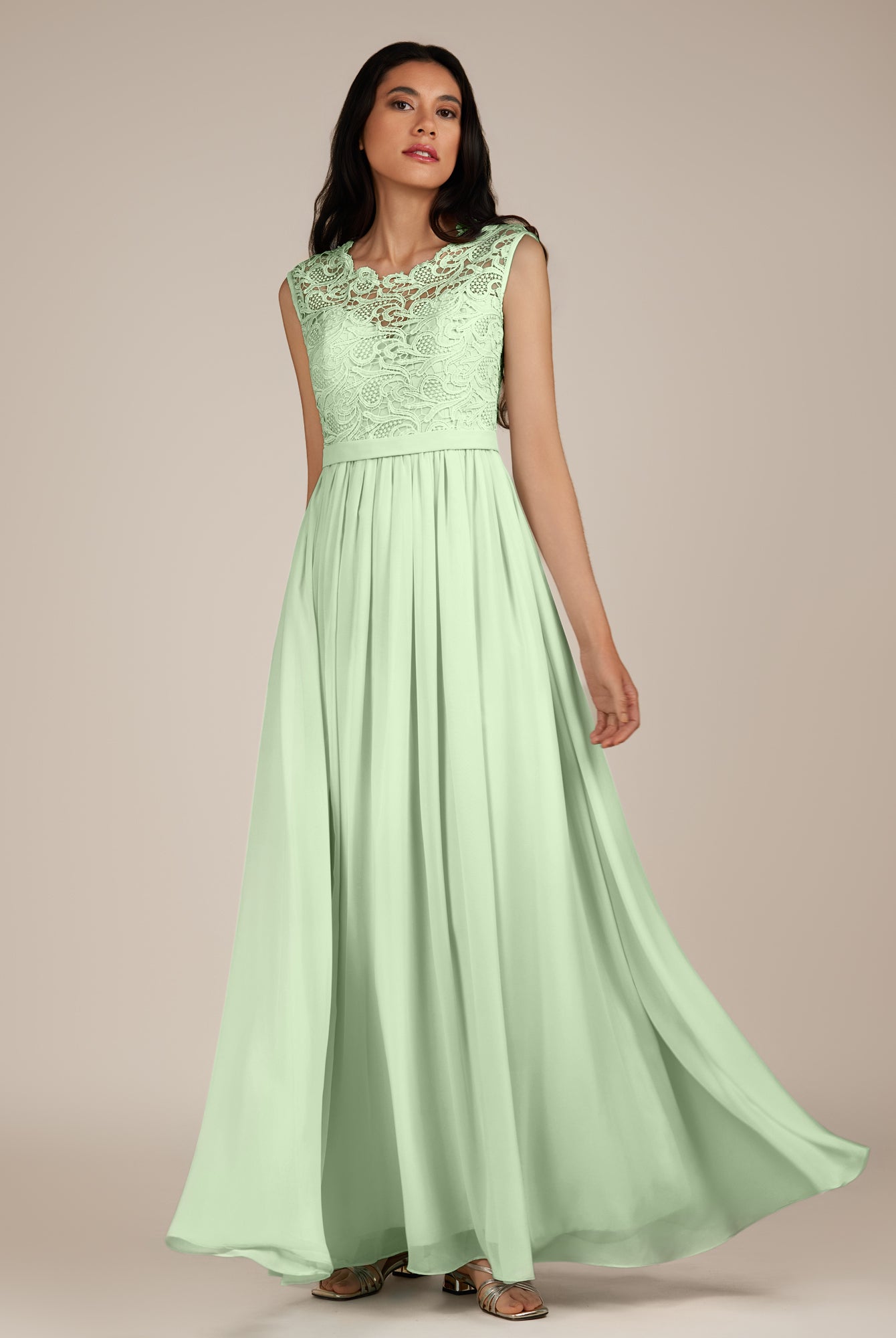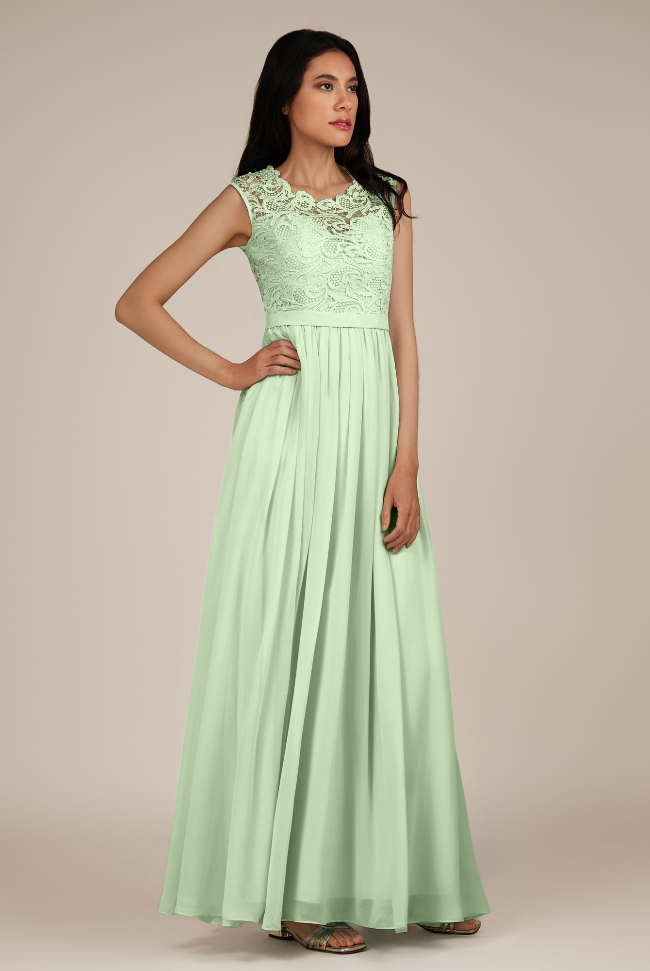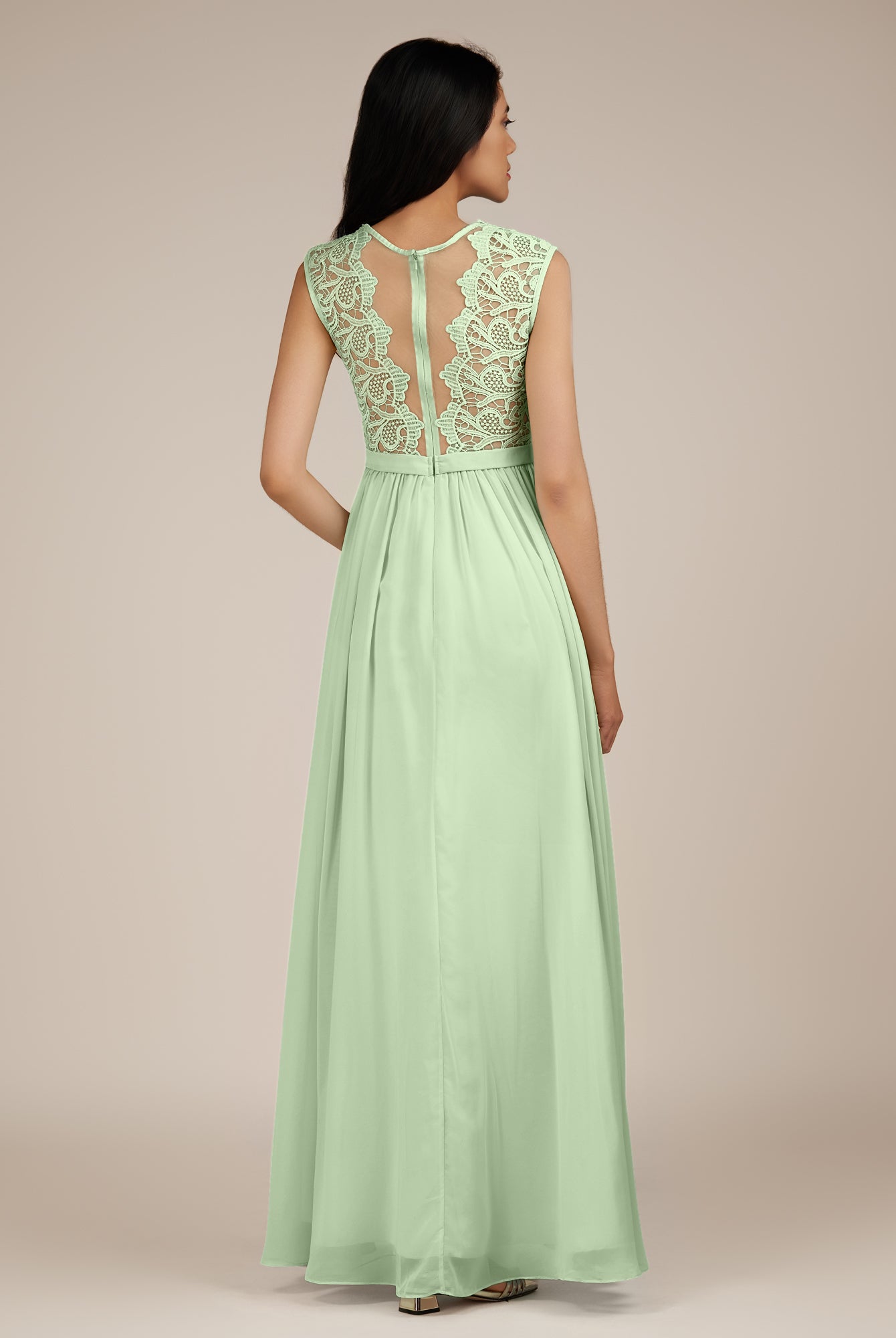 Niamh | Sage - A Line Illusion Neck Chiffon Long Bridesmaid Dress