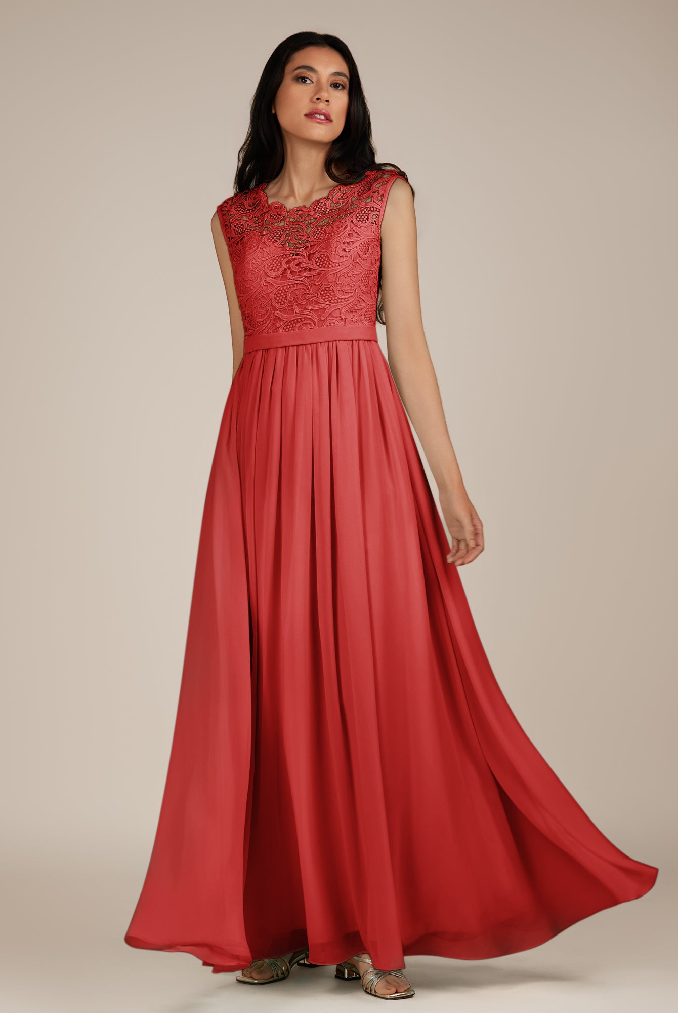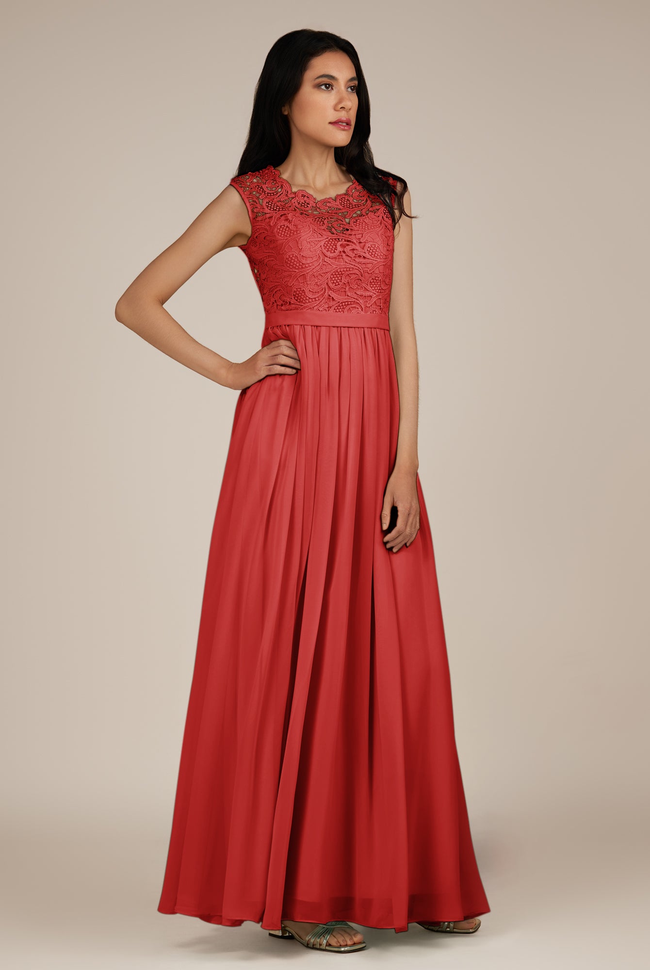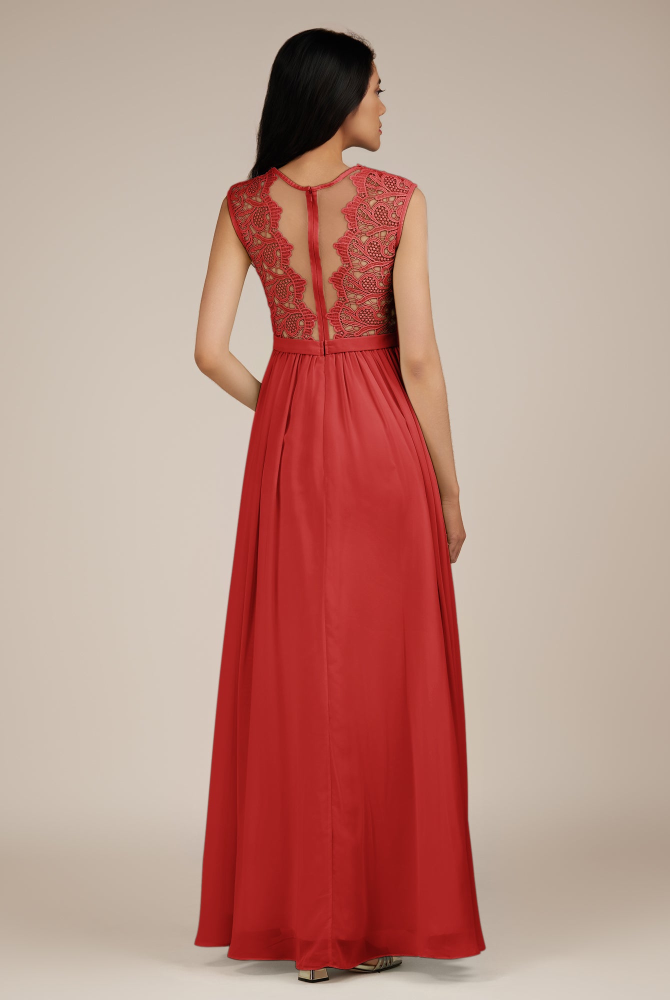 Niamh | Ruby Red - A Line Illusion Neck Chiffon Long Bridesmaid Dress