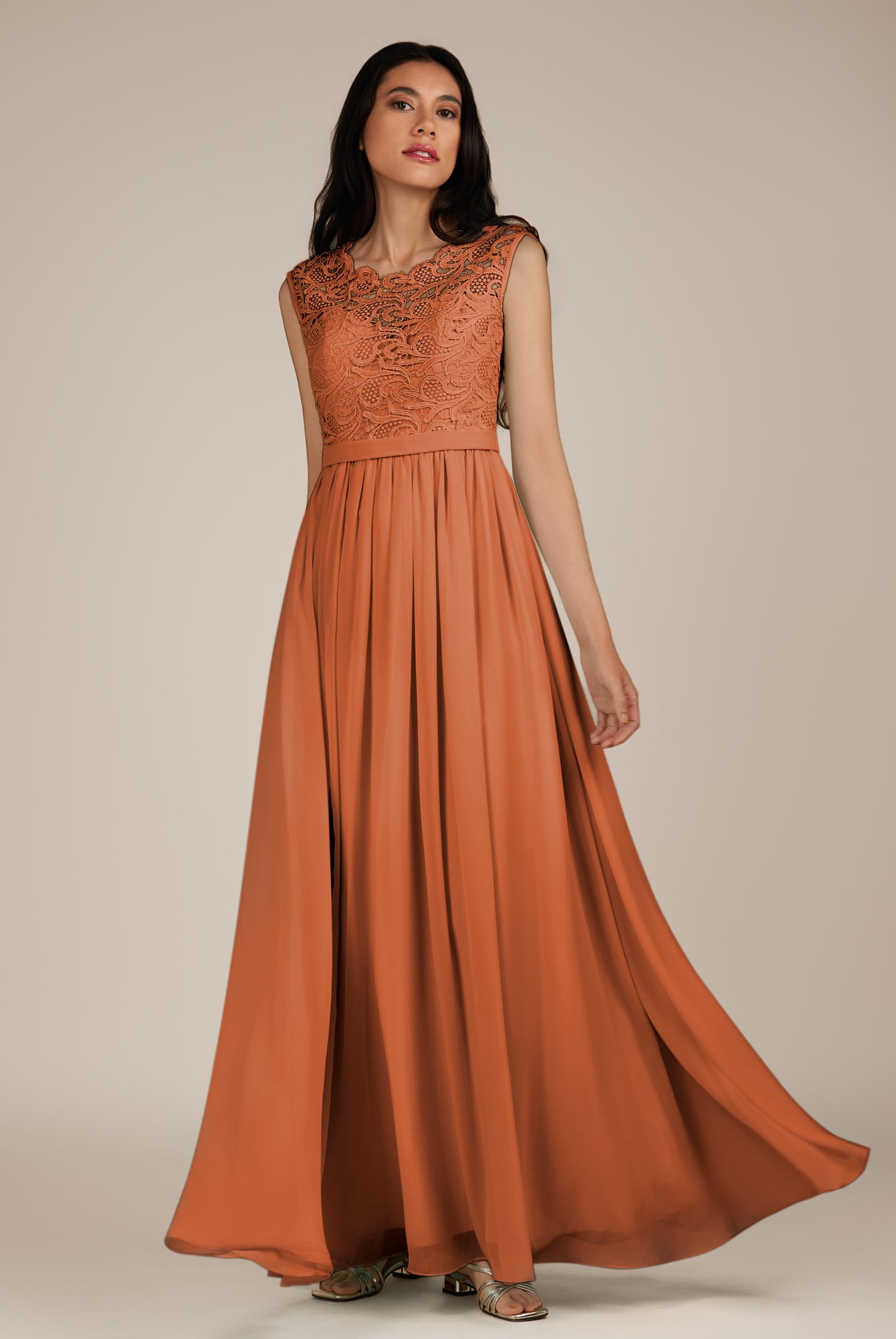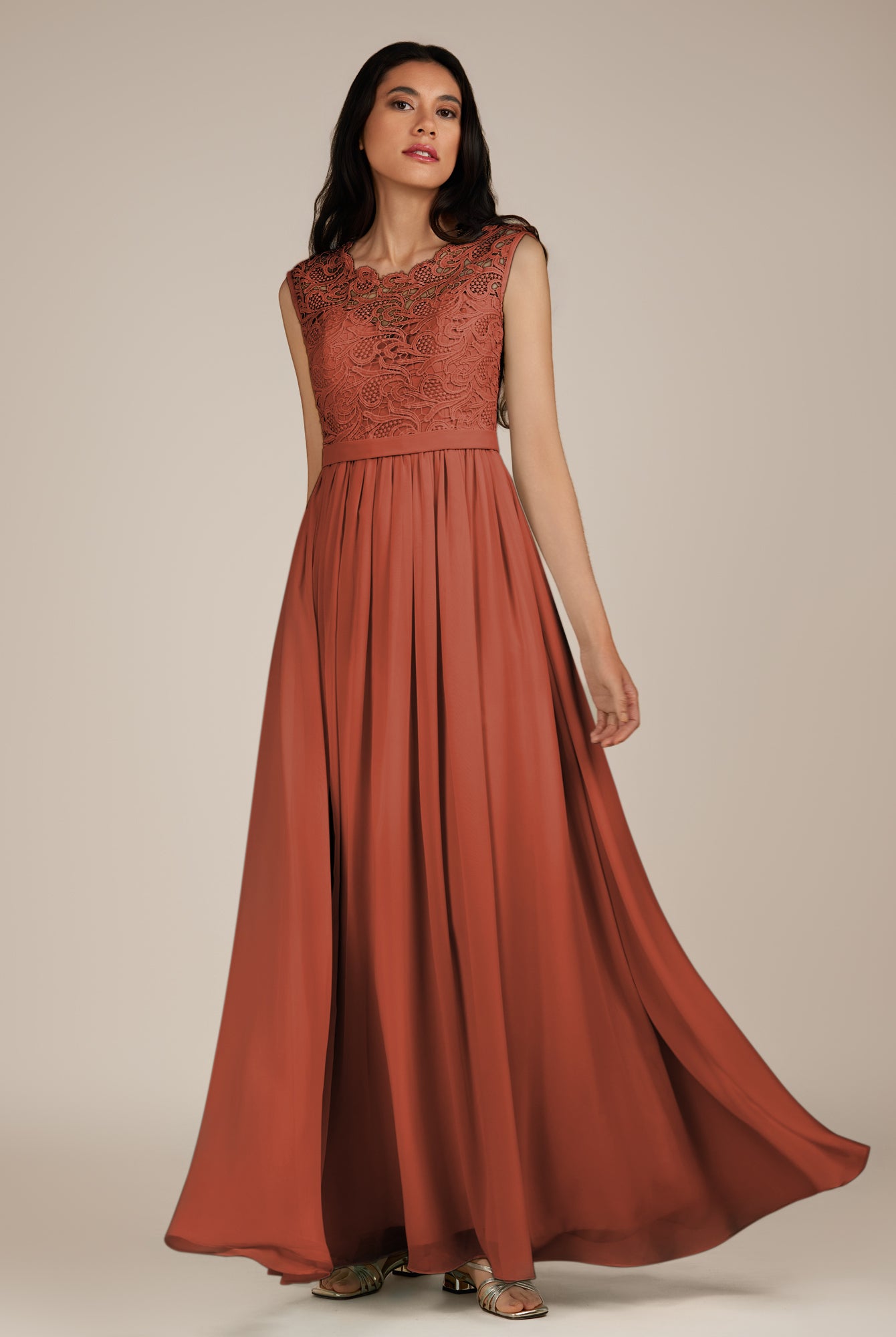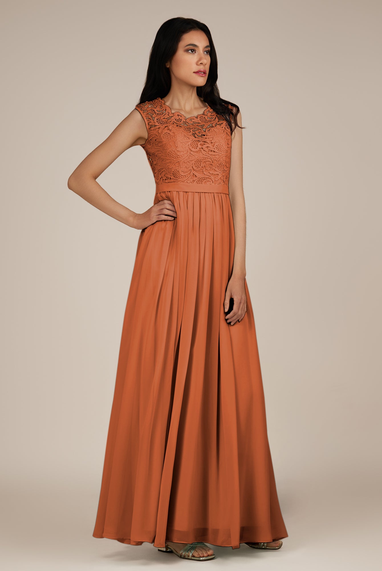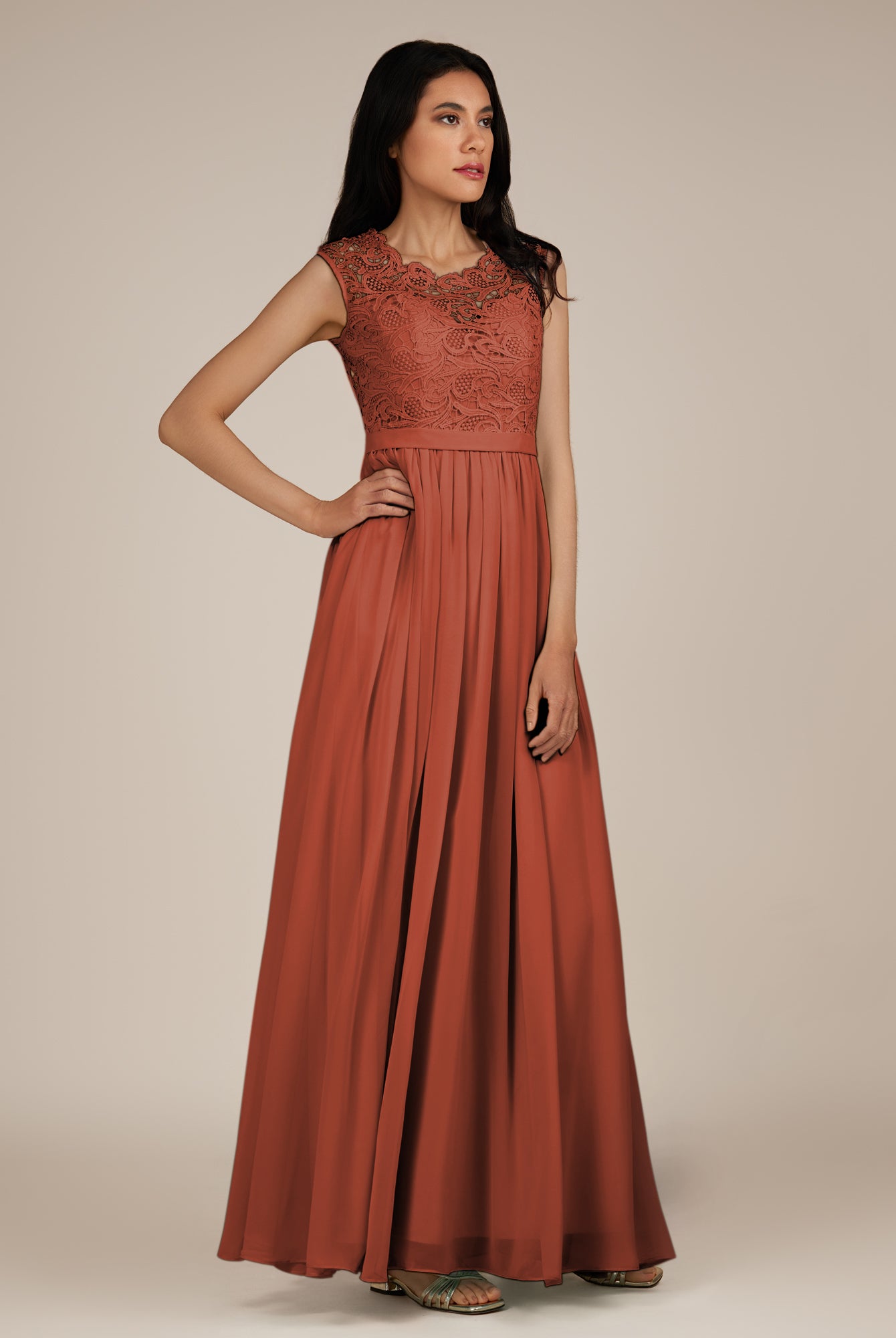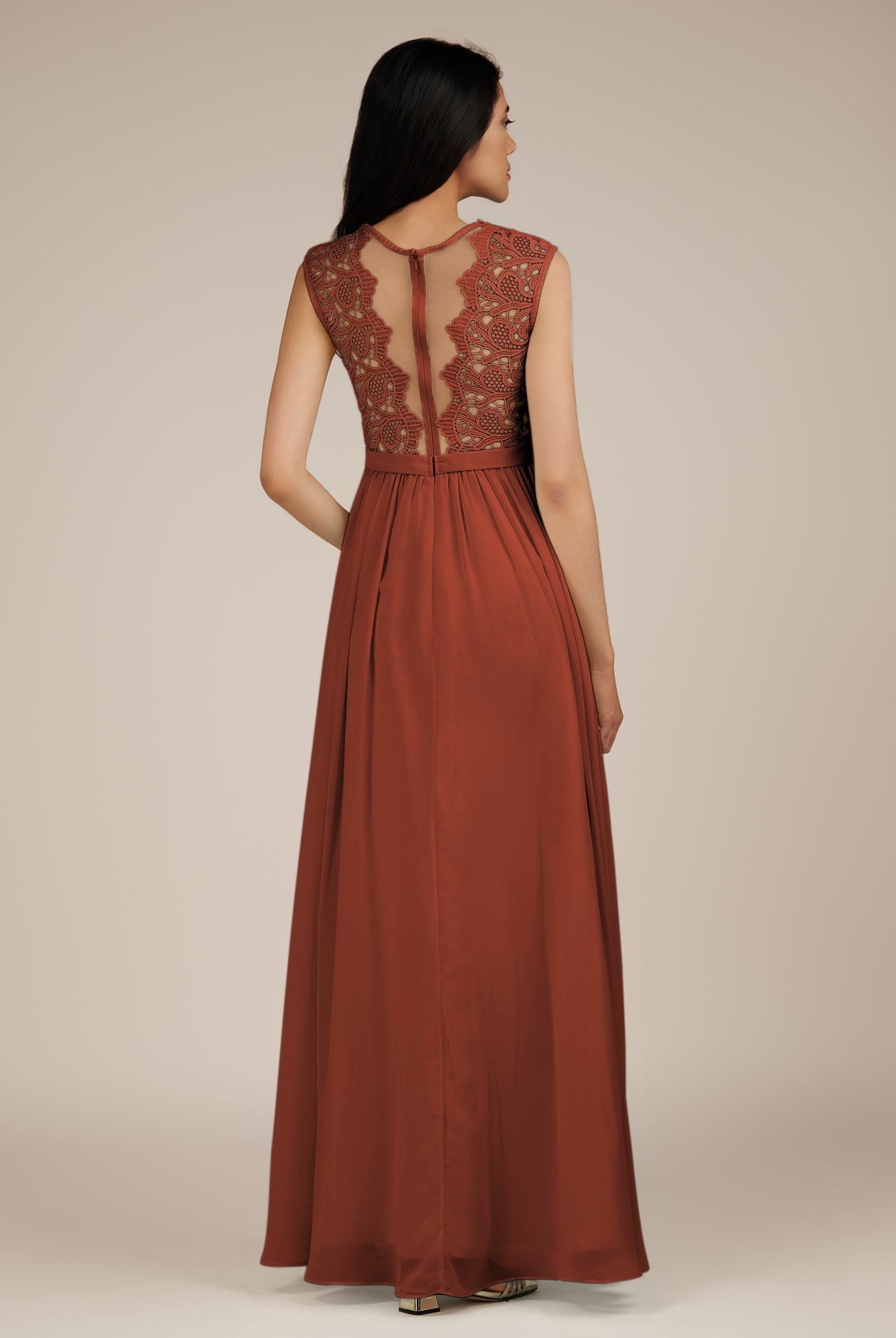 Niamh | Terracotta - A Line Illusion Neck Chiffon Long Bridesmaid Dress