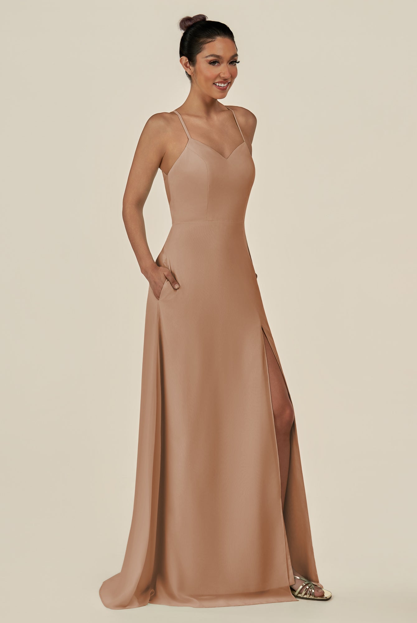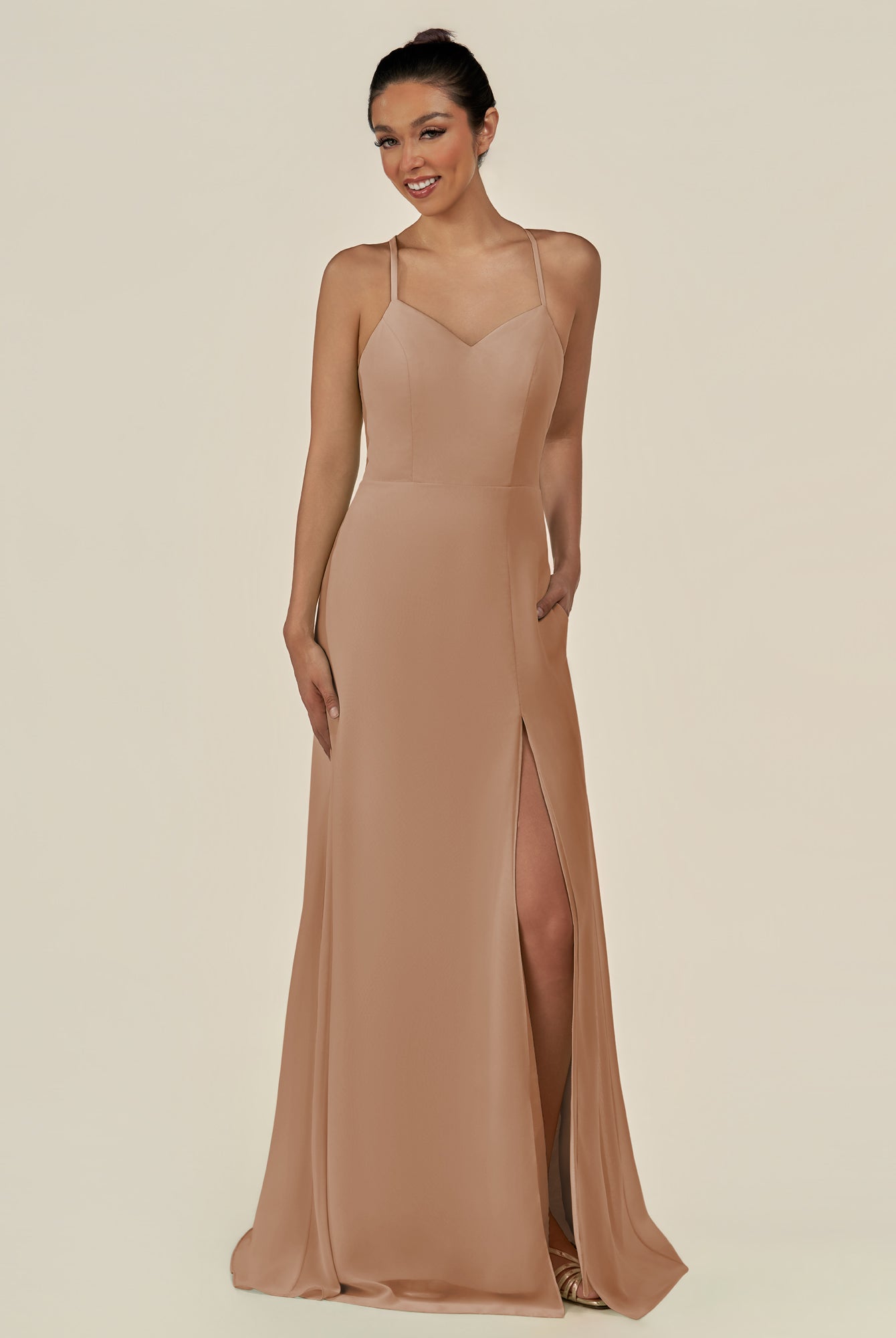 Cerin | Toffee - Sheath V Neck Chiffon Long Bridesmaid Dress with Slit