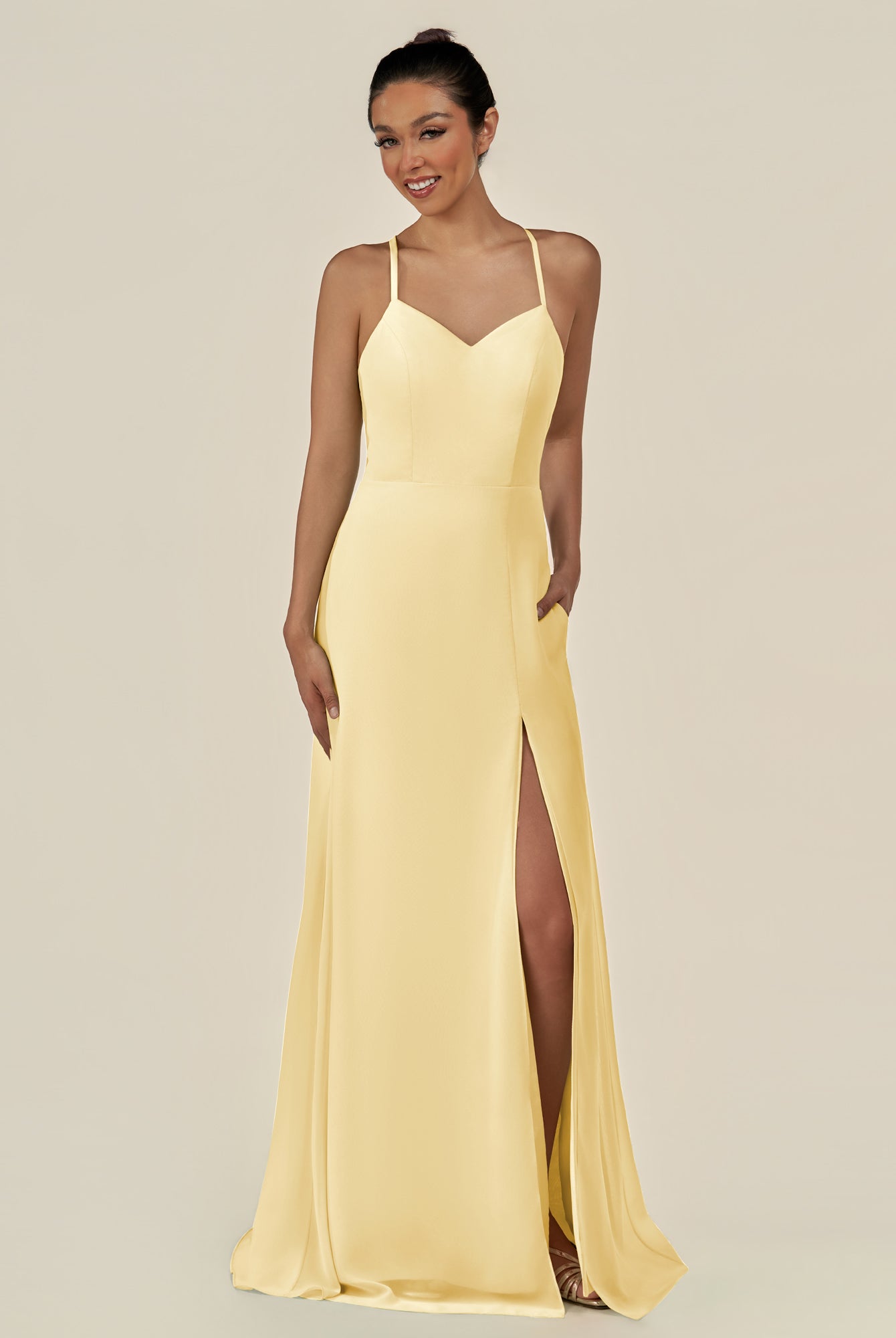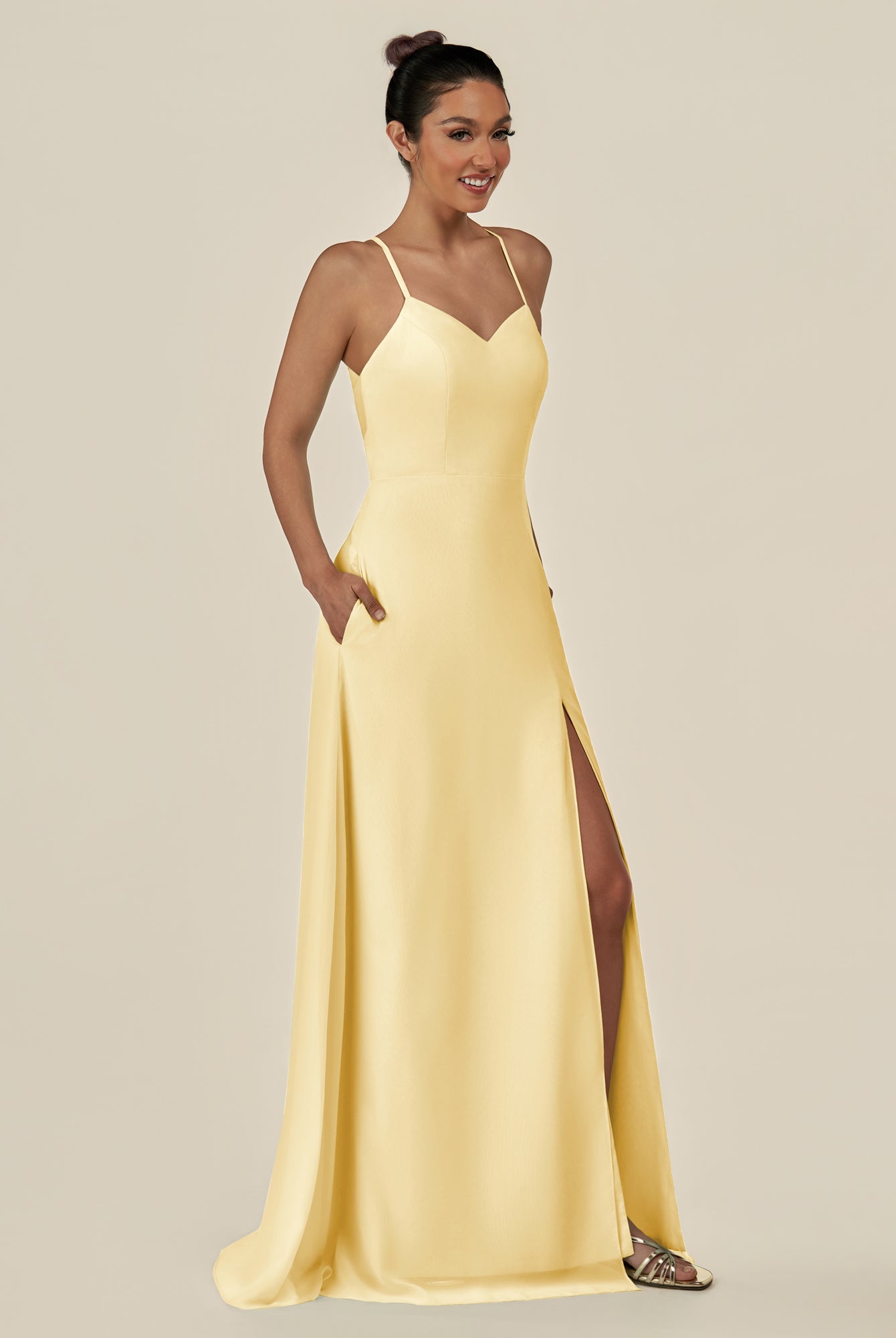 Cerin | Pastel Yellow - Sheath V Neck Chiffon Long Bridesmaid Dress with Slit