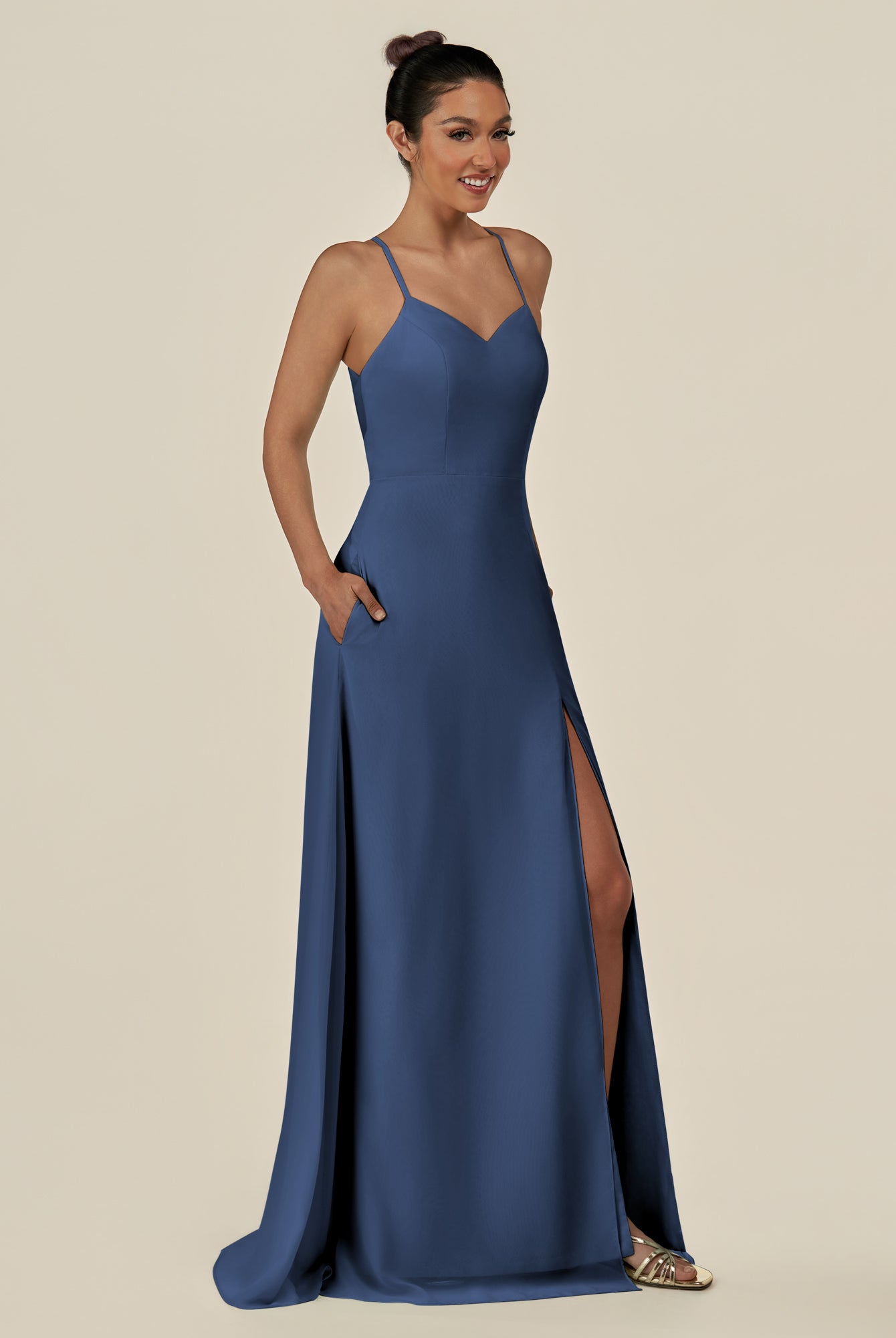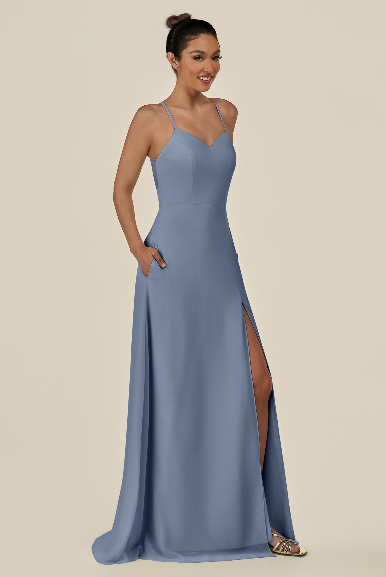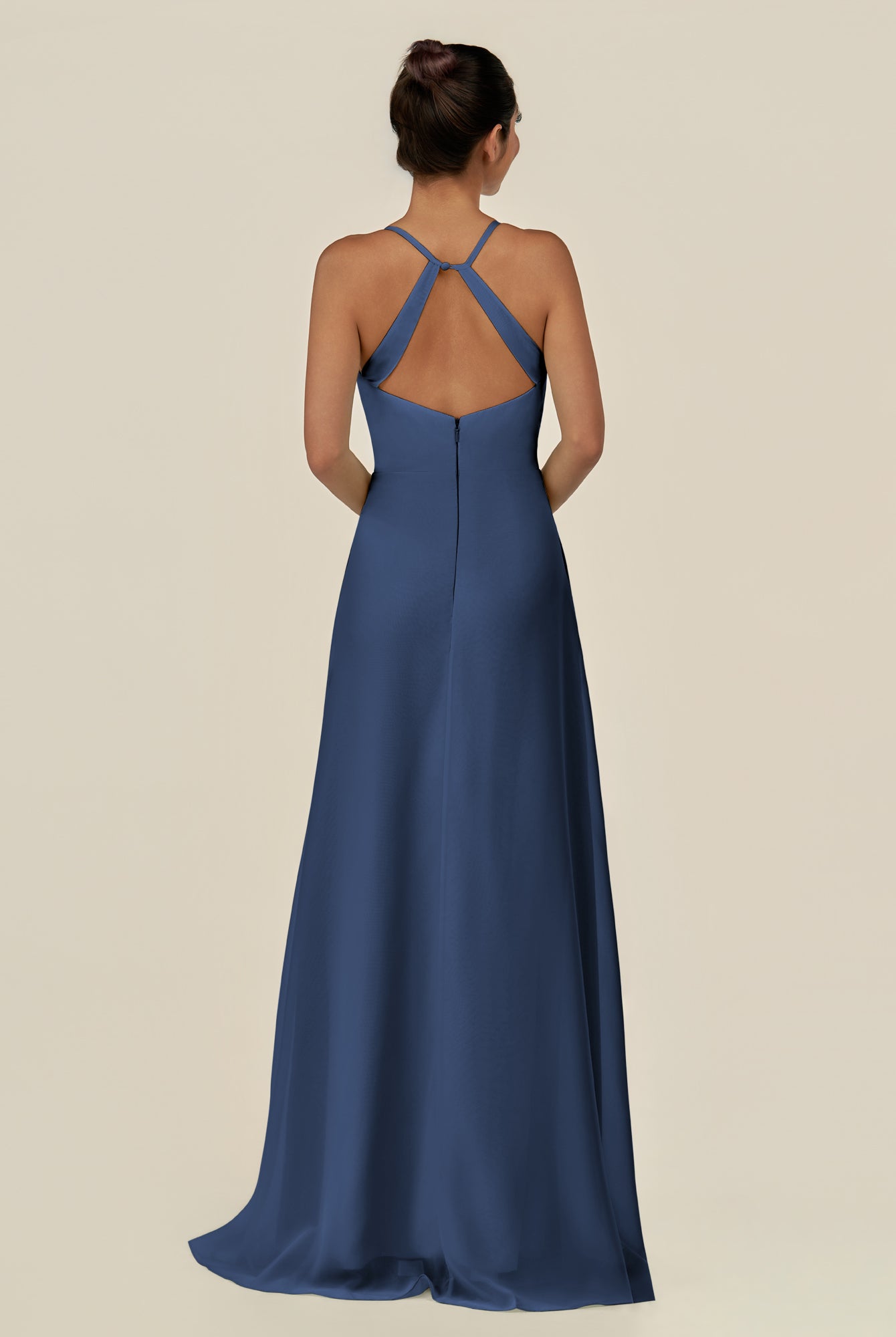 Cerin | Blue Jay - Sheath V Neck Chiffon Long Bridesmaid Dress with Slit