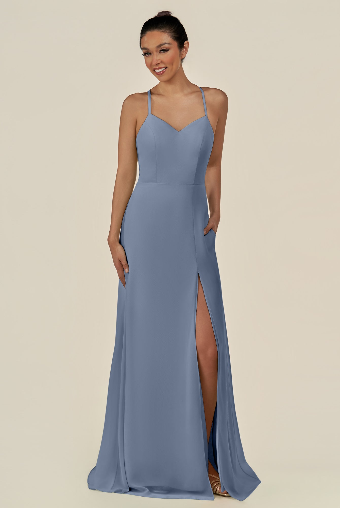 Cerin | Steel Blue - Sheath V Neck Chiffon Long Bridesmaid Dress with Slit