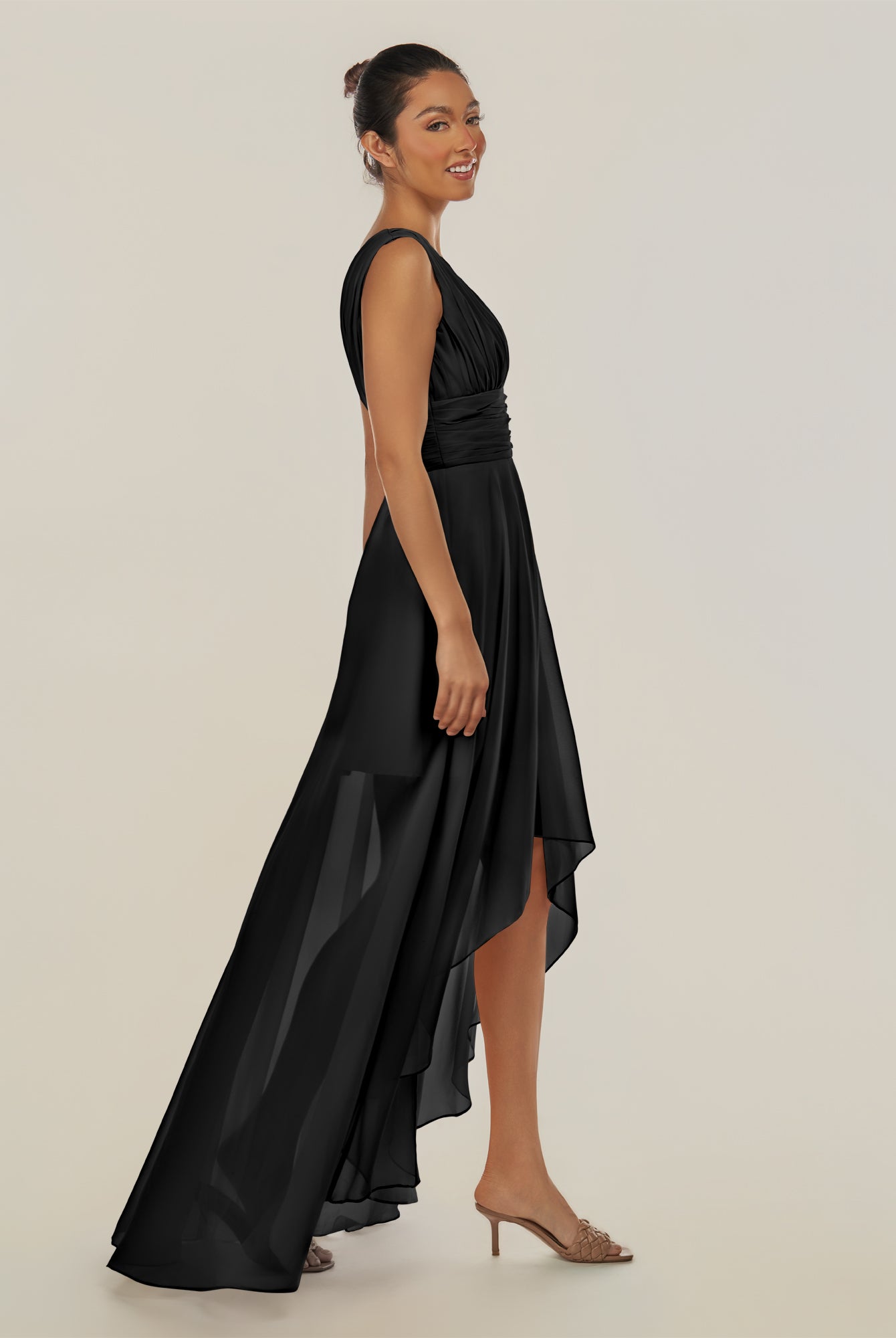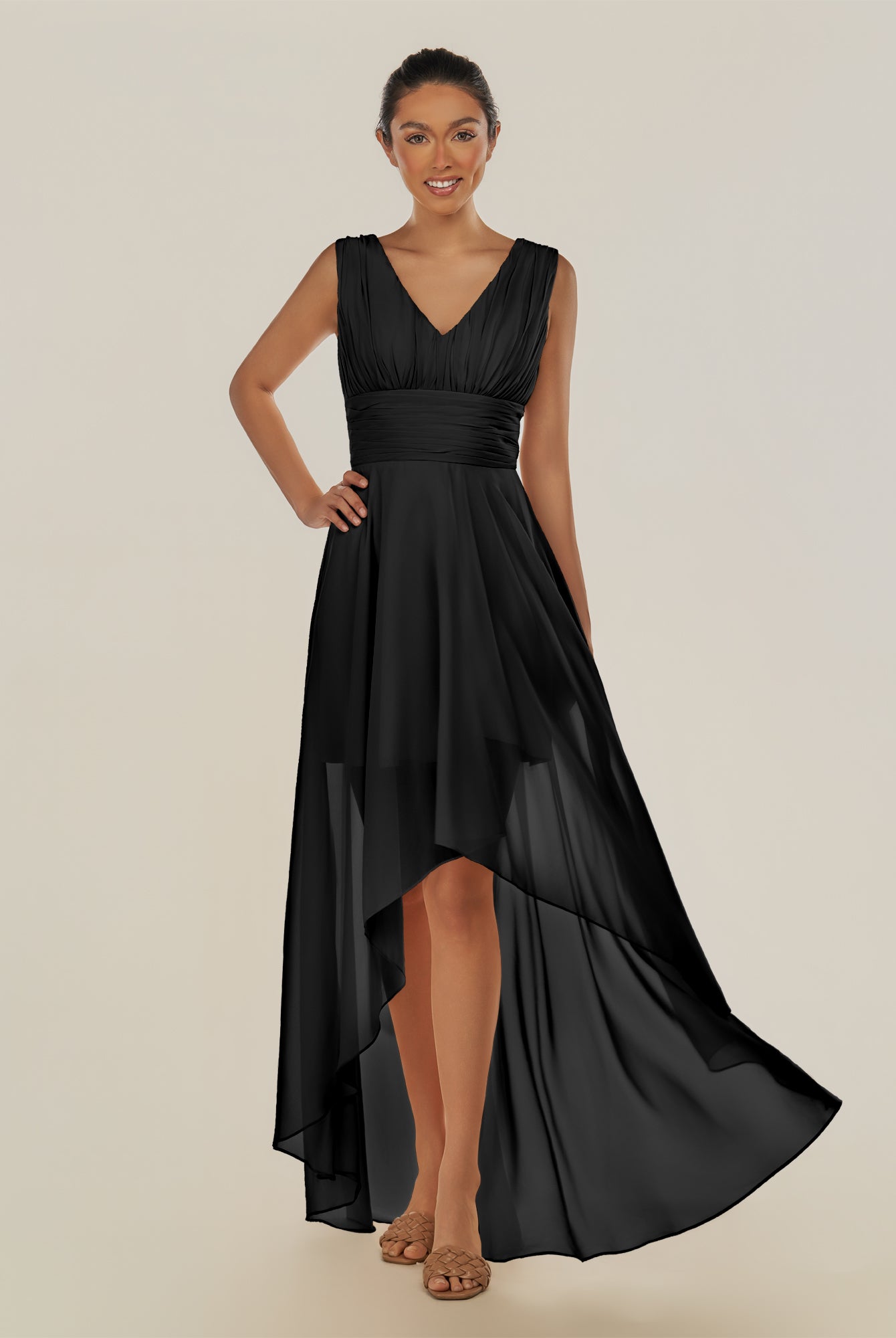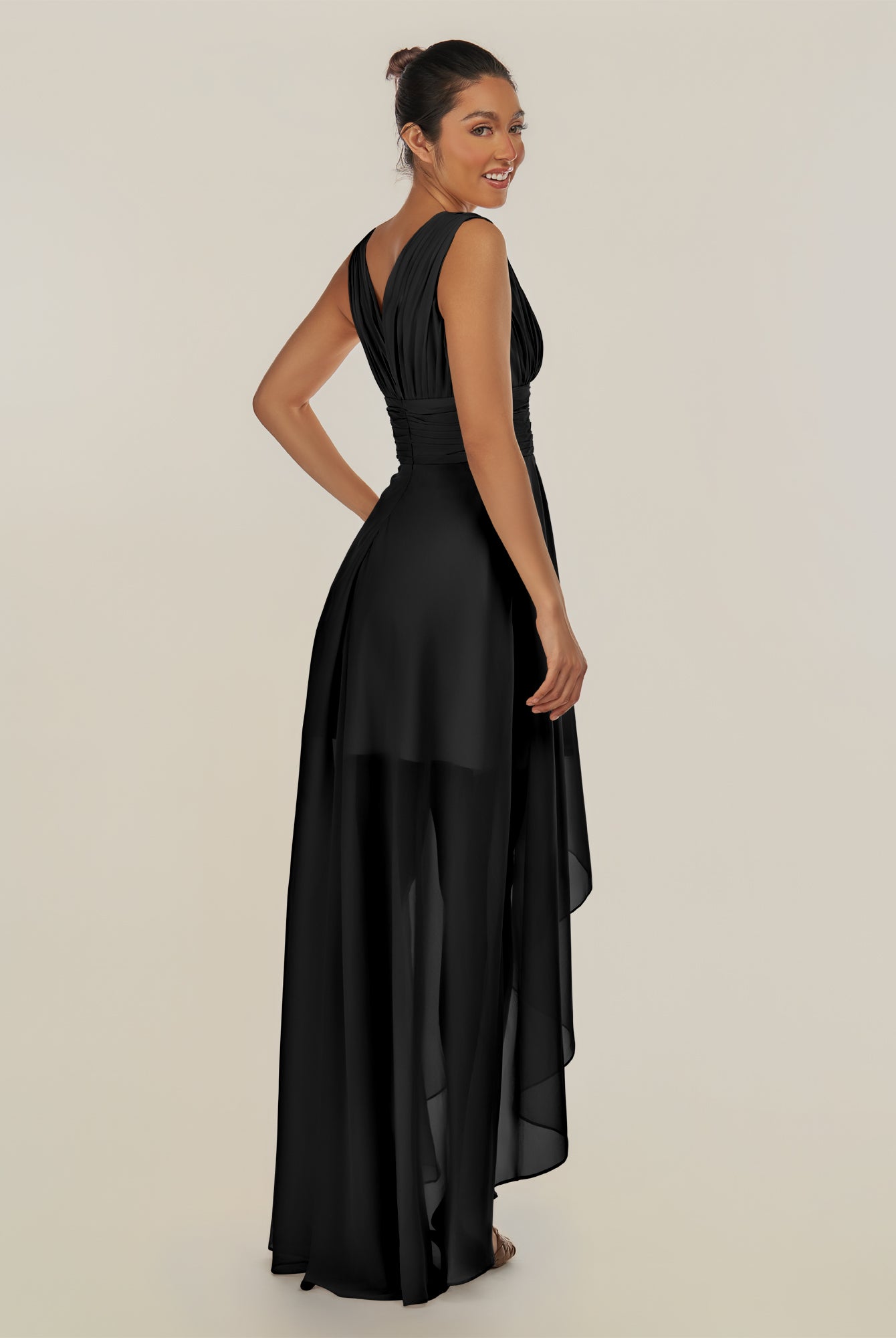 Jovi | Black - A Line Chiffon V Neck High-low Length Pleated Long Bridesmaid Dress