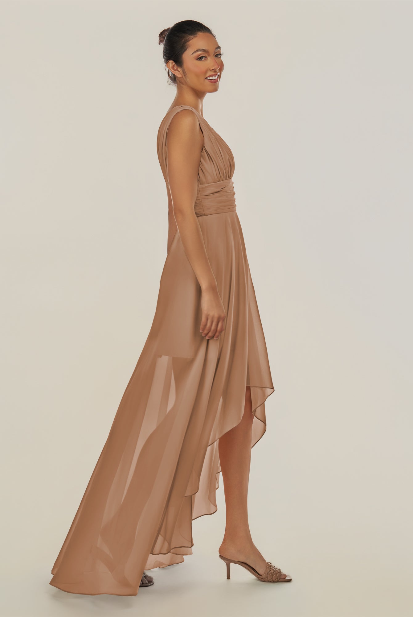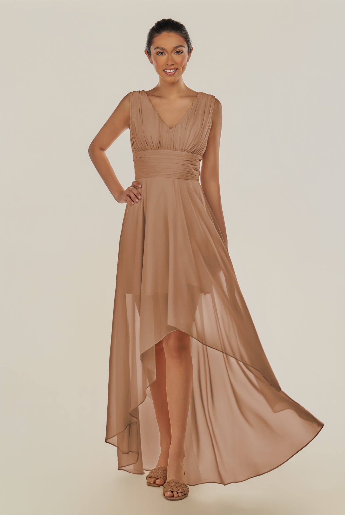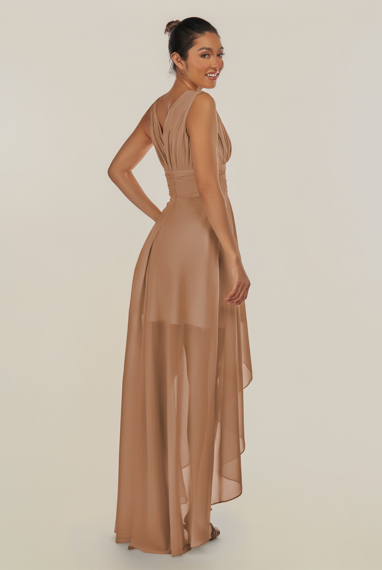 Jovi | Toffee - A Line Chiffon V Neck High-low Length Pleated Long Bridesmaid Dress