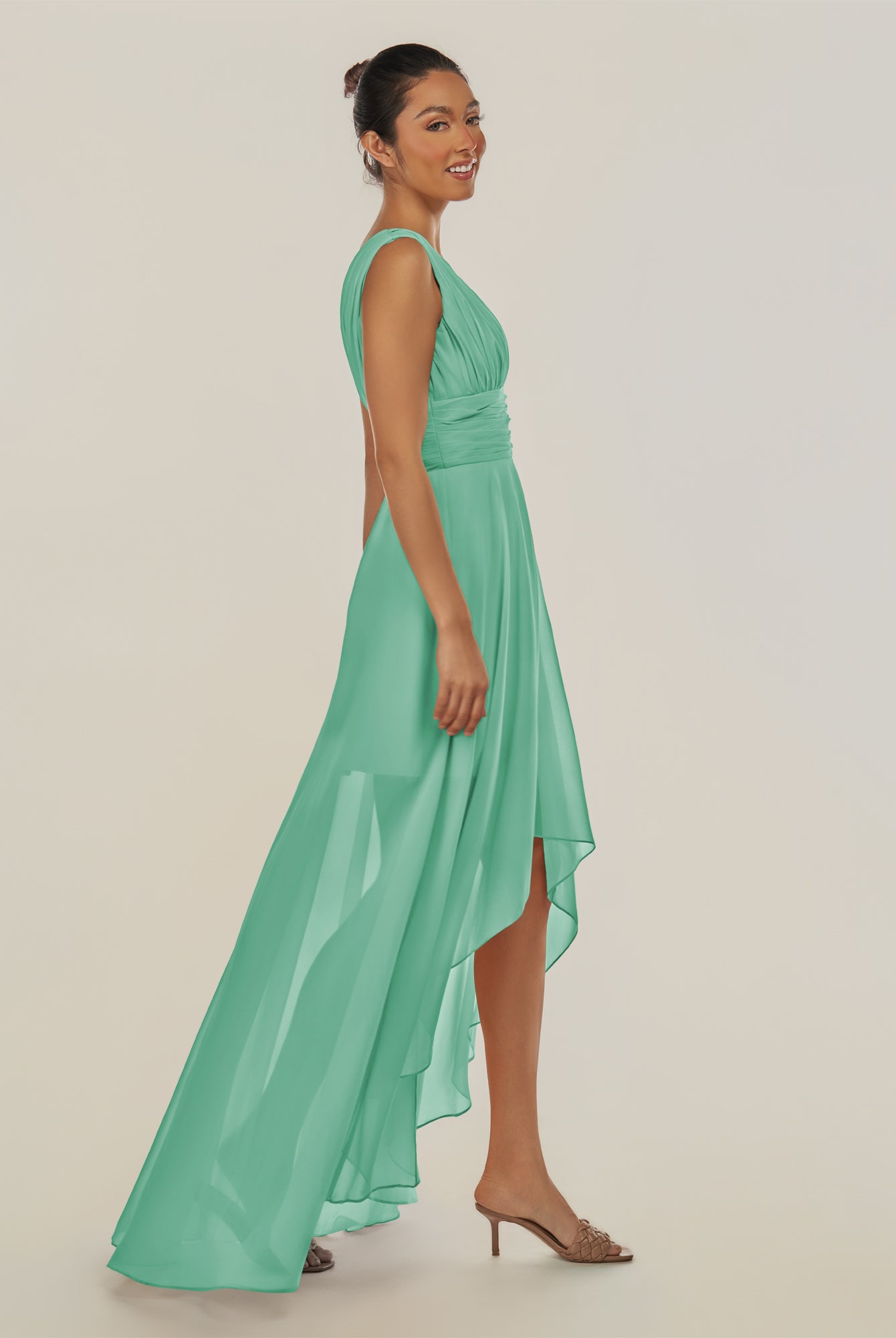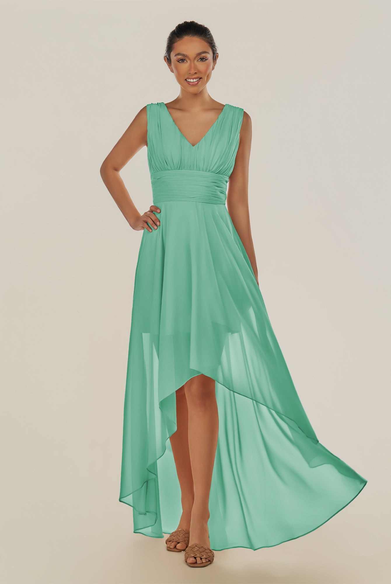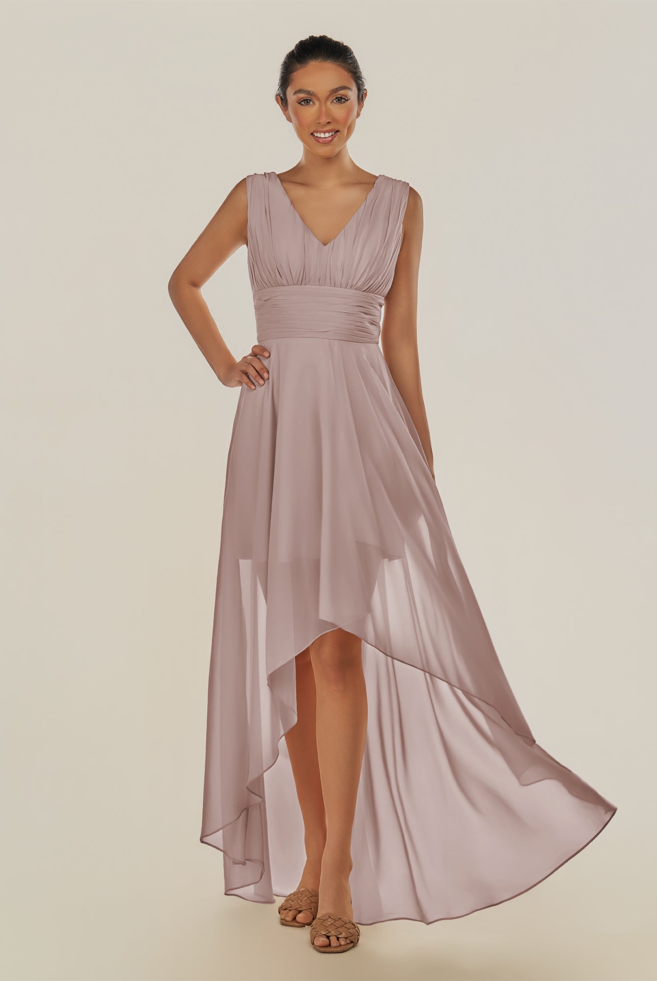 Jovi | Toffee - A Line Chiffon V Neck High-low Length Pleated Long Bridesmaid Dress
