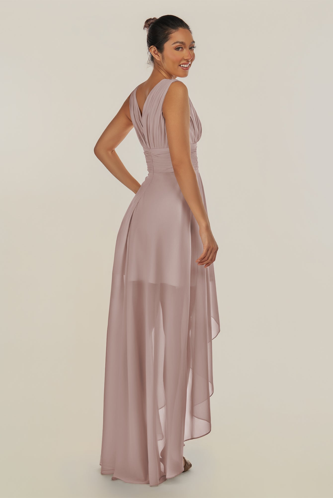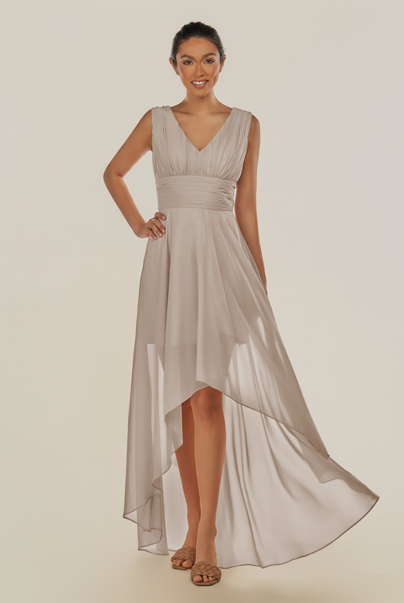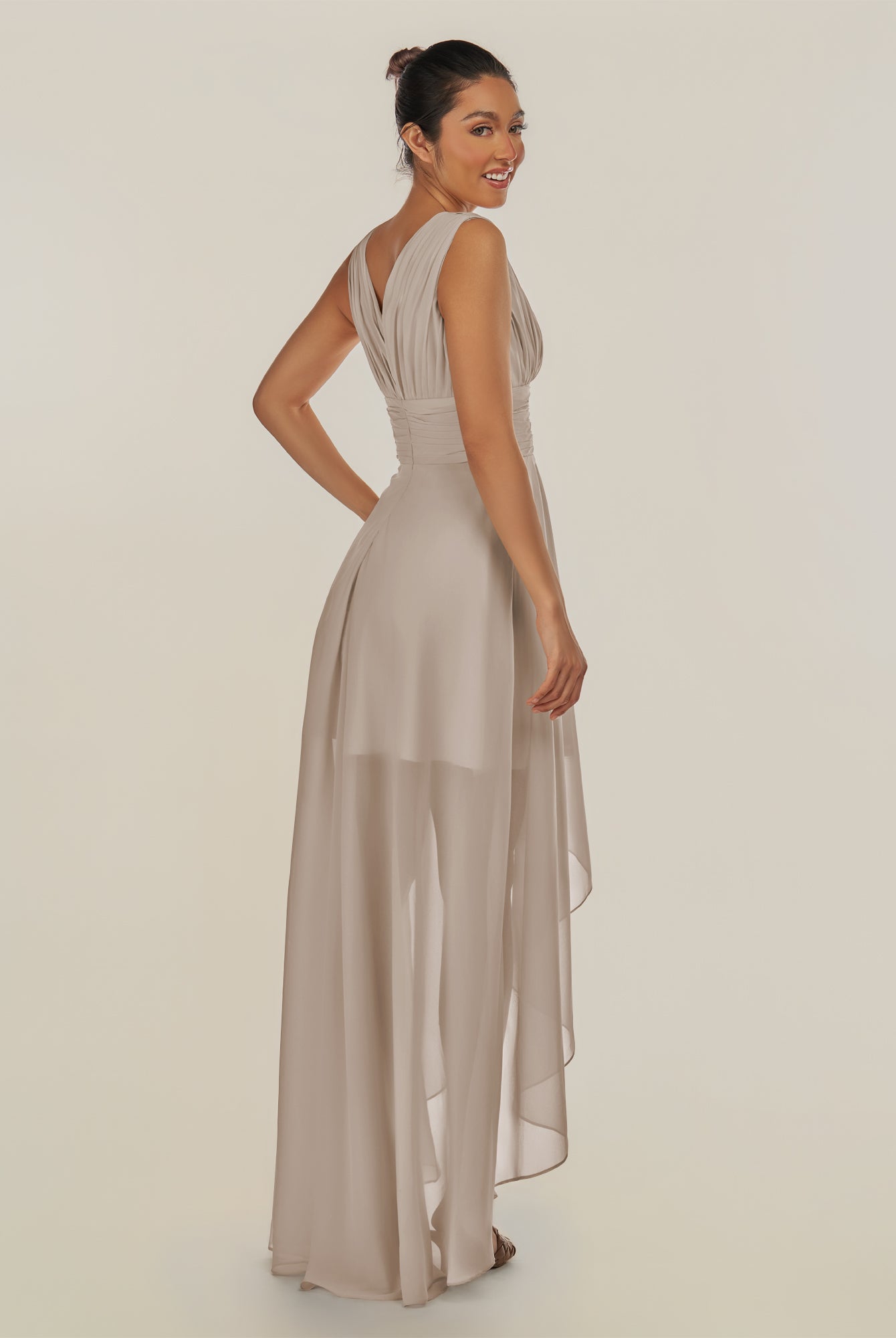 Jovi | Dove Gray - A Line Chiffon V Neck High-low Length Pleated Long Bridesmaid Dress