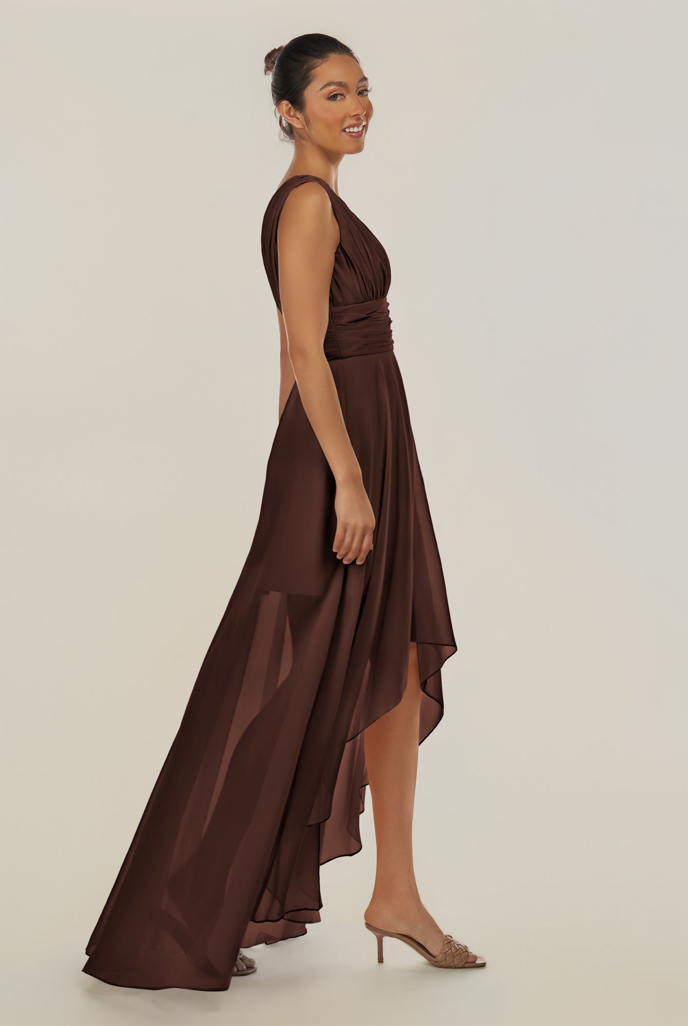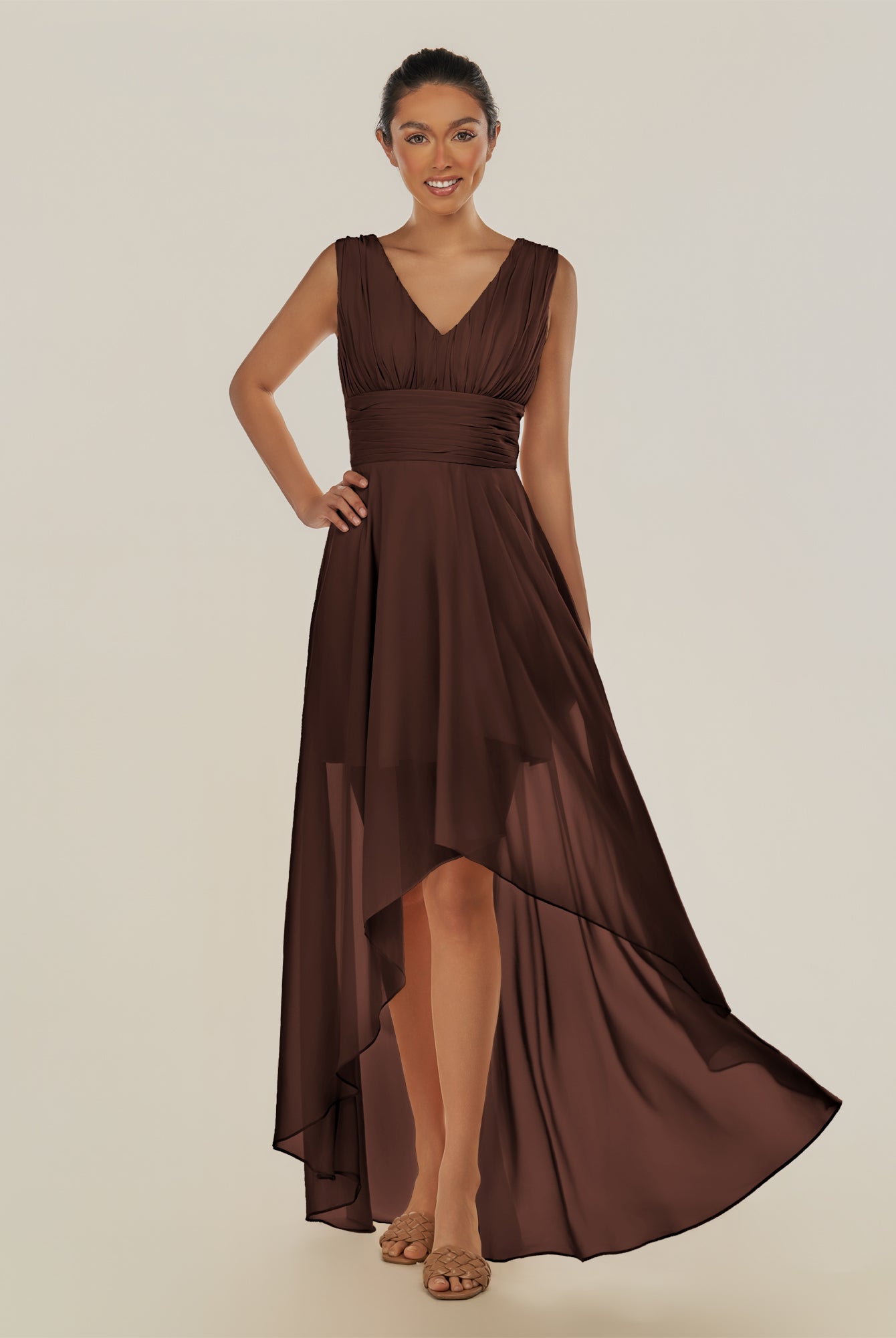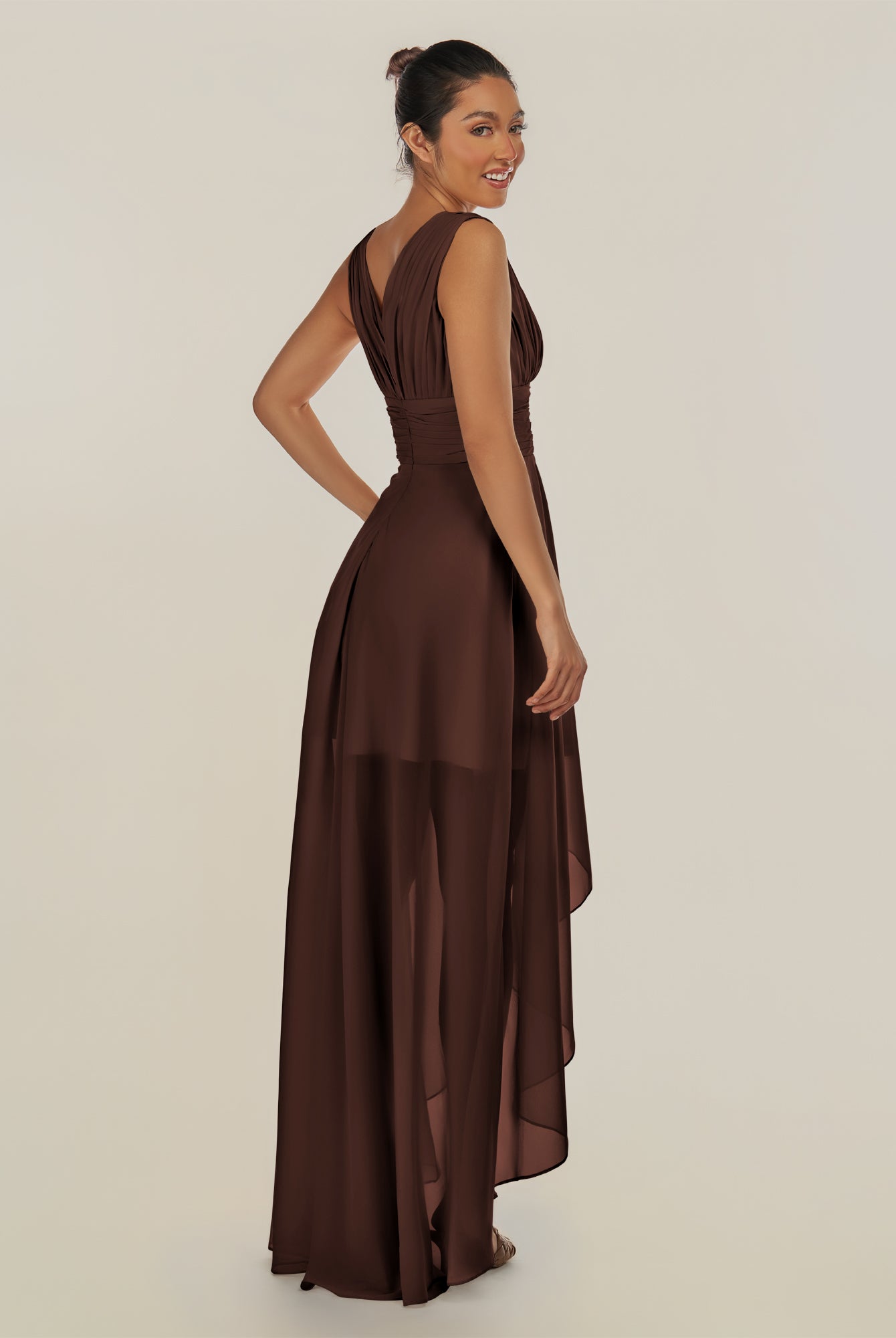 Jovi | Espresso - A Line Chiffon V Neck High-low Length Pleated Long Bridesmaid Dress