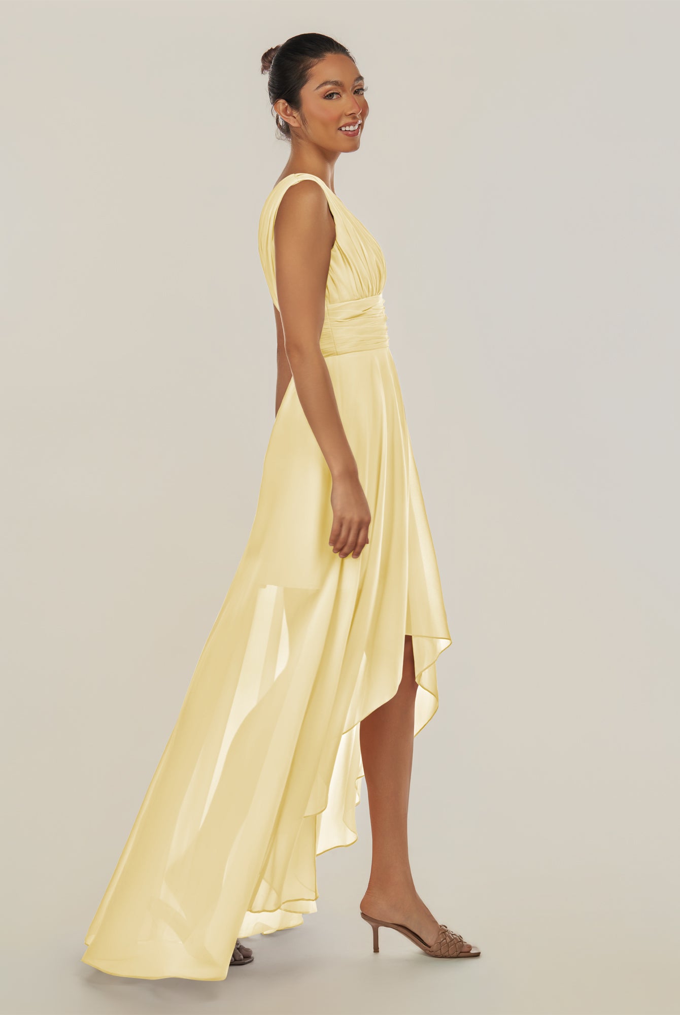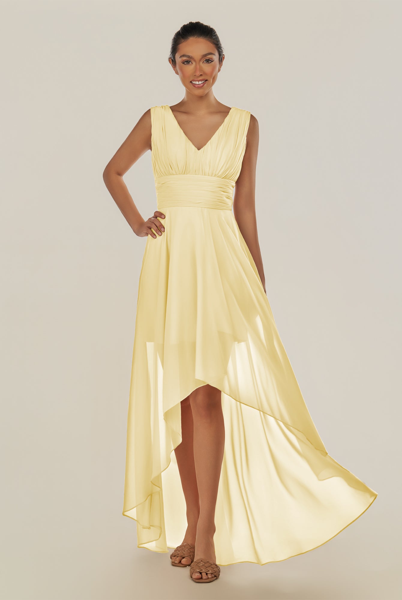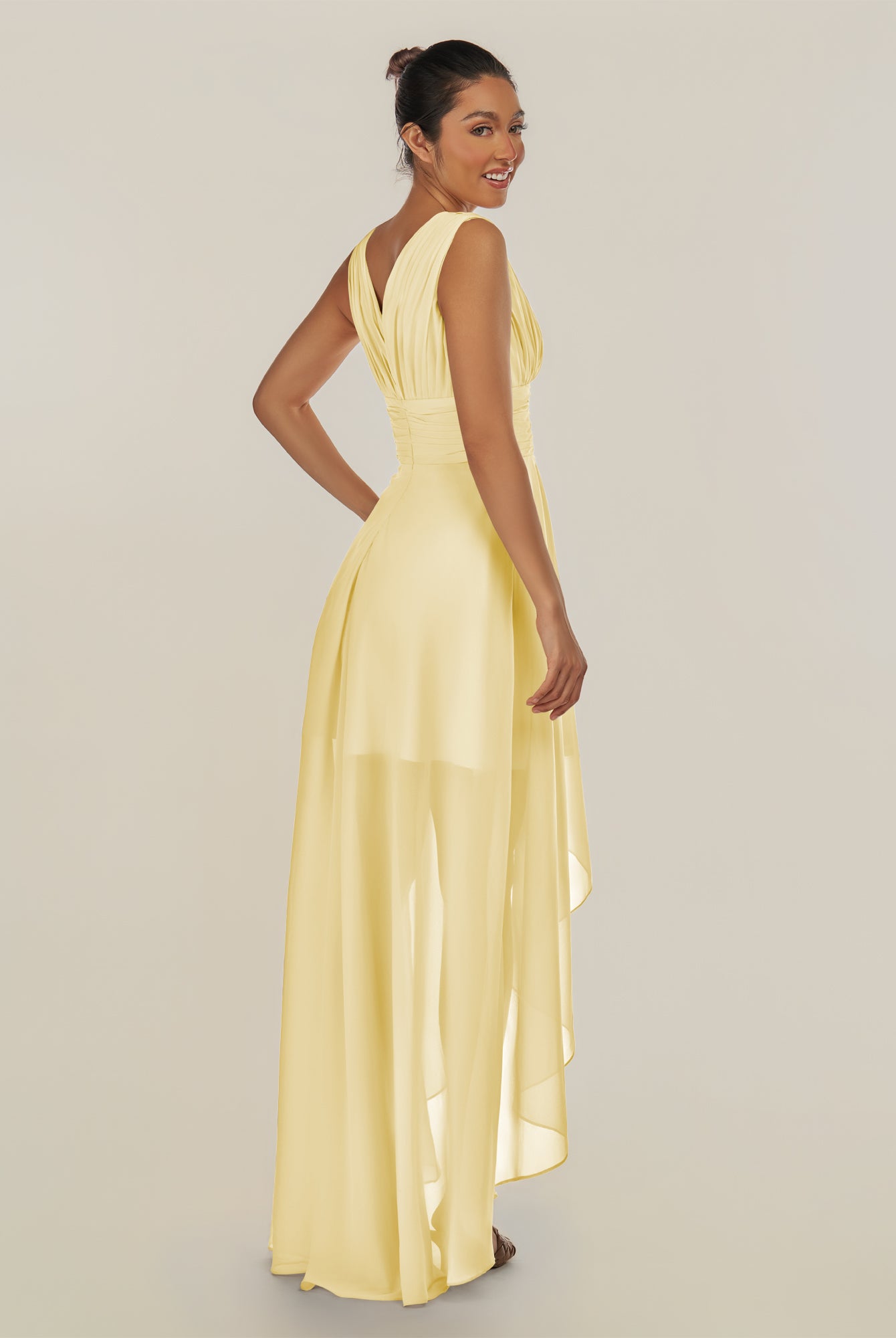 Jovi | Pastel Yellow - A Line Chiffon V Neck High-low Length Pleated Long Bridesmaid Dress