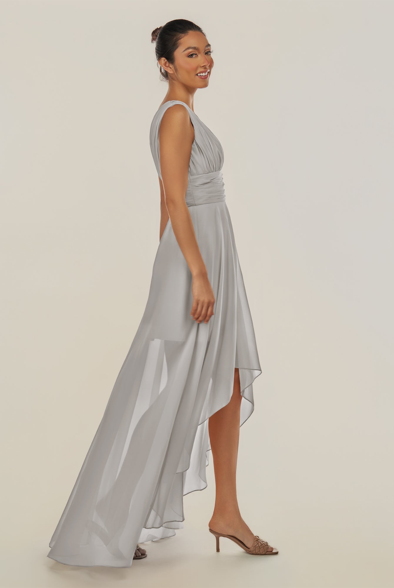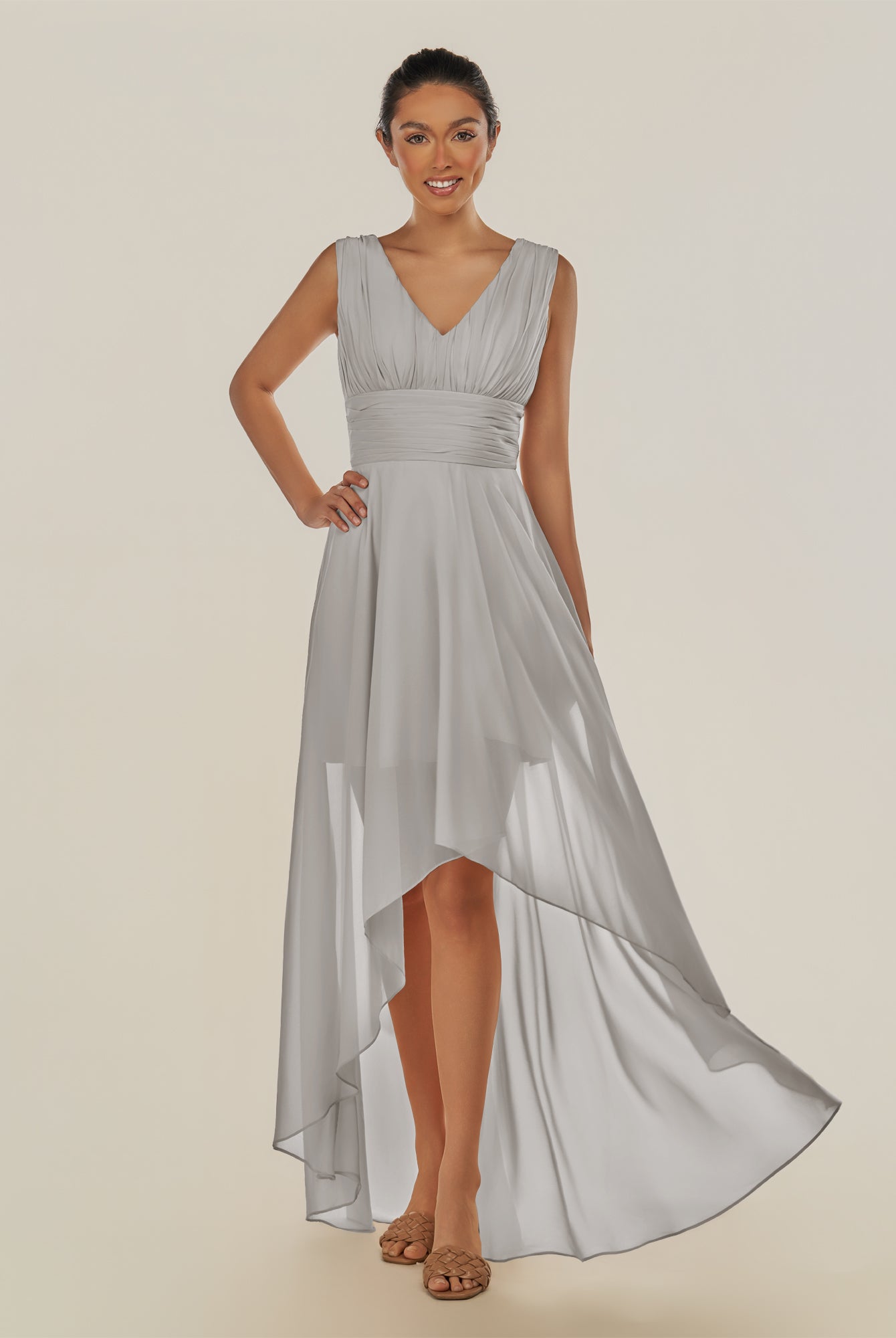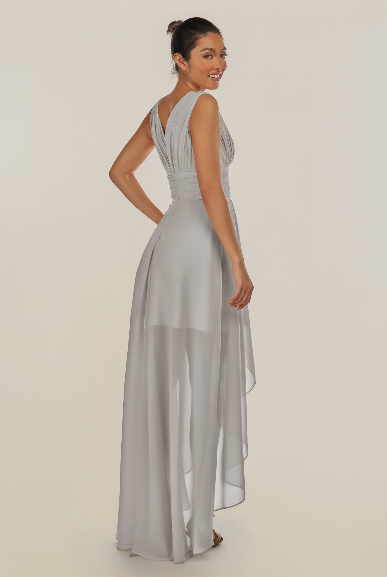 Jovi | Silver - A Line Chiffon V Neck High-low Length Pleated Long Bridesmaid Dress