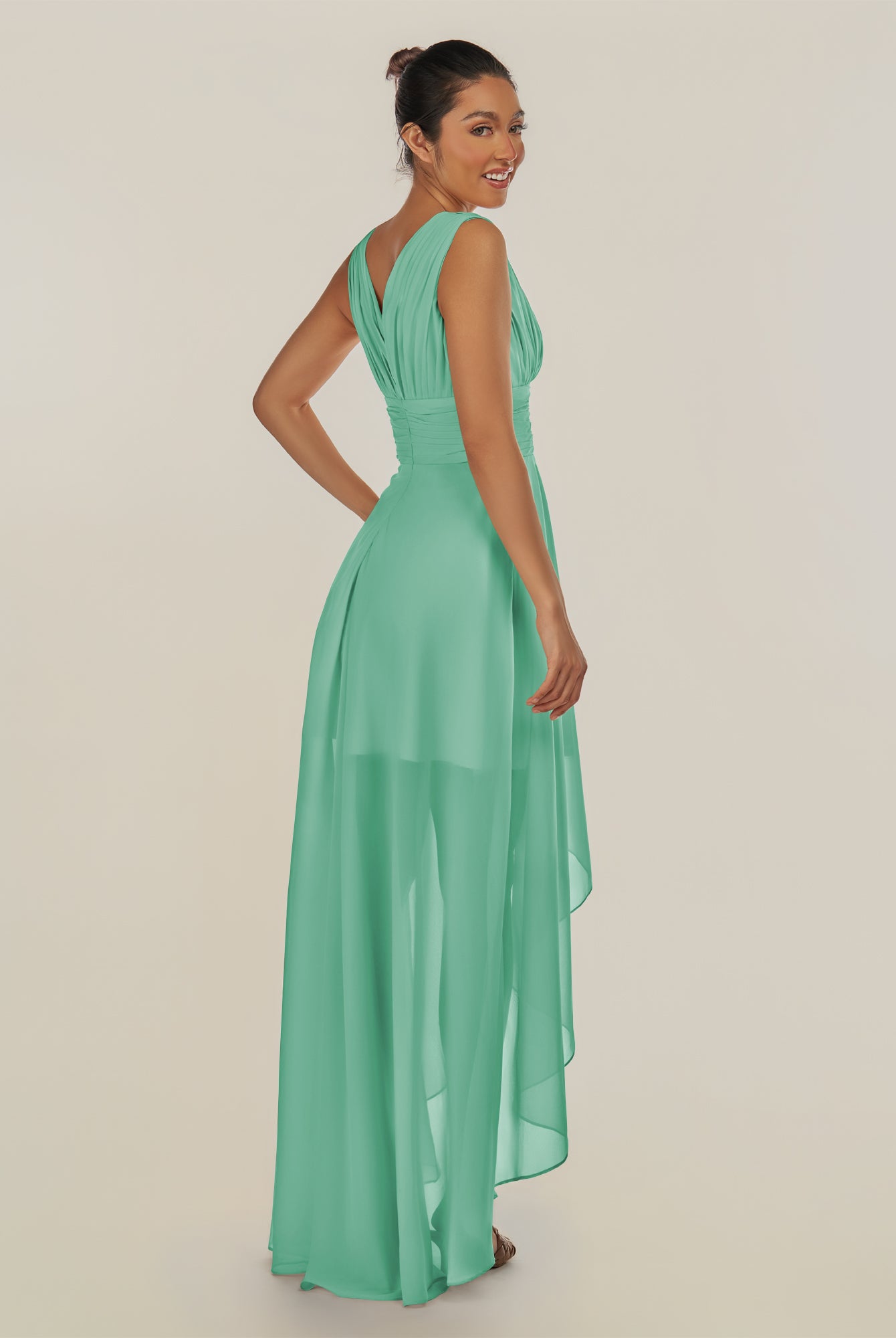 Jovi | Turquoise - A Line Chiffon V Neck High-low Length Pleated Long Bridesmaid Dress
