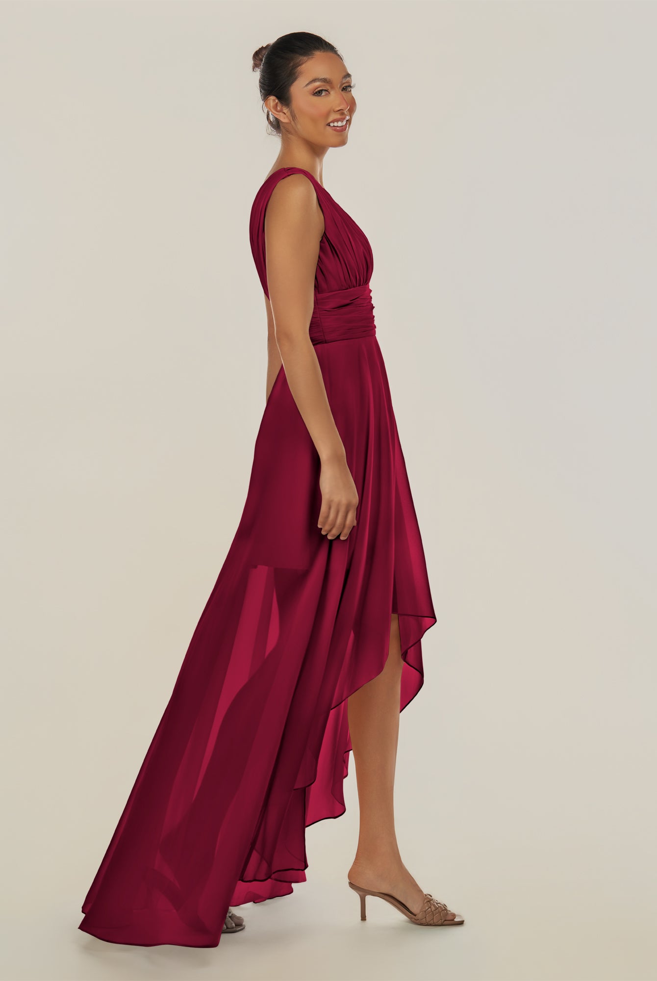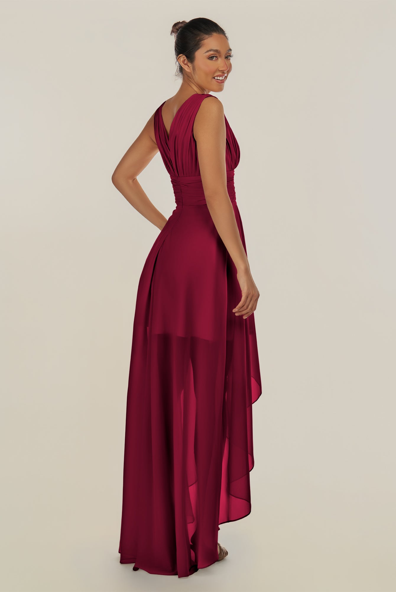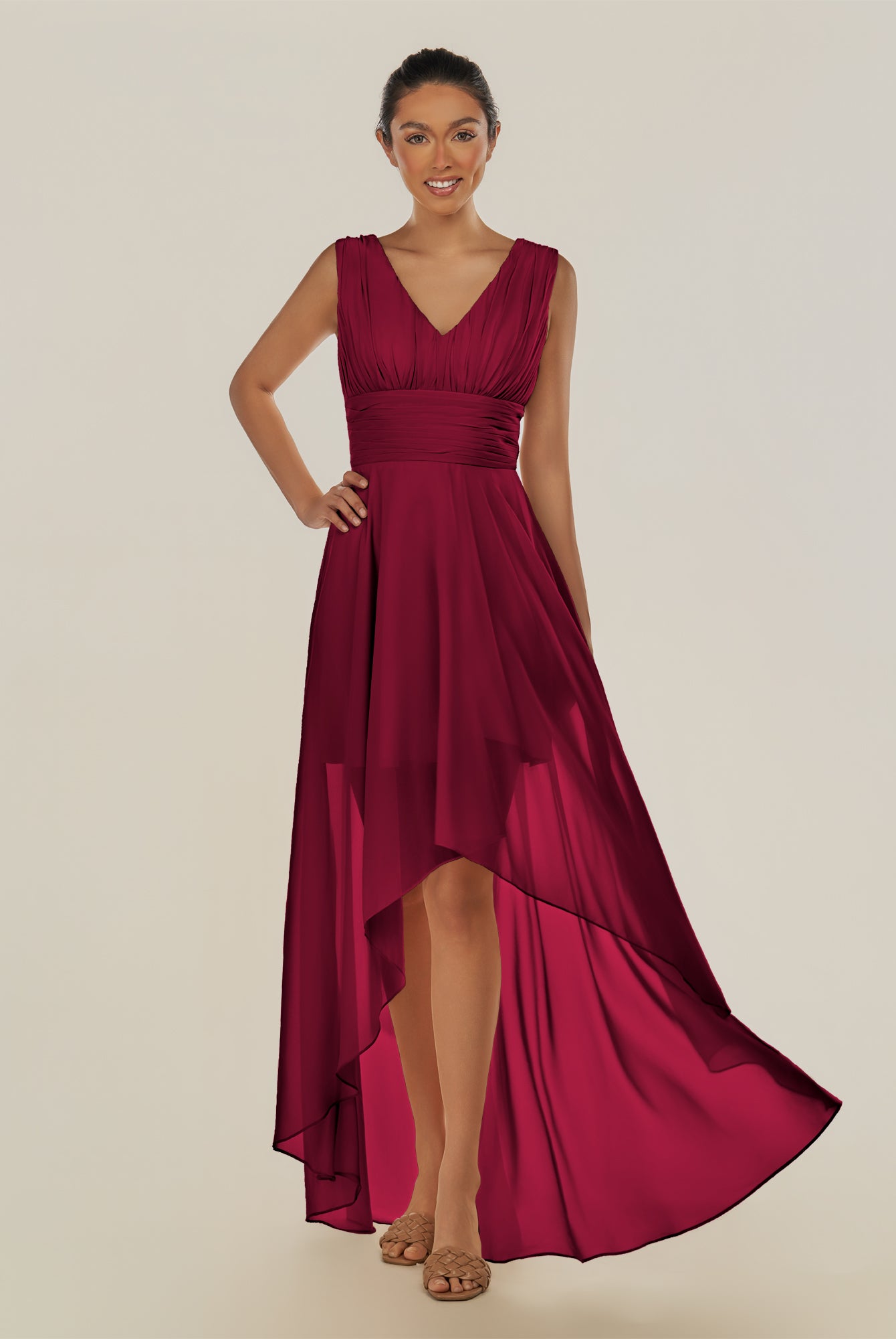 Jovi | Merlot - A Line Chiffon V Neck High-low Length Pleated Long Bridesmaid Dress