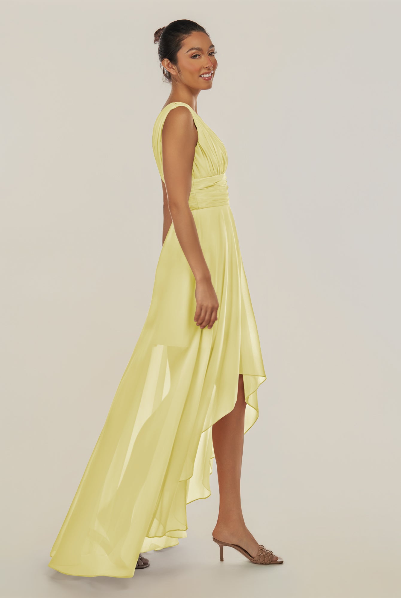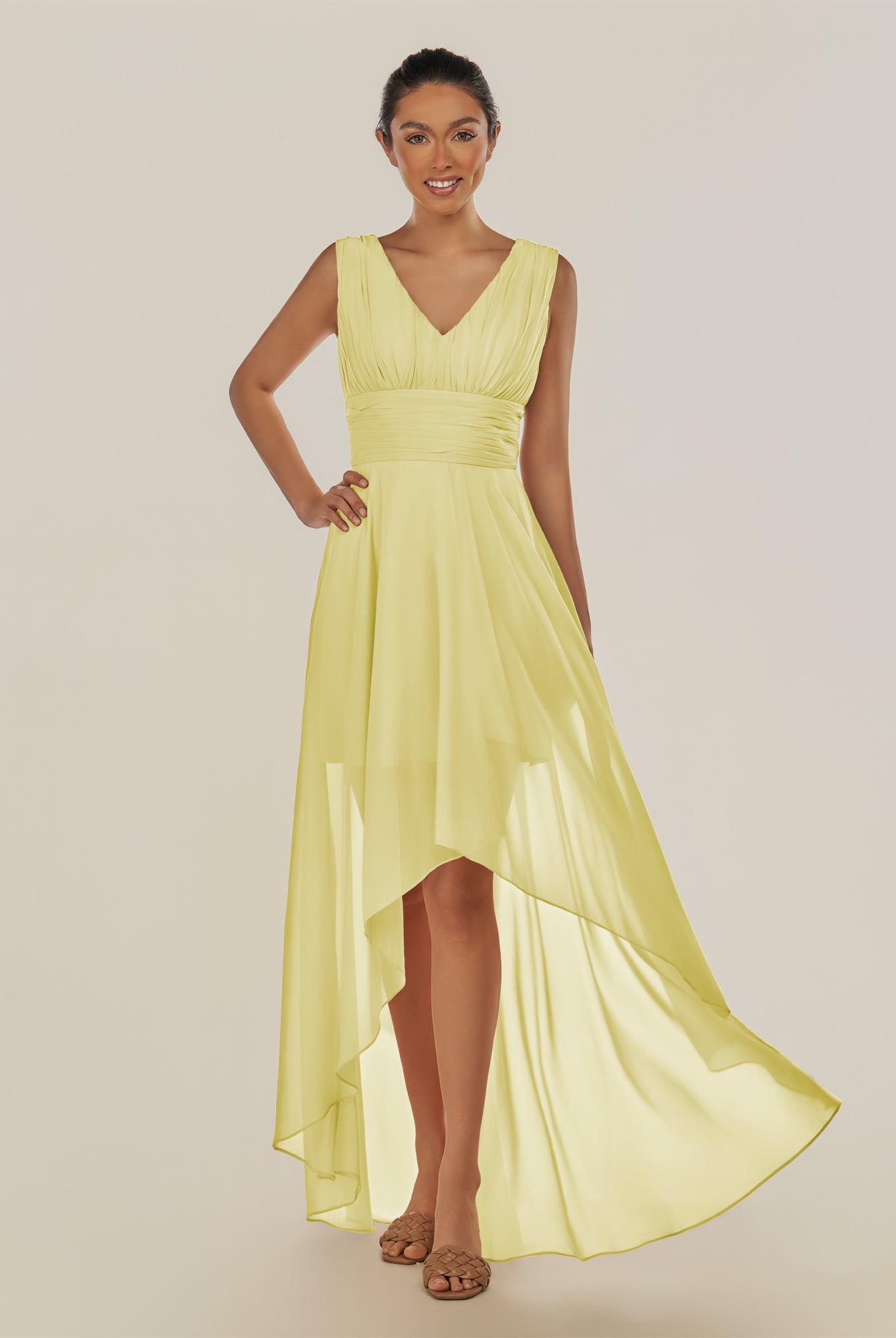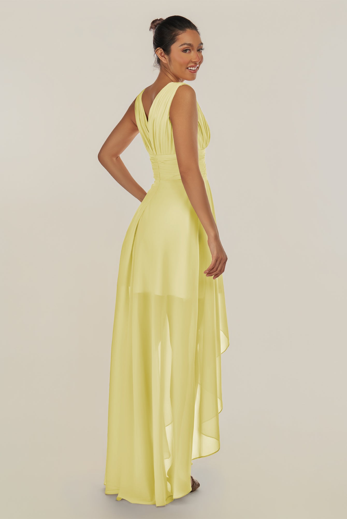 Jovi | Buttercup - A Line Chiffon V Neck High-low Length Pleated Long Bridesmaid Dress