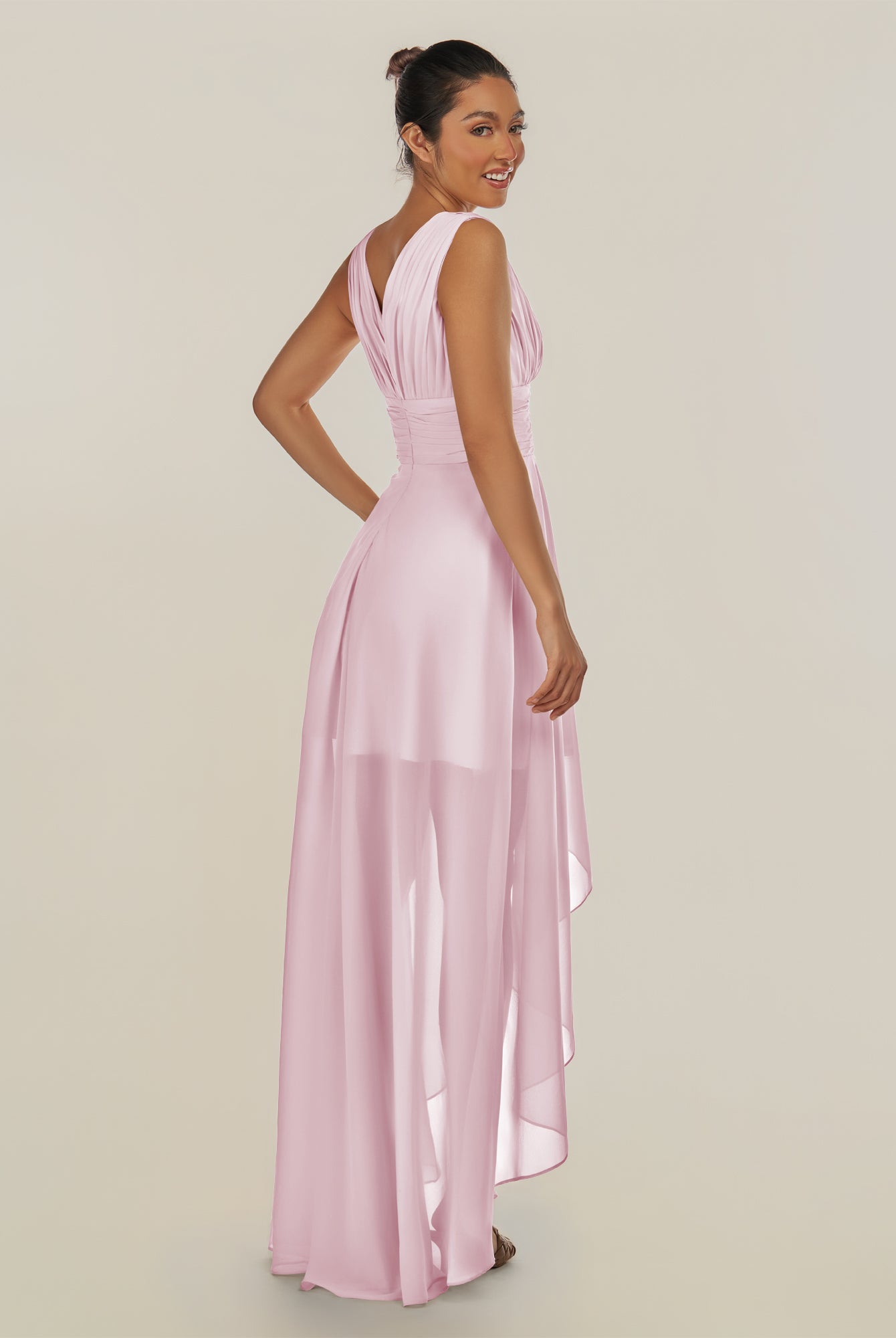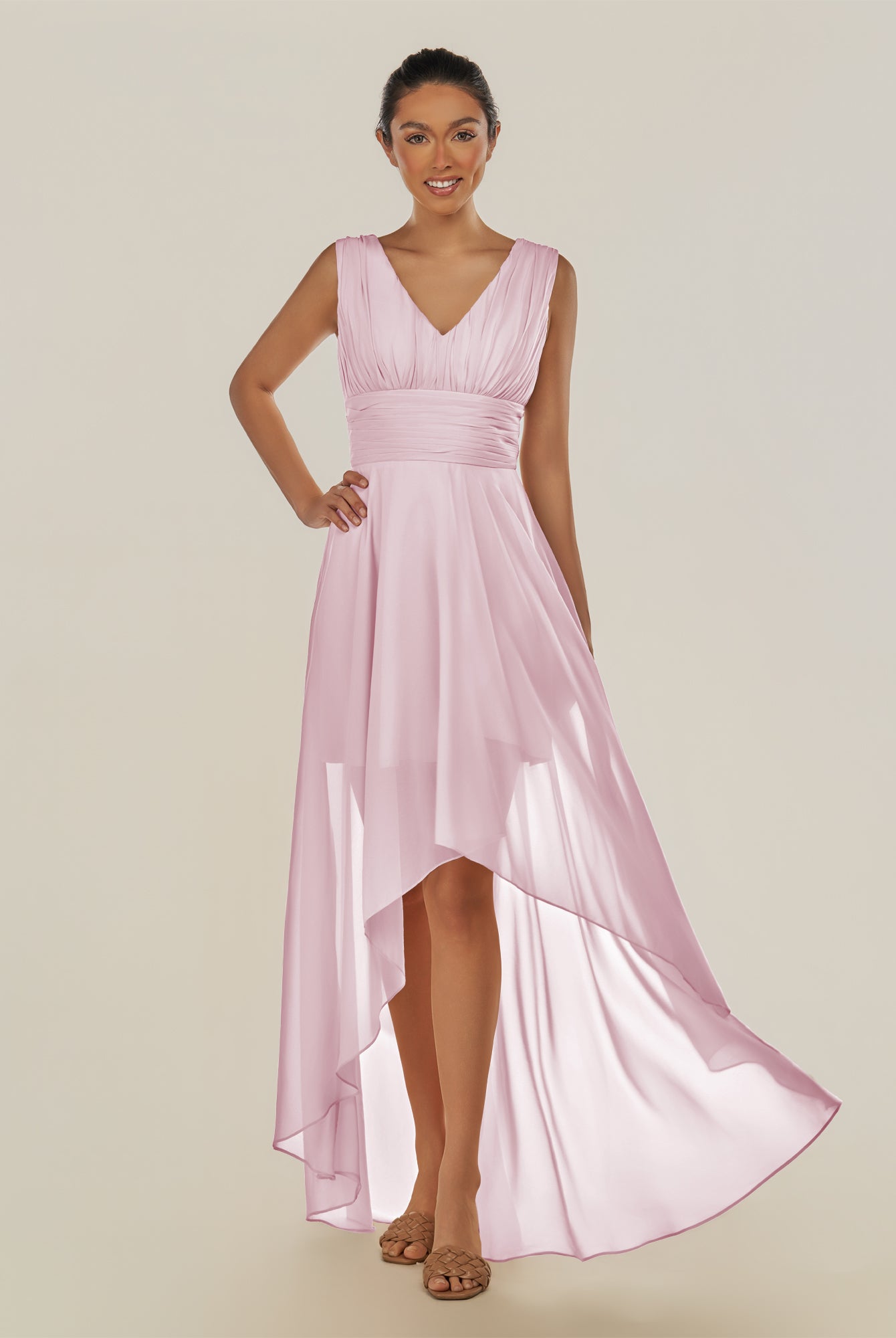 Jovi | Rose Petal - A Line Chiffon V Neck High-low Length Pleated Long Bridesmaid Dress