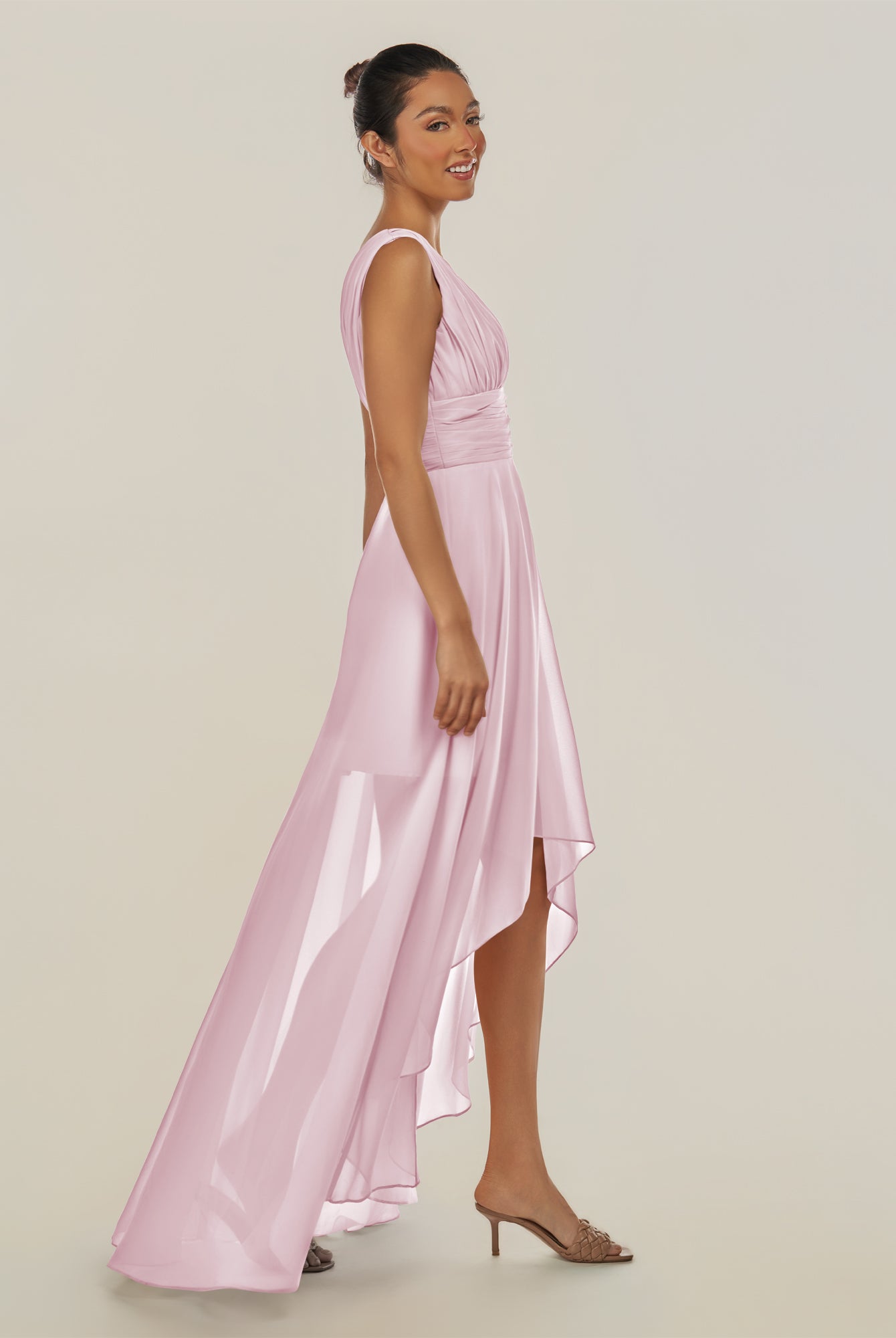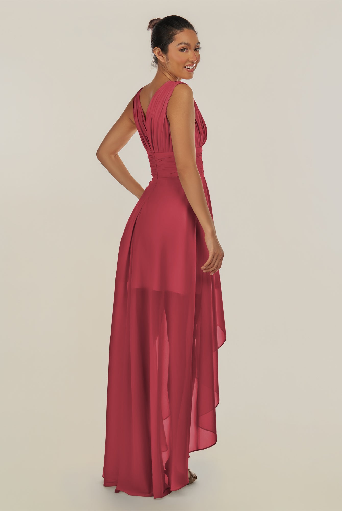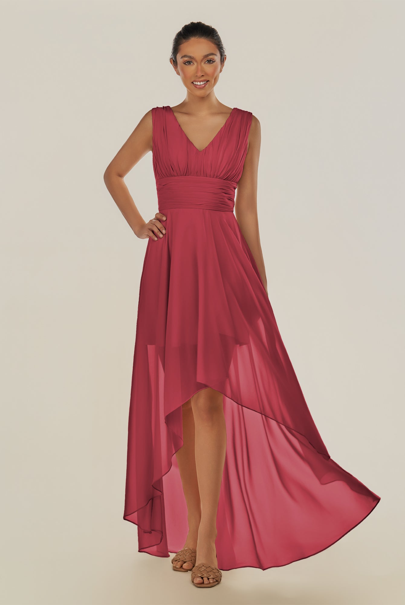 Jovi | Wild Rose - A Line Chiffon V Neck High-low Length Pleated Long Bridesmaid Dress