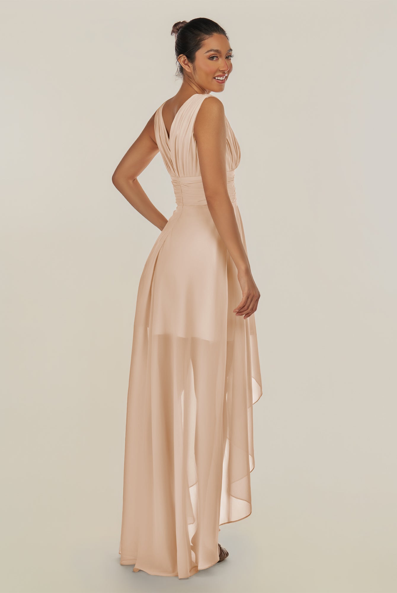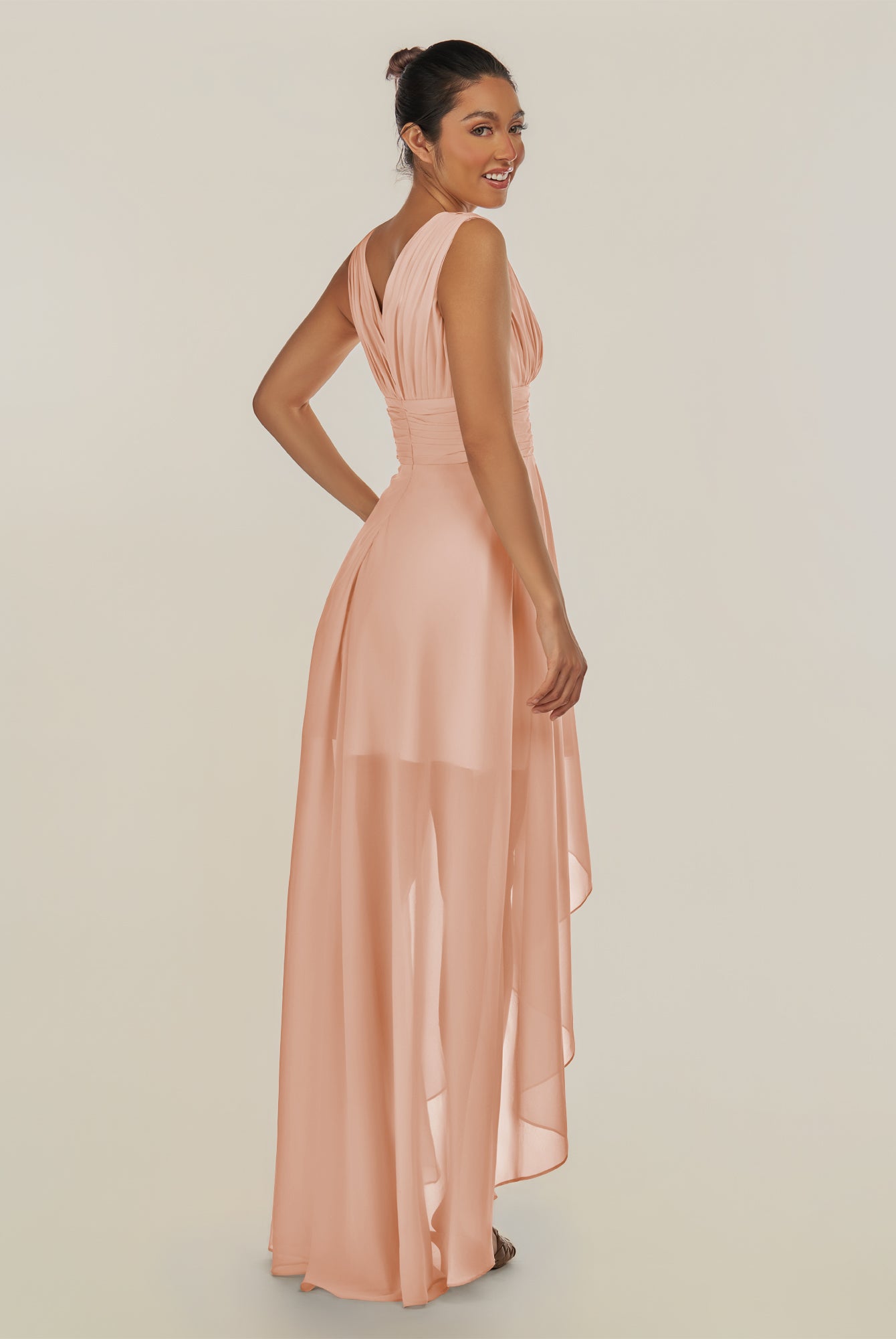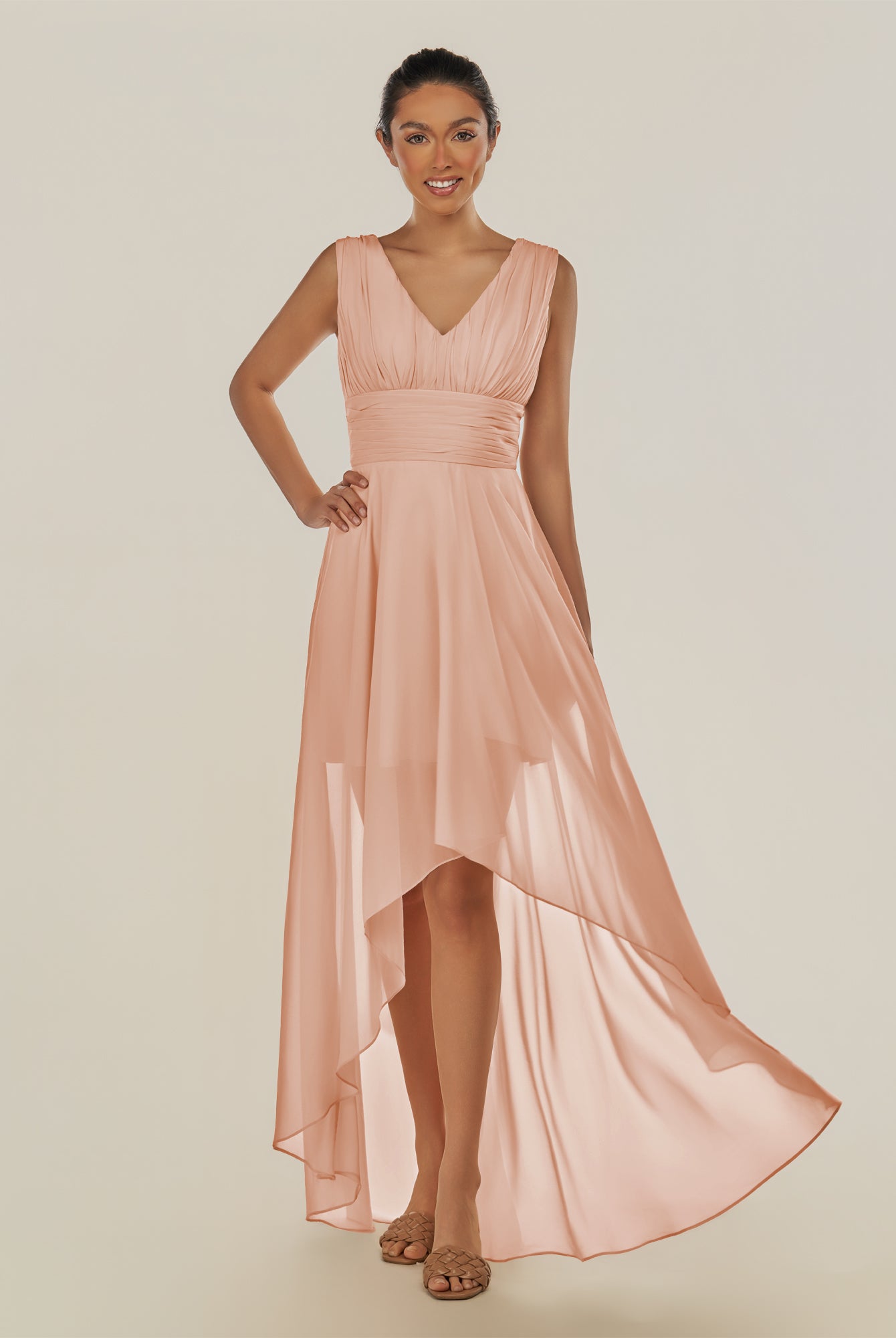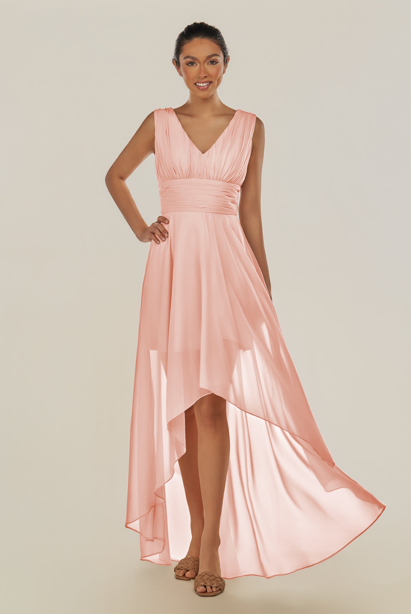 Jovi | Champagne Rose - A Line Chiffon V Neck High-low Length Pleated Long Bridesmaid Dress