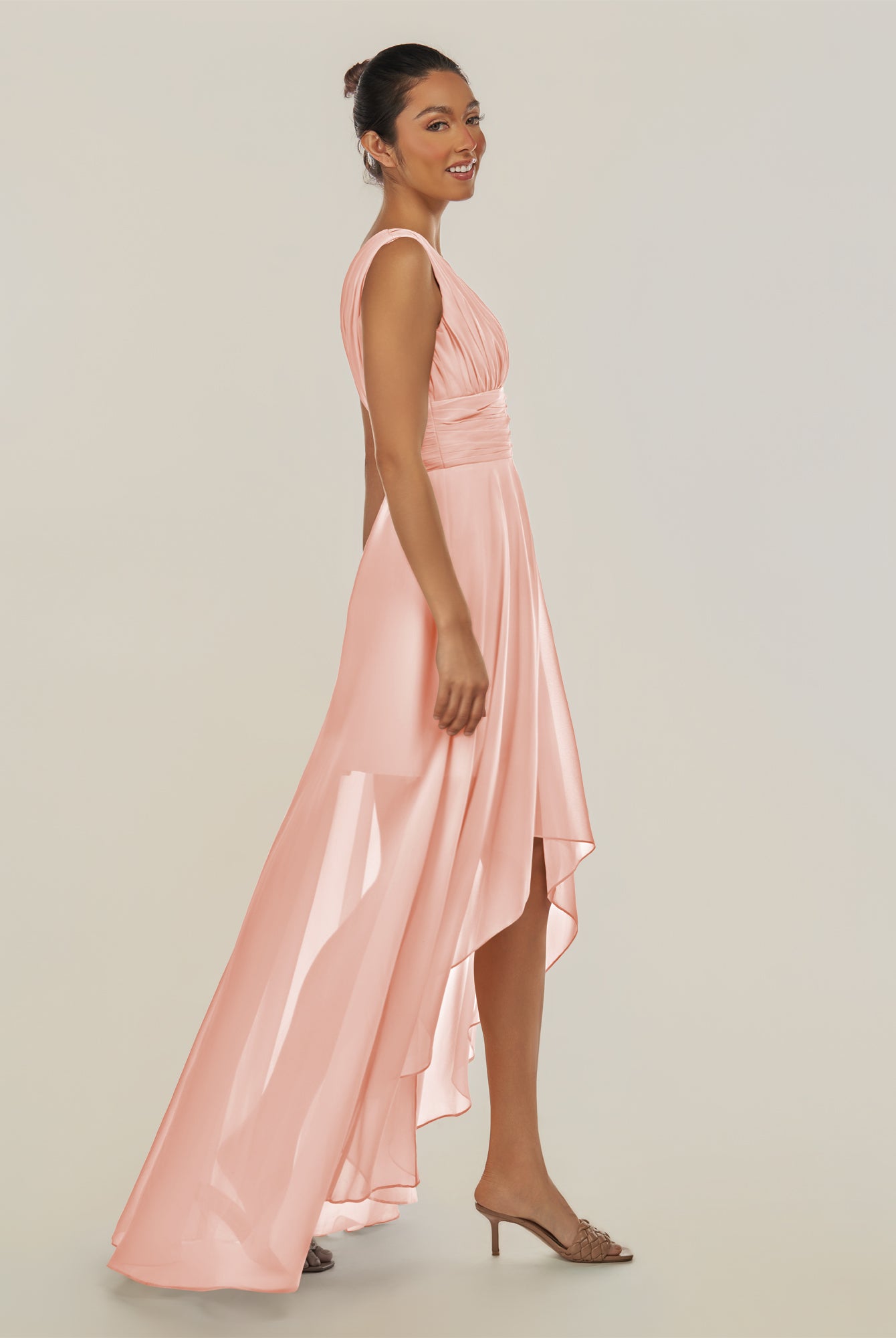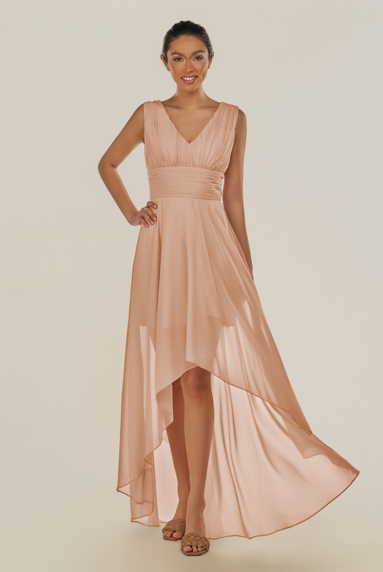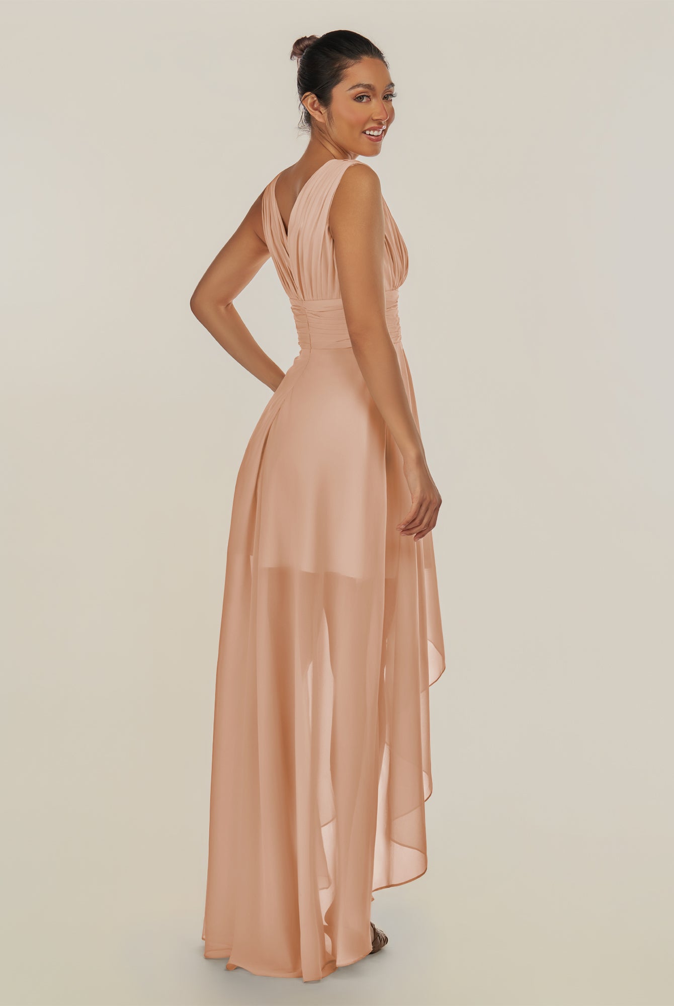 Jovi | Champagne Rose - A Line Chiffon V Neck High-low Length Pleated Long Bridesmaid Dress