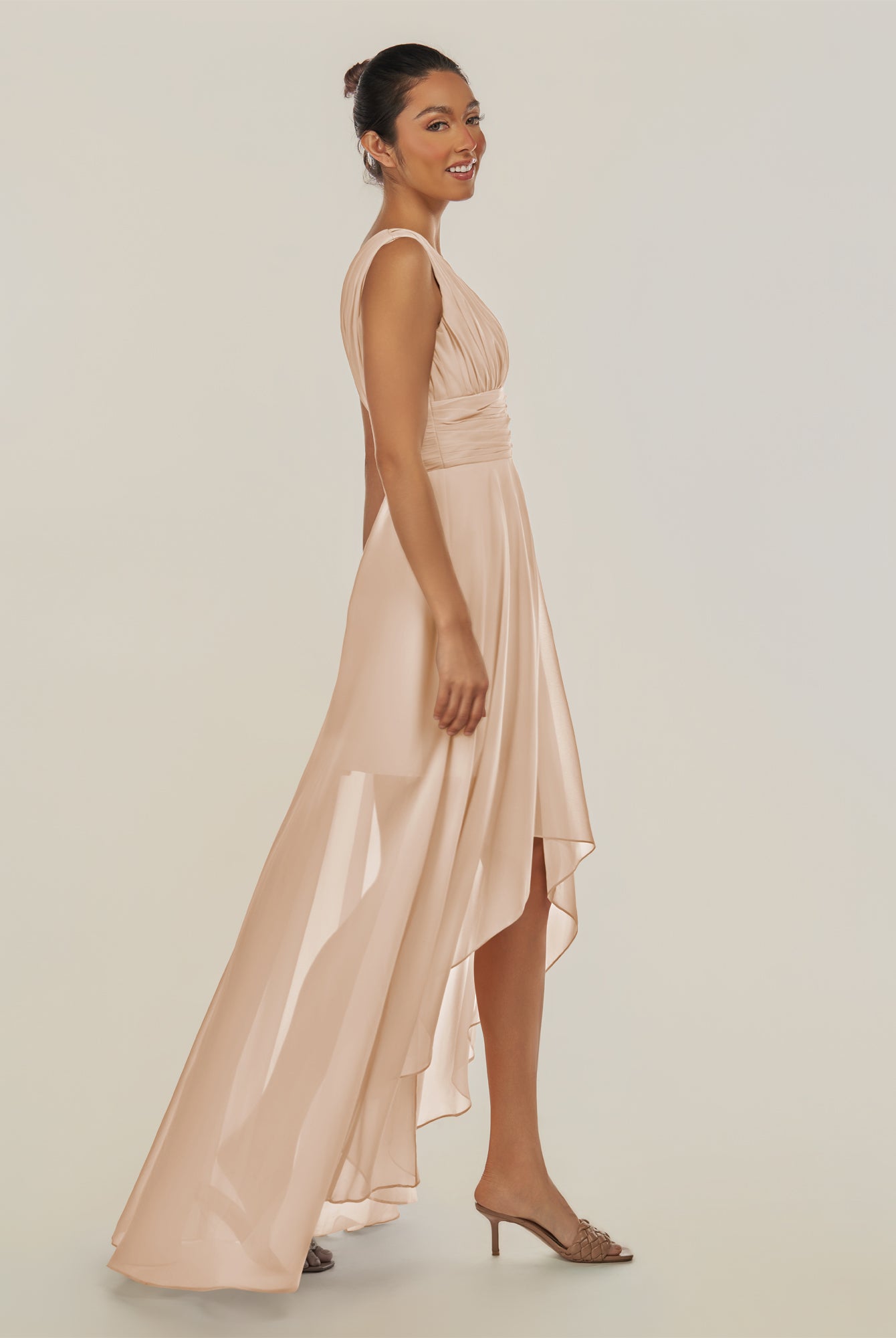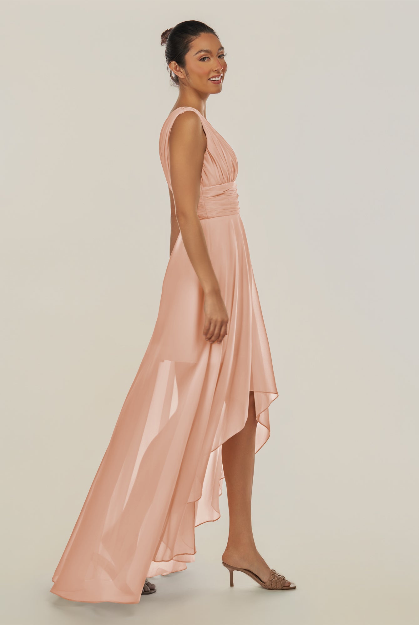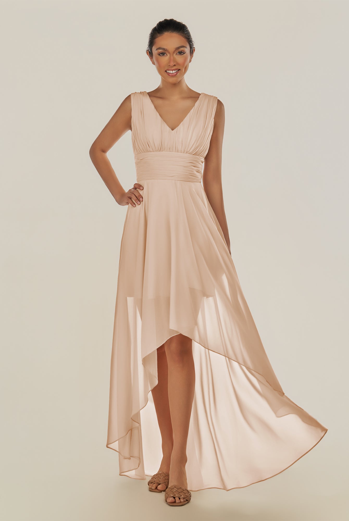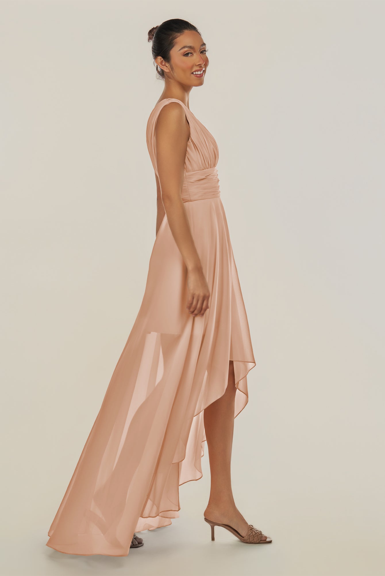 Jovi | Champagne Rose - A Line Chiffon V Neck High-low Length Pleated Long Bridesmaid Dress