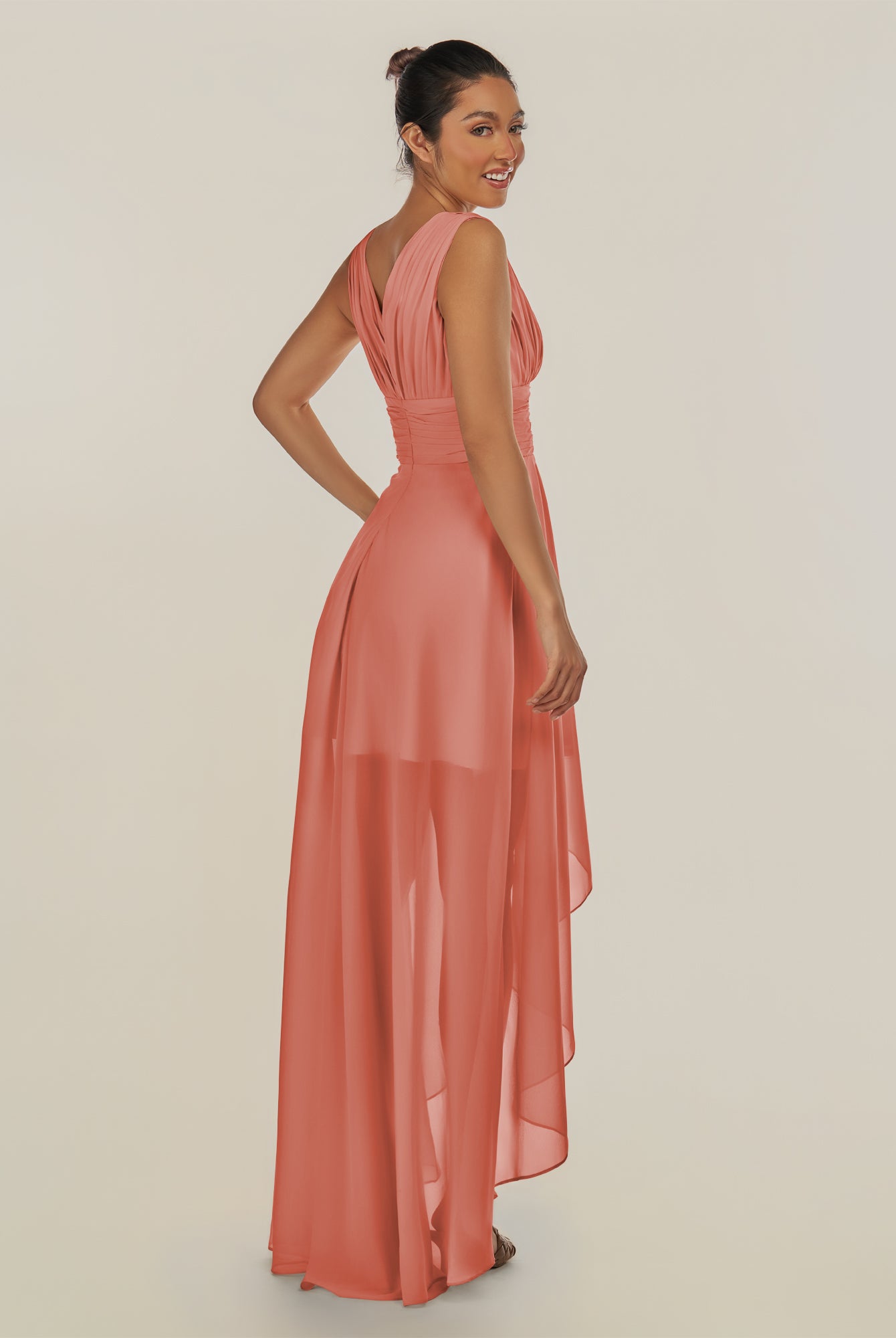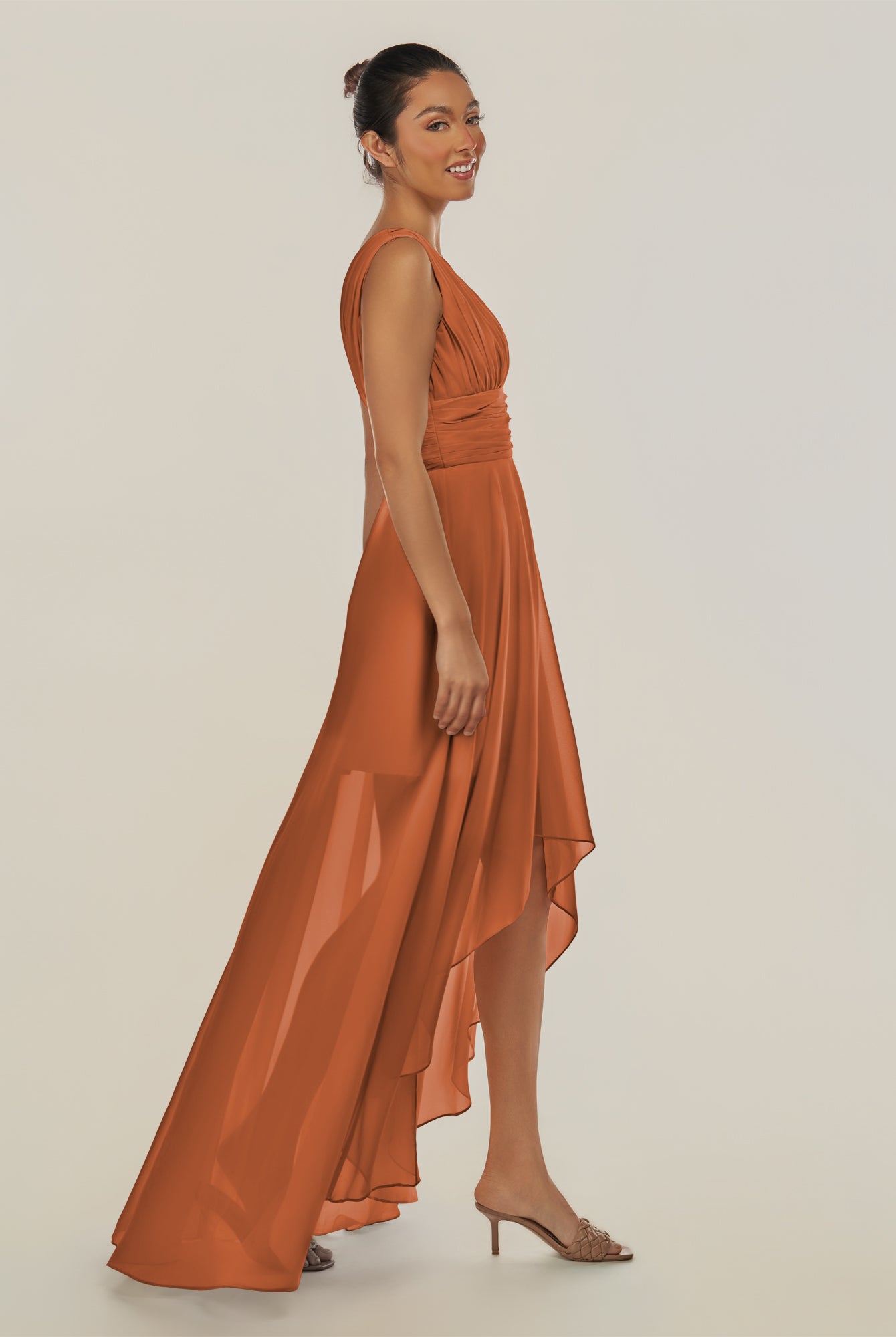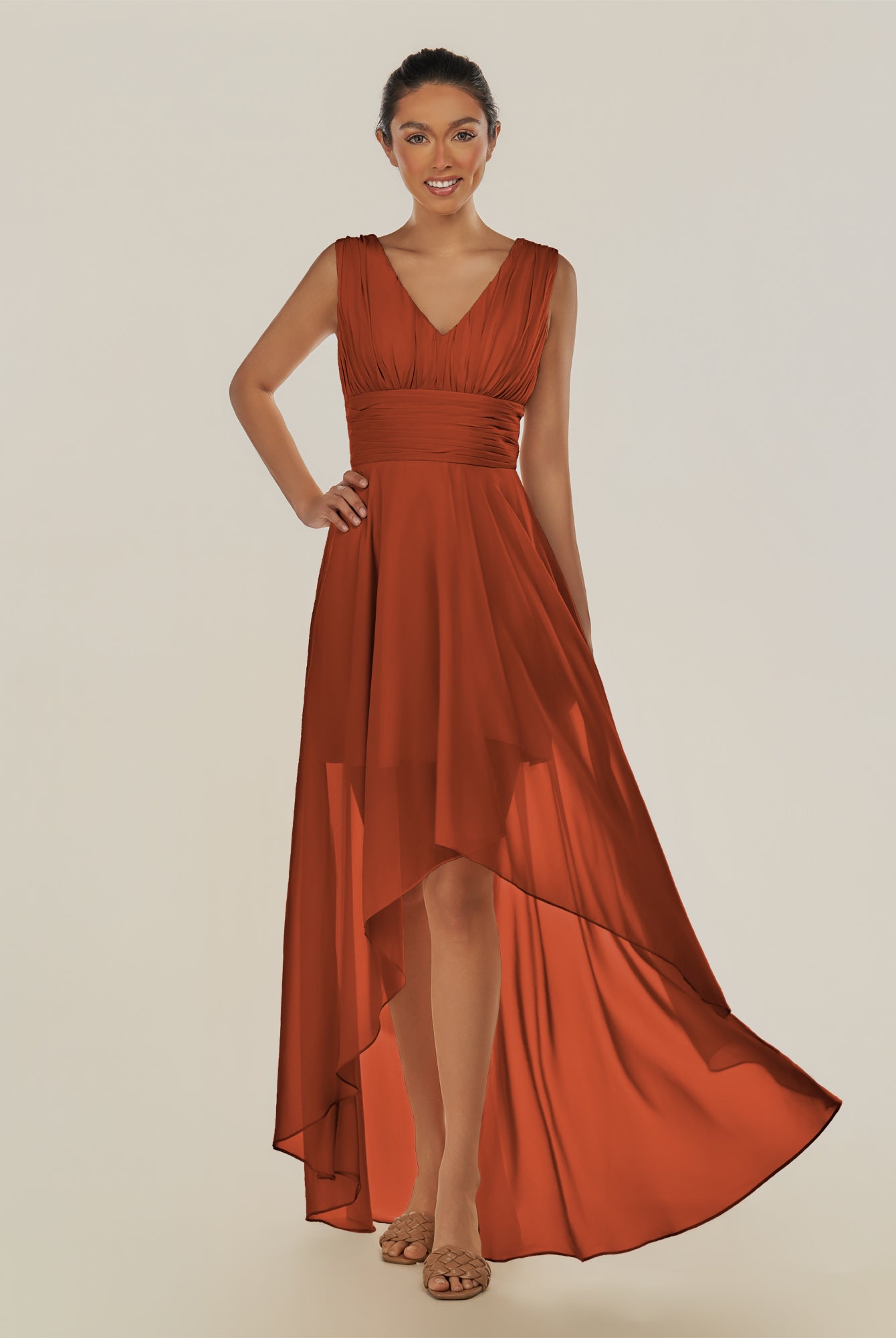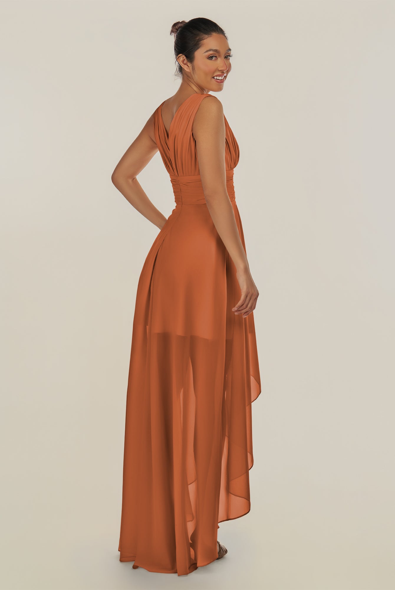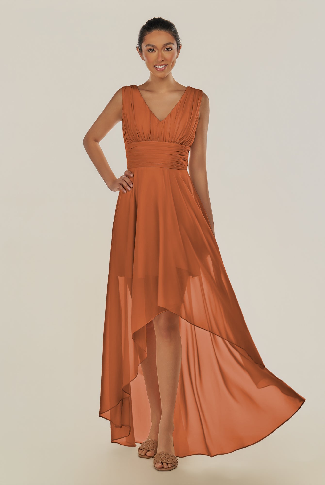 Jovi | Cinnamon - A Line Chiffon V Neck High-low Length Pleated Long Bridesmaid Dress