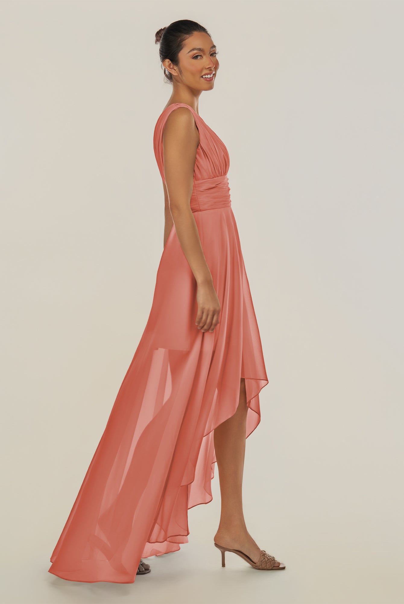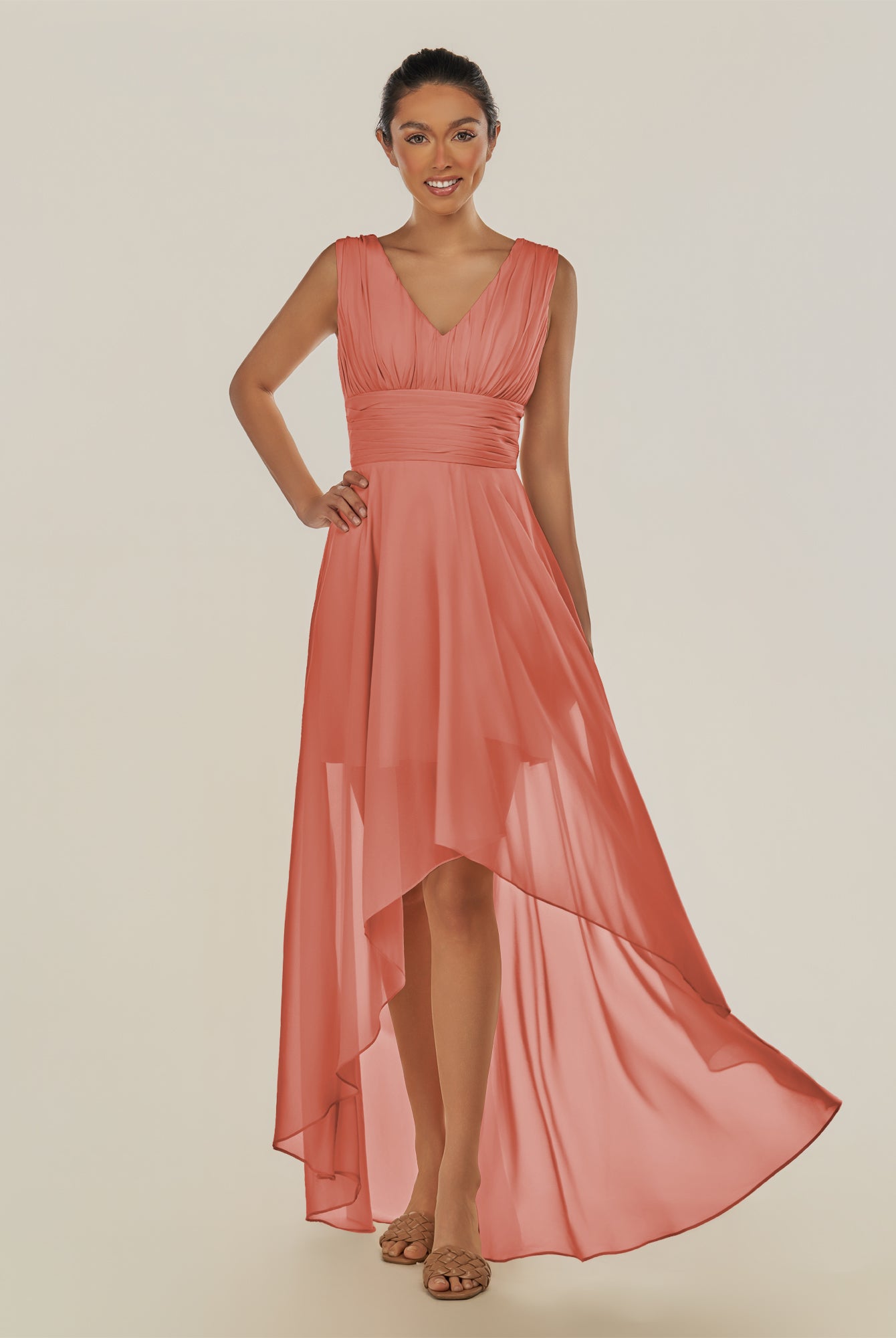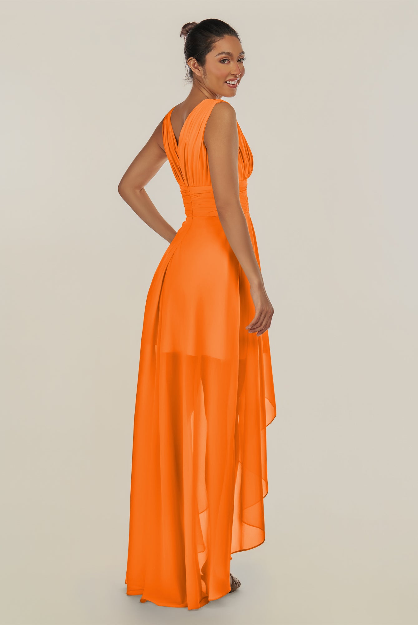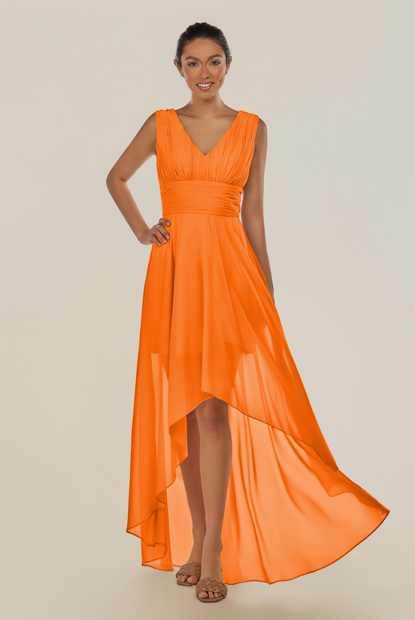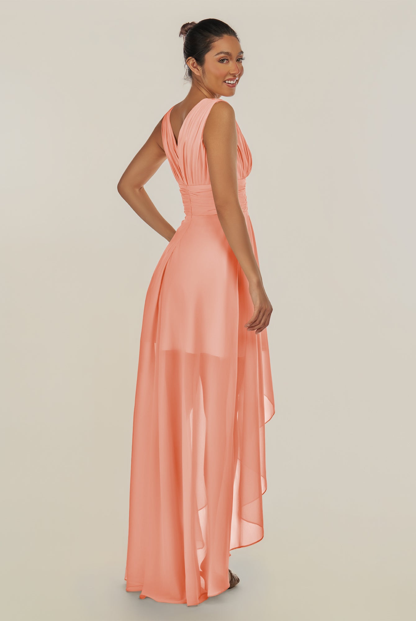 Jovi | Cinnamon - A Line Chiffon V Neck High-low Length Pleated Long Bridesmaid Dress