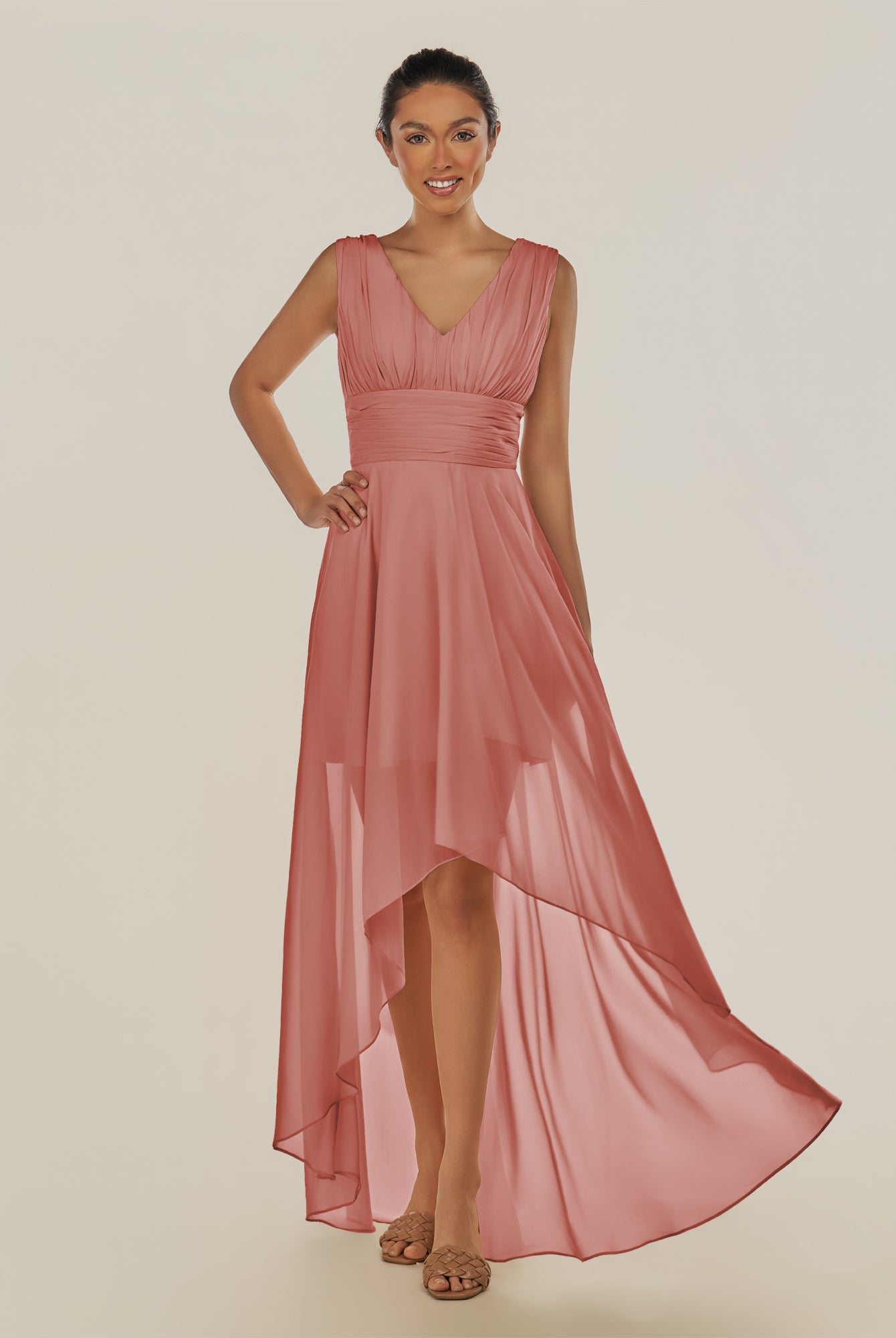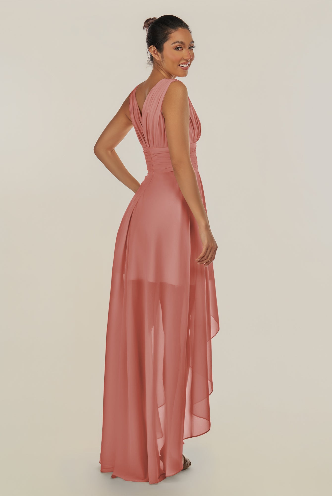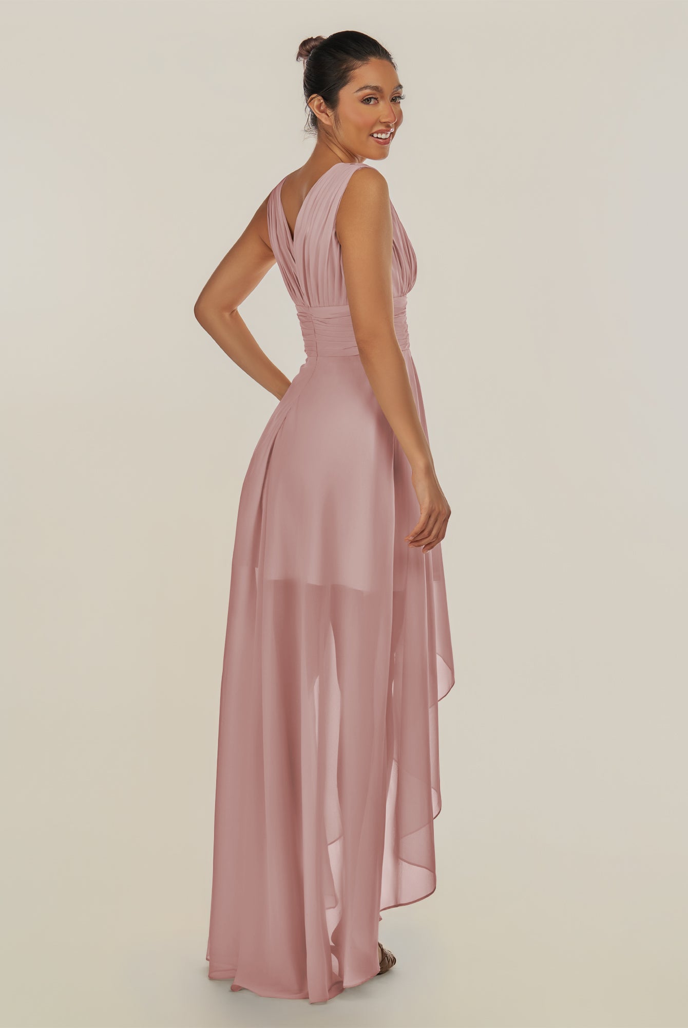 Jovi | Dusty Rose - A Line Chiffon V Neck High-low Length Pleated Long Bridesmaid Dress