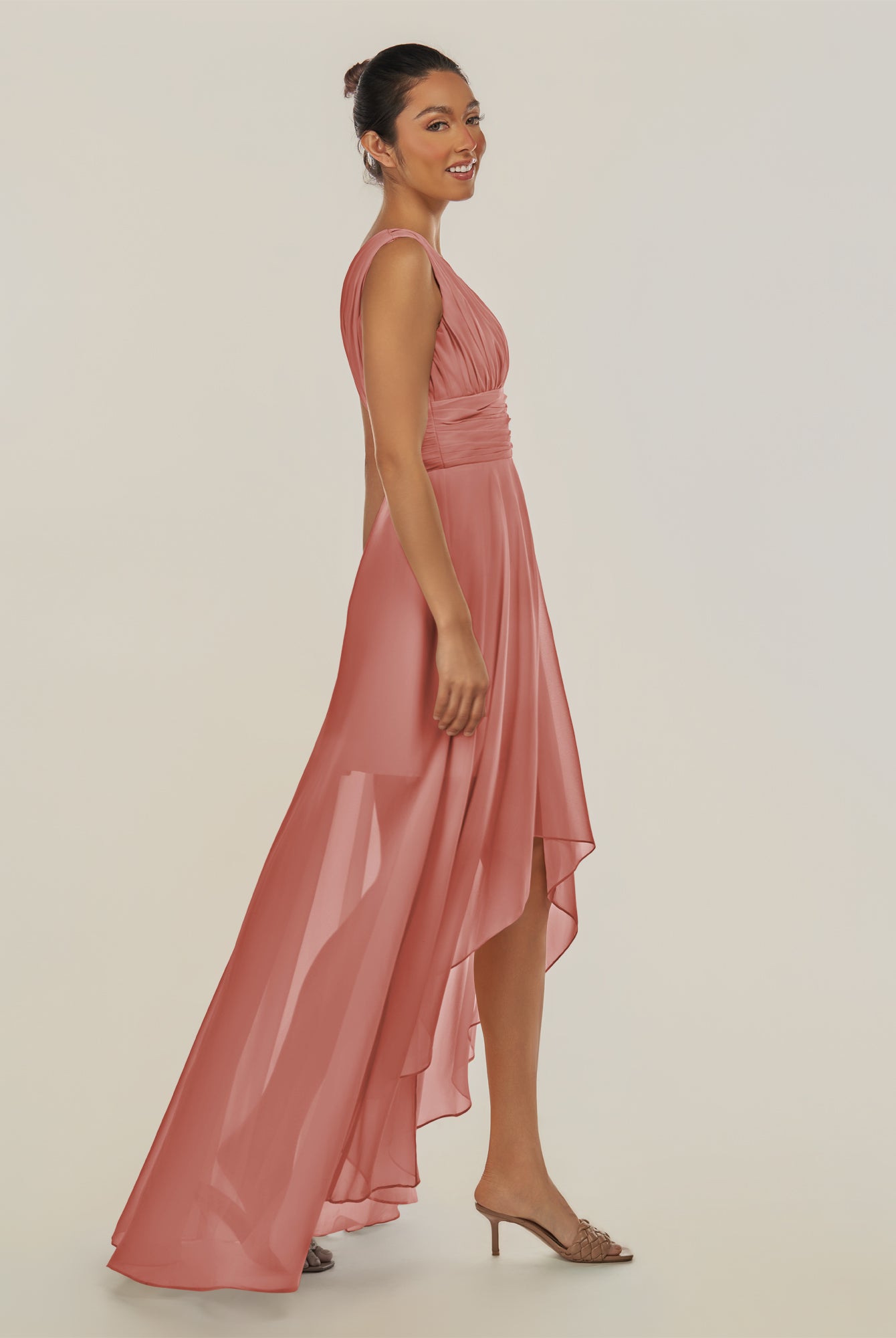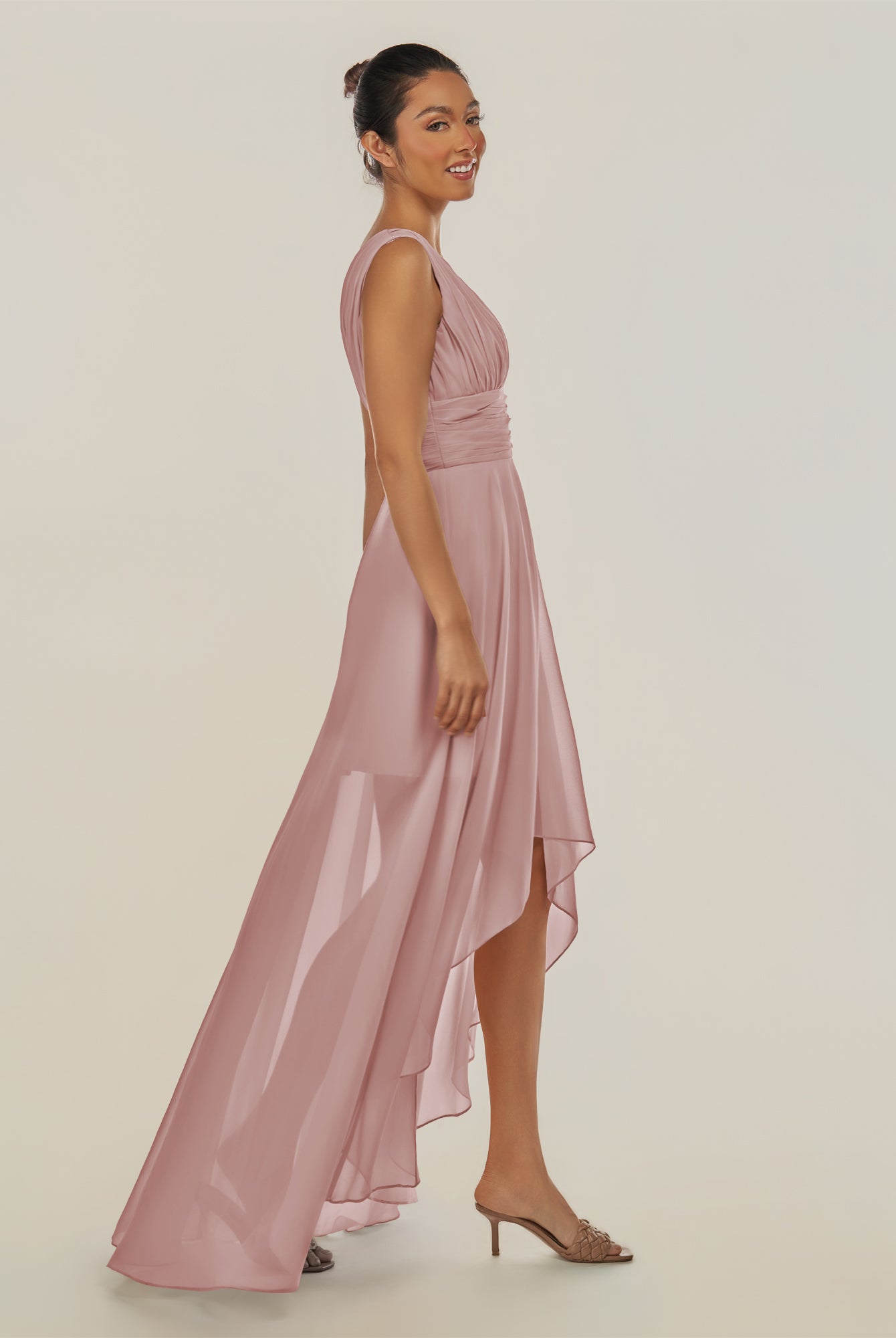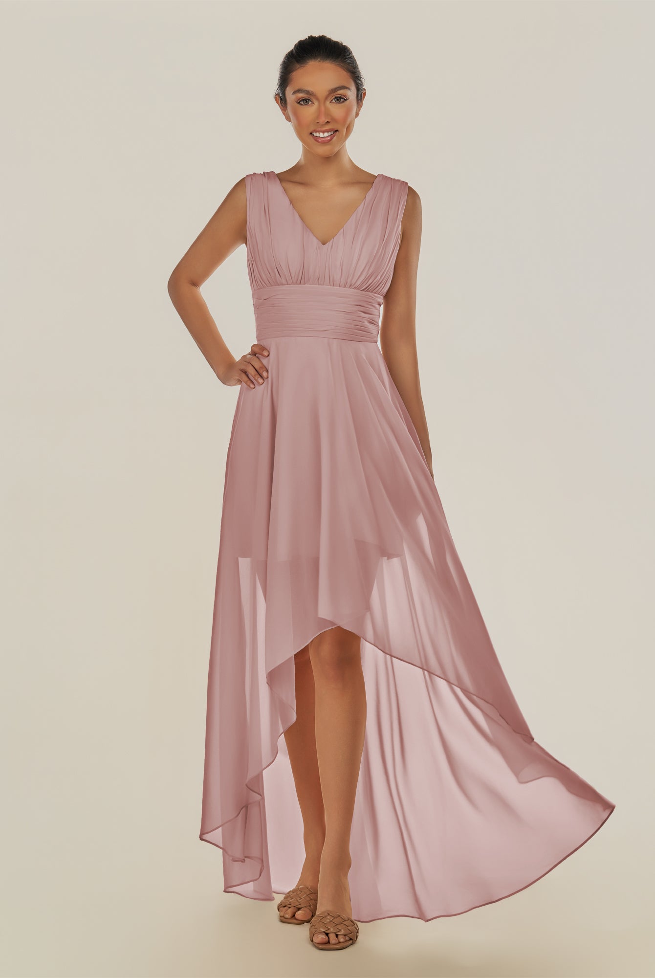 Jovi | Dusty Rose - A Line Chiffon V Neck High-low Length Pleated Long Bridesmaid Dress