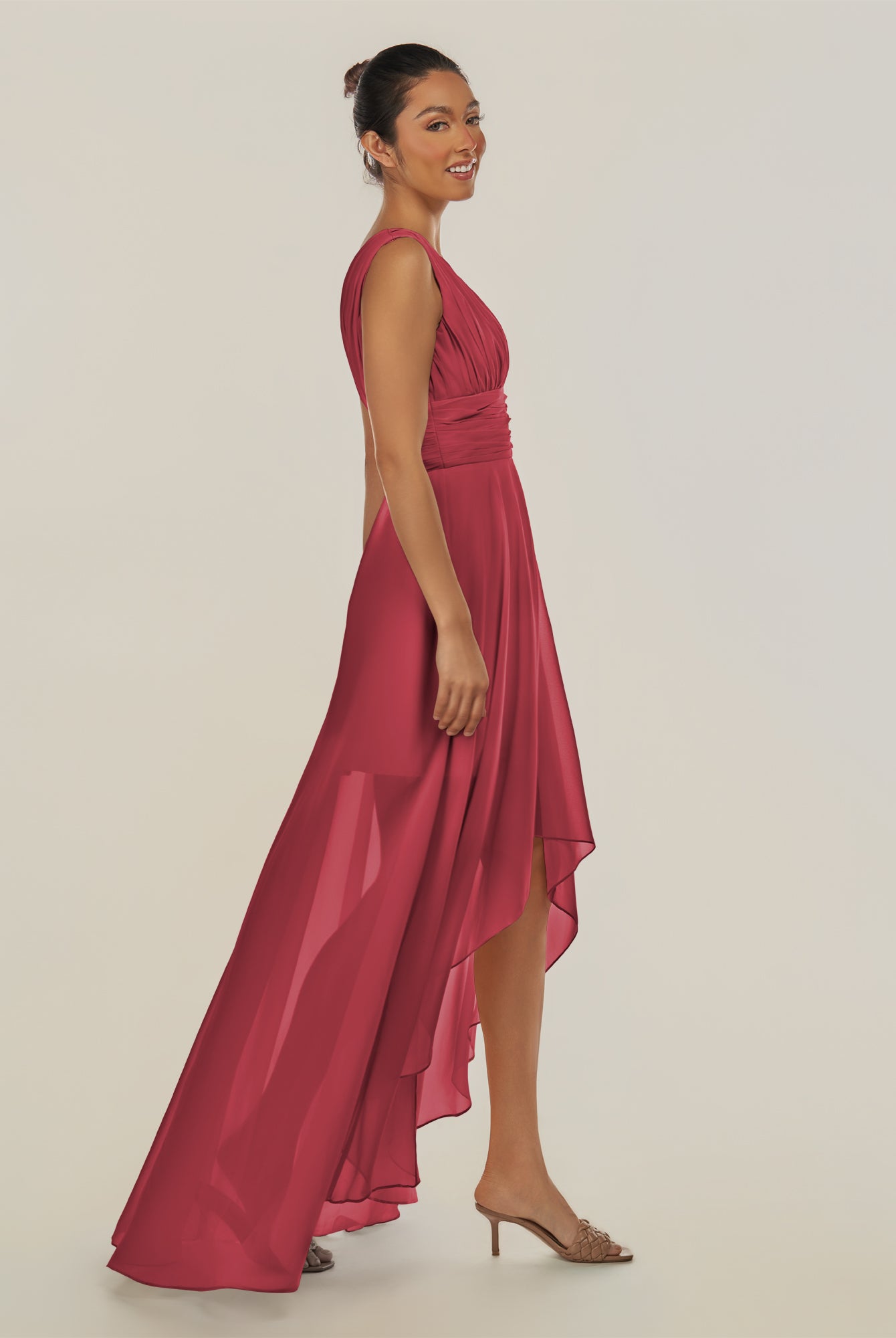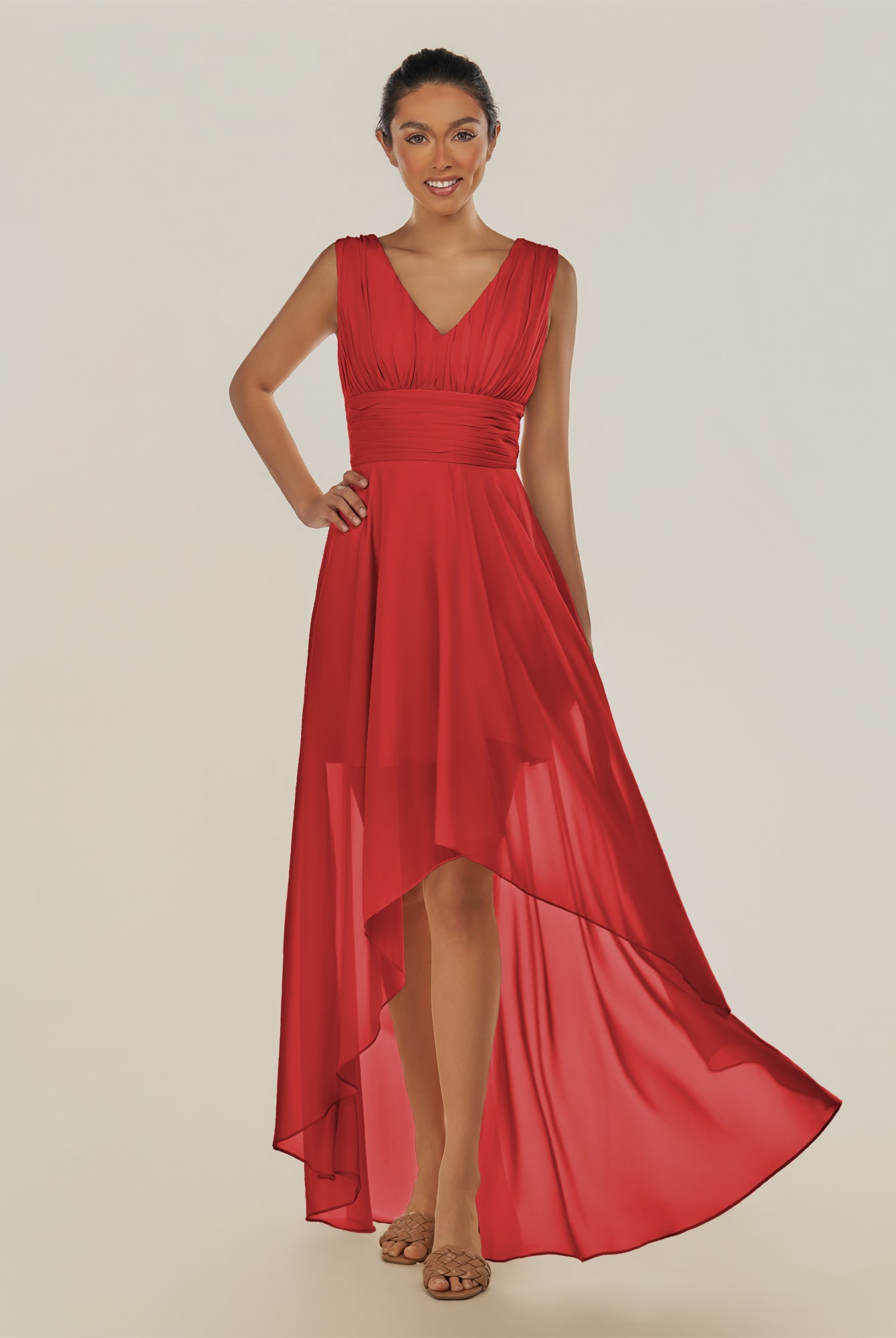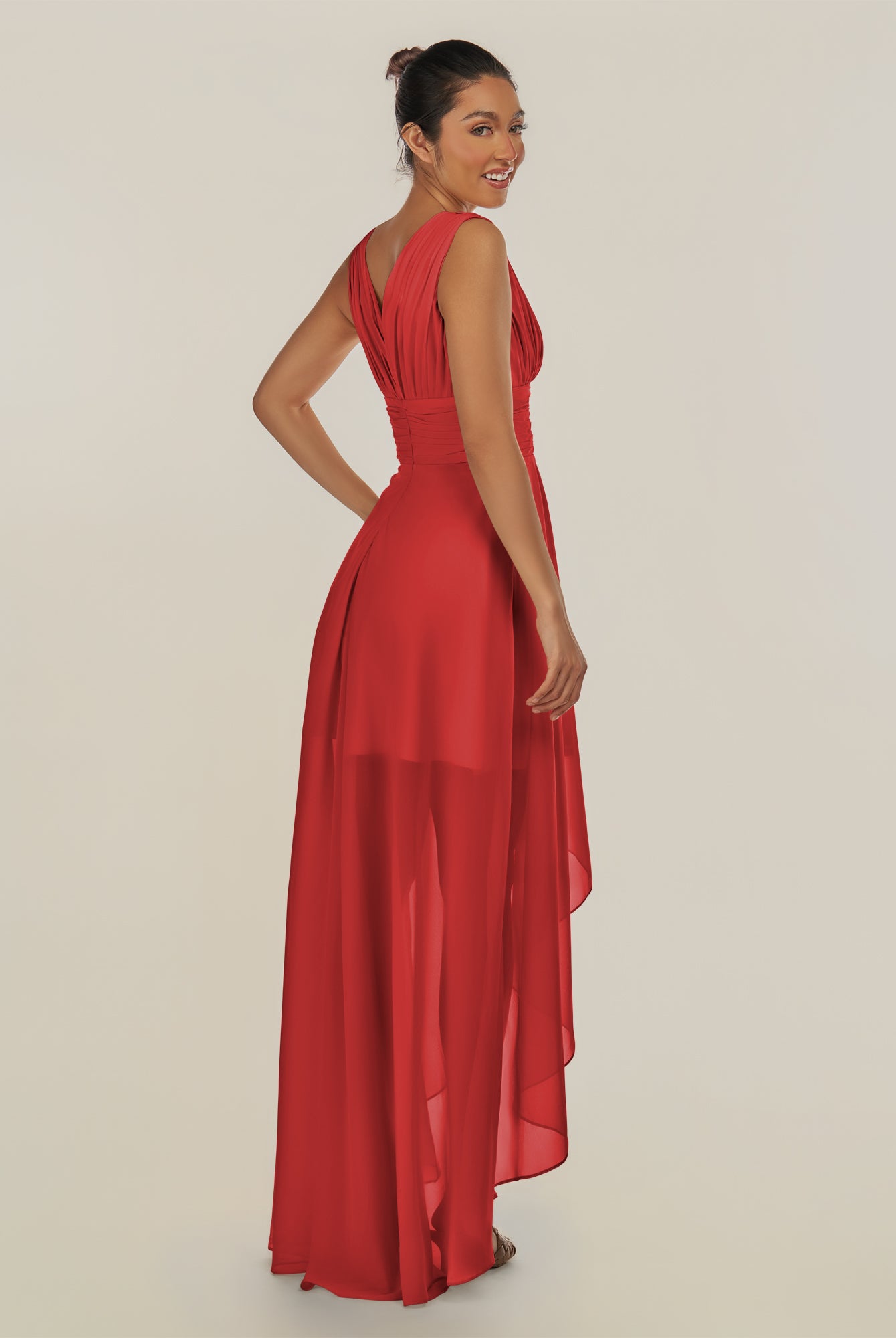 Jovi | Ruby Red - A Line Chiffon V Neck High-low Length Pleated Long Bridesmaid Dress