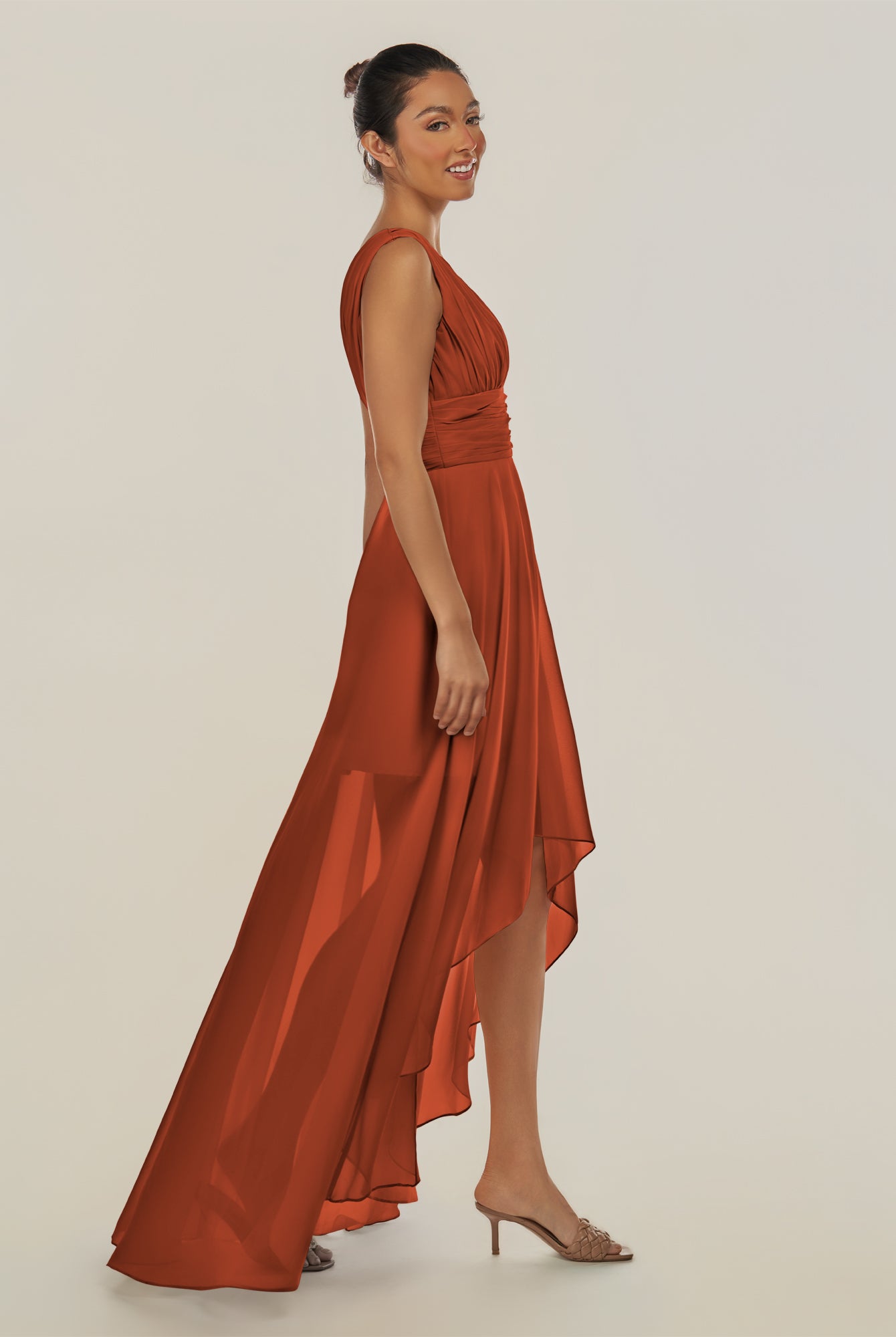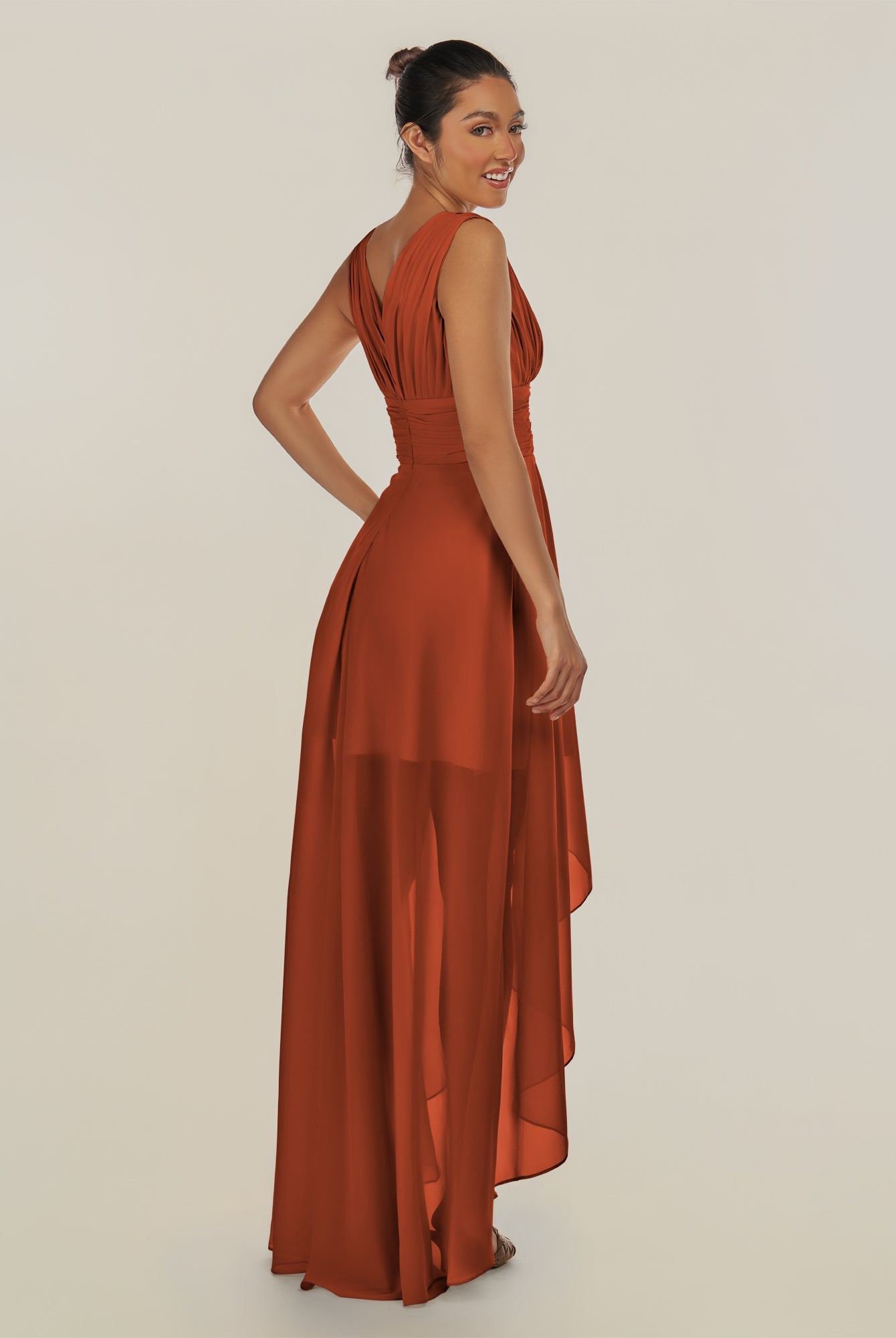 Jovi | Terracotta - A Line Chiffon V Neck High-low Length Pleated Long Bridesmaid Dress
