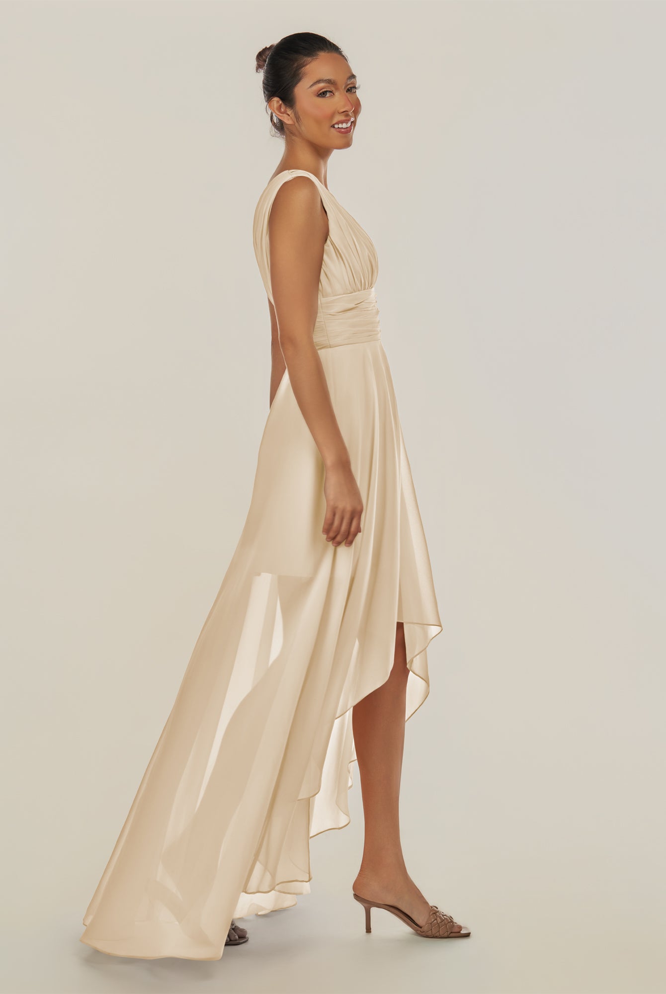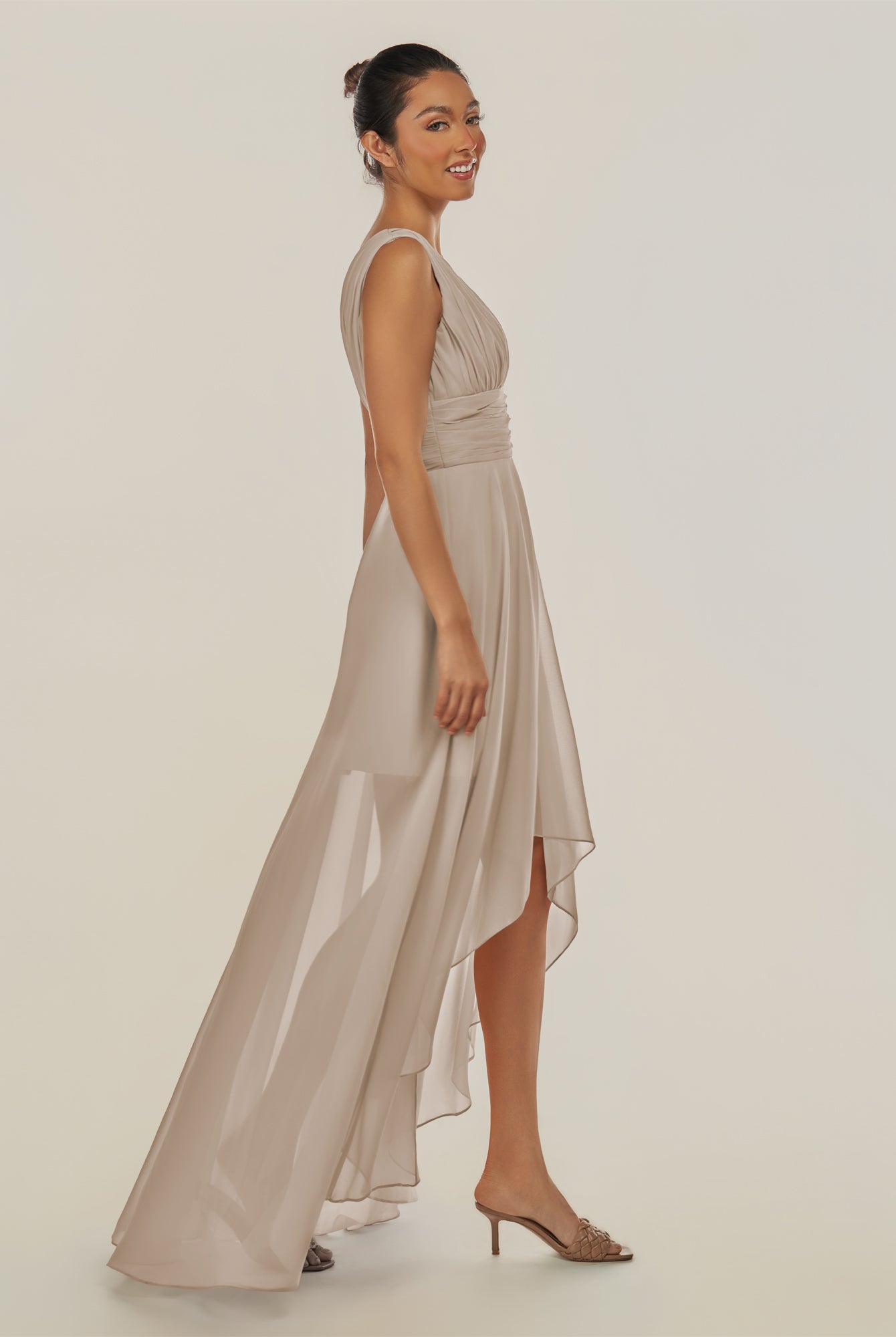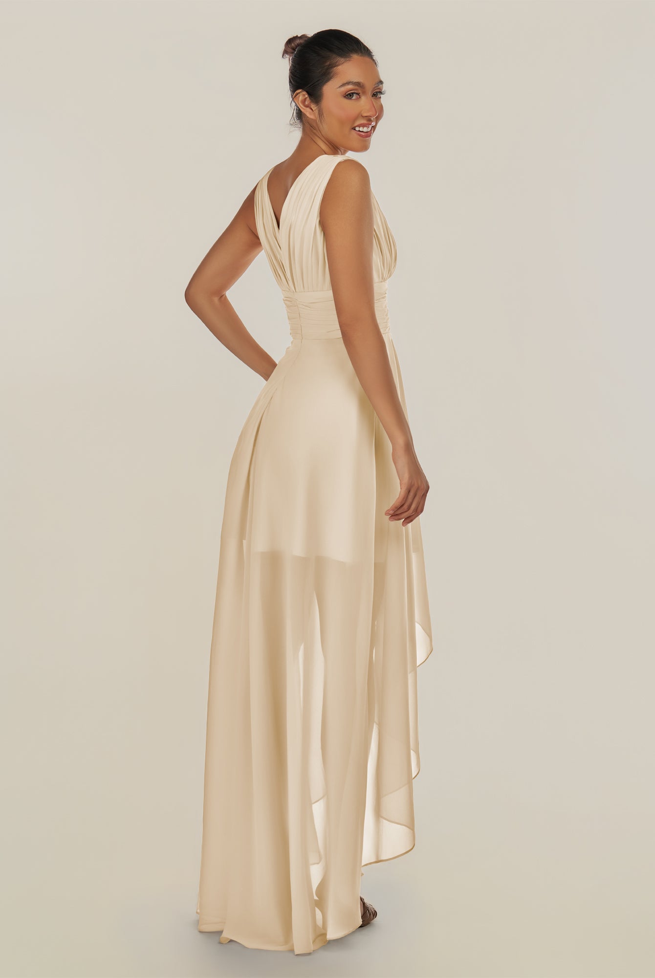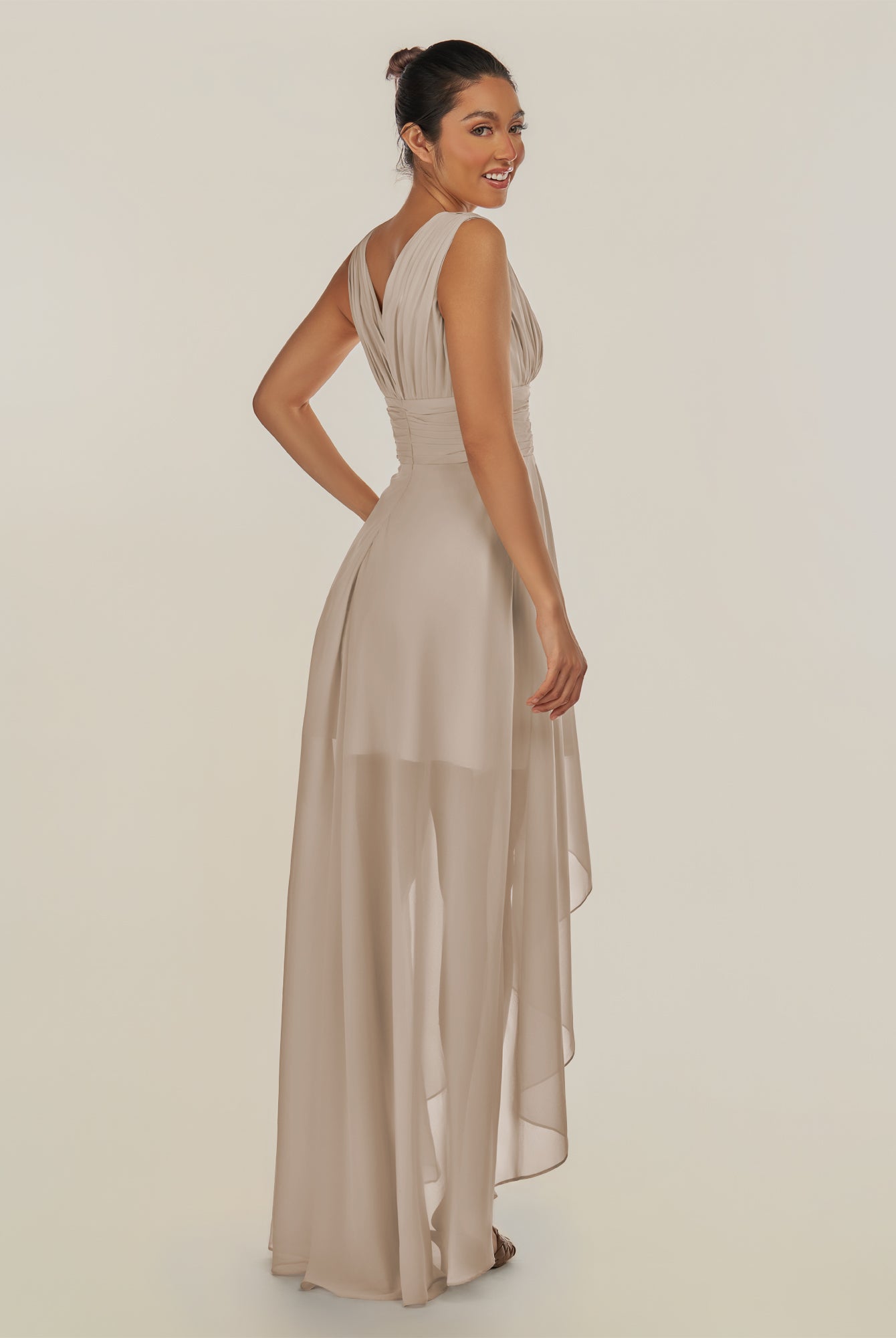 Jovi | Almond - A Line Chiffon V Neck High-low Length Pleated Long Bridesmaid Dress