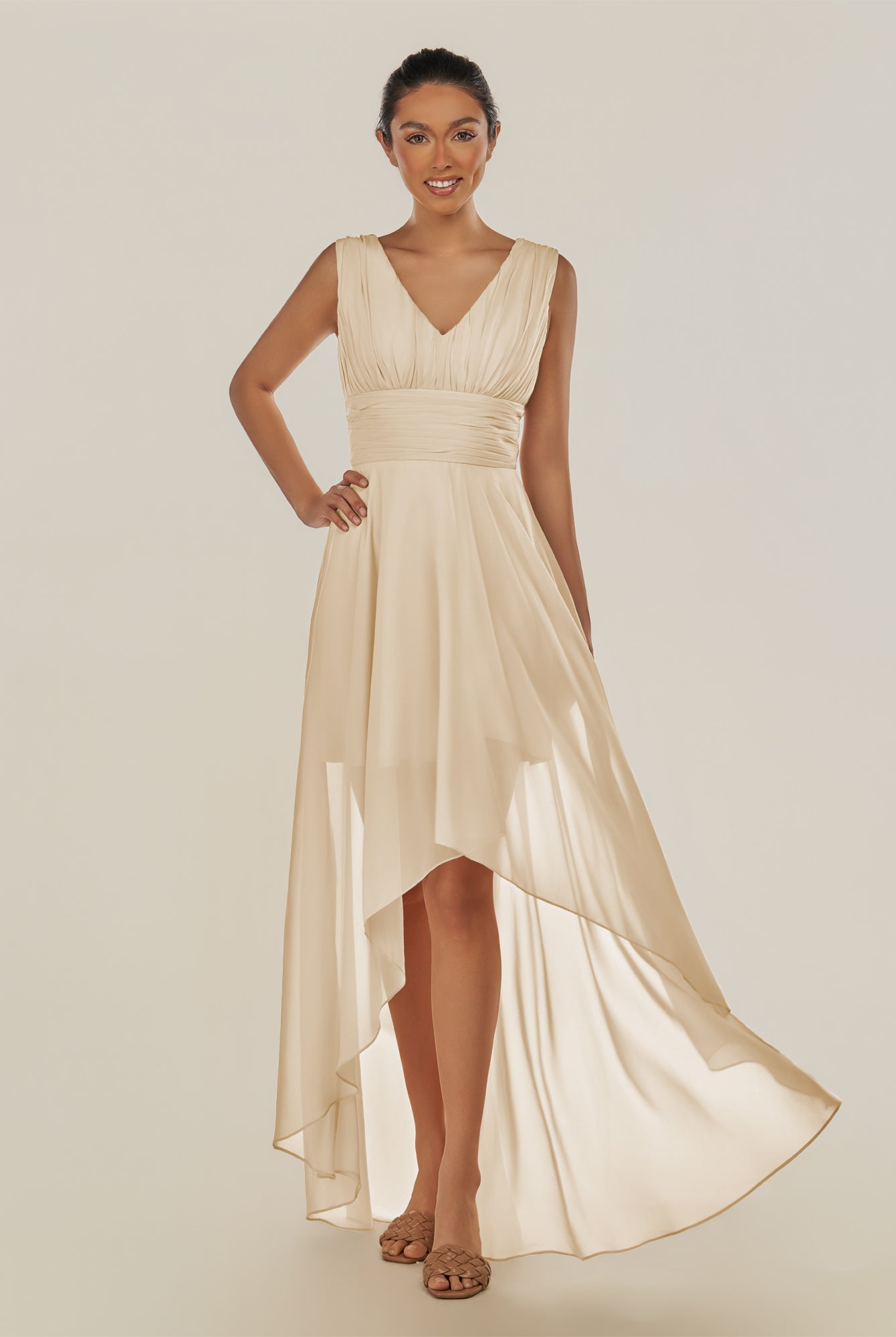 Jovi | Champagne - A Line Chiffon V Neck High-low Length Pleated Long Bridesmaid Dress