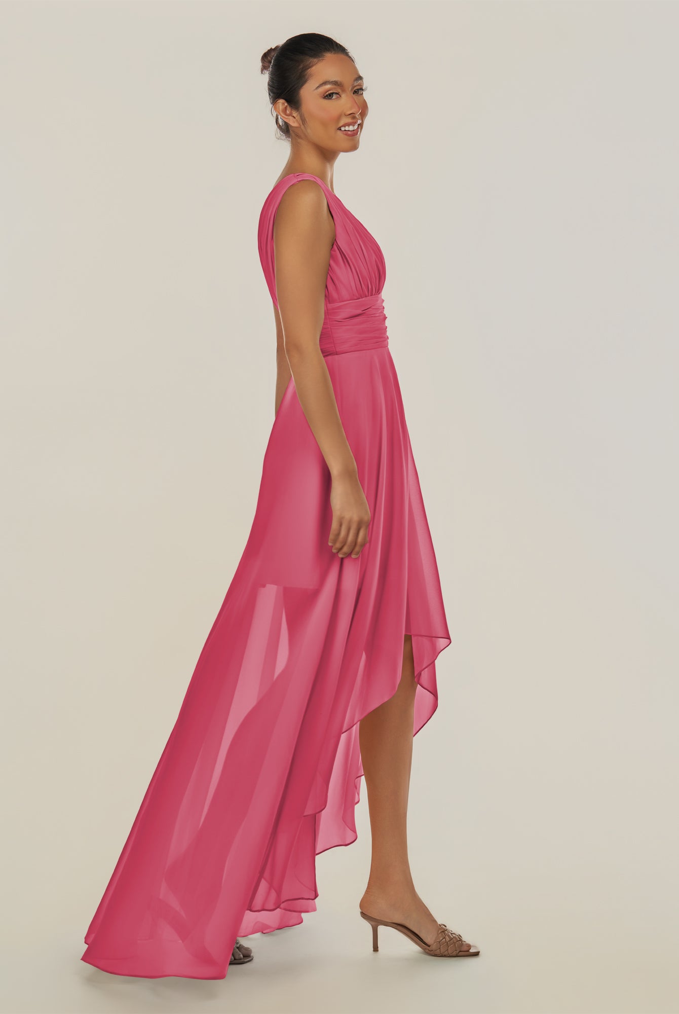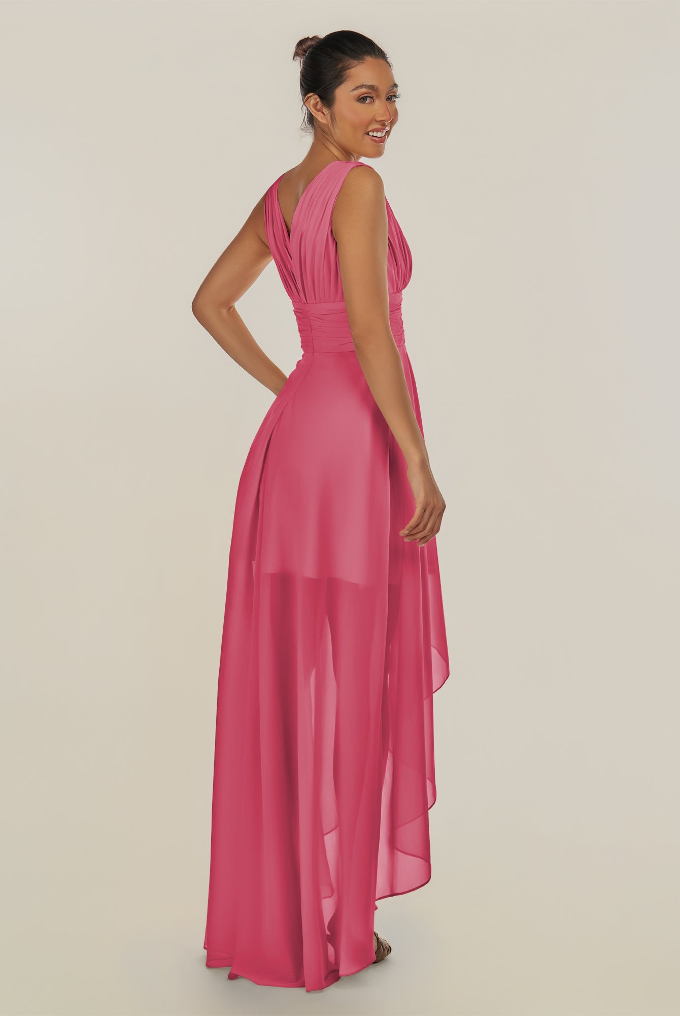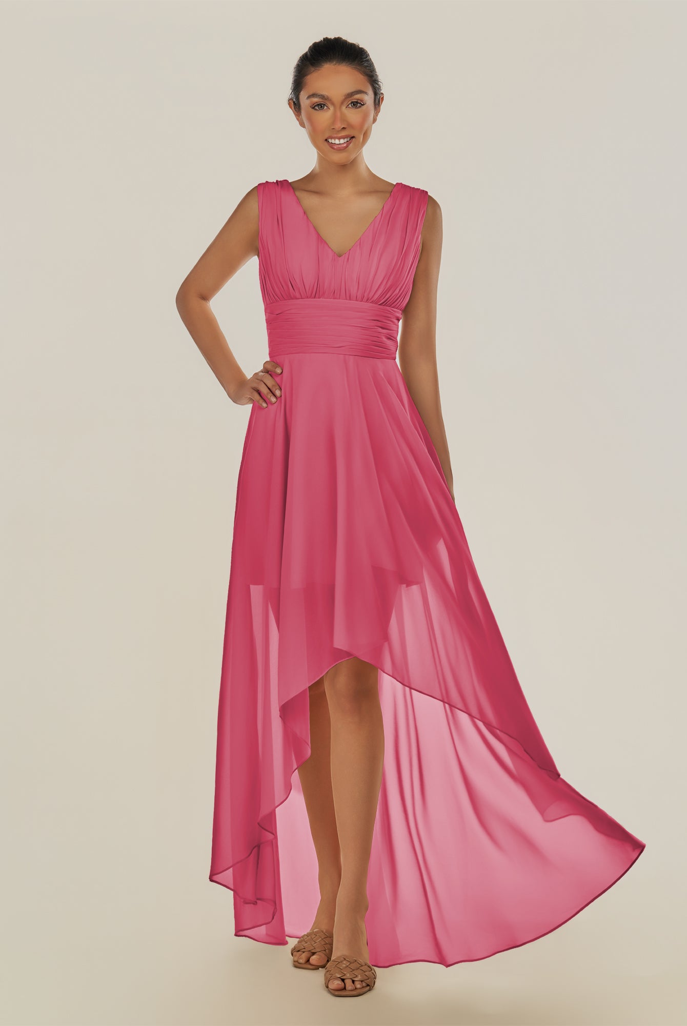 Jovi | Fuchsia - A Line Chiffon V Neck High-low Length Pleated Long Bridesmaid Dress