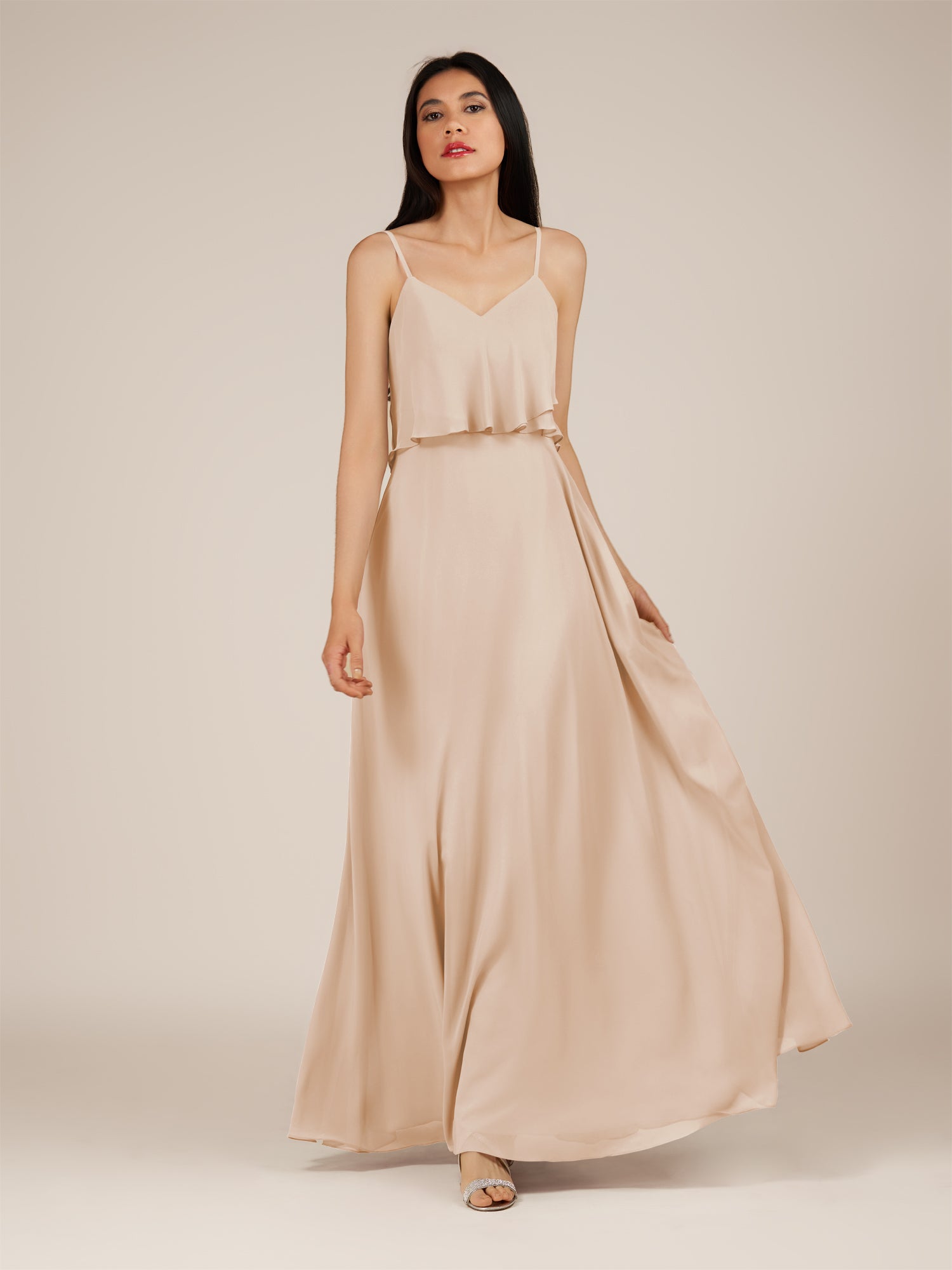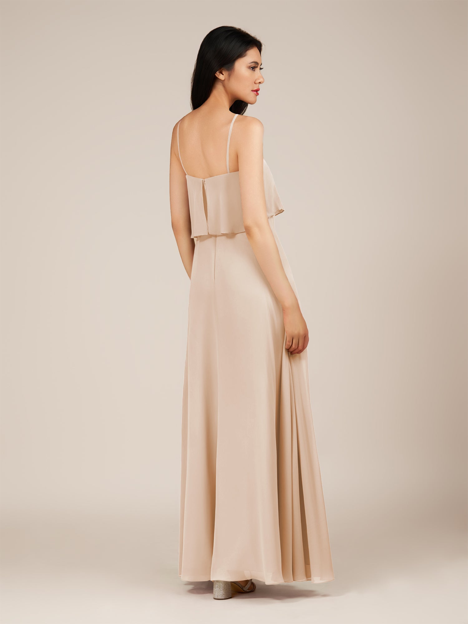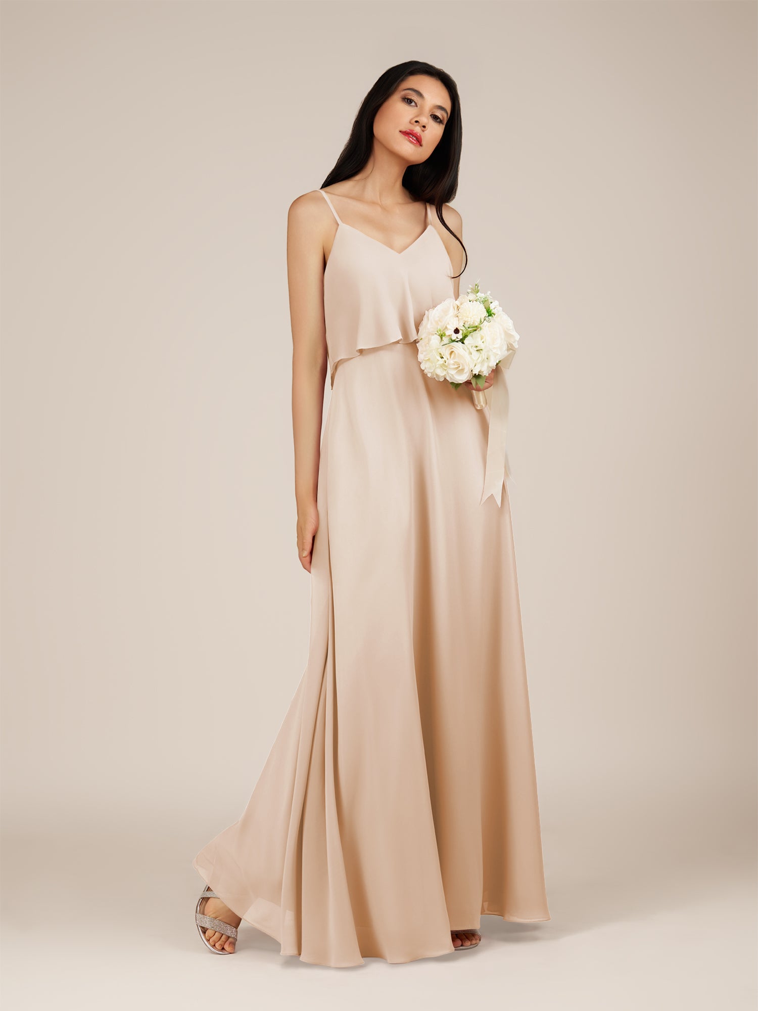 Branwyn is a romantic and elegant choice for your bridal party. Crafted from soft chiffon in a delicate mulberry pink, she features a flattering V neckline and a sleeveless bodice for a timeless silhouette. Her floor-length A-line skirt flows gracefully with every step, accented by playful ruffle details that add movement and charm. Finished with a smooth zipper back, Branwyn brings a perfect blend of sophistication and modern style to weddings and special occasions.