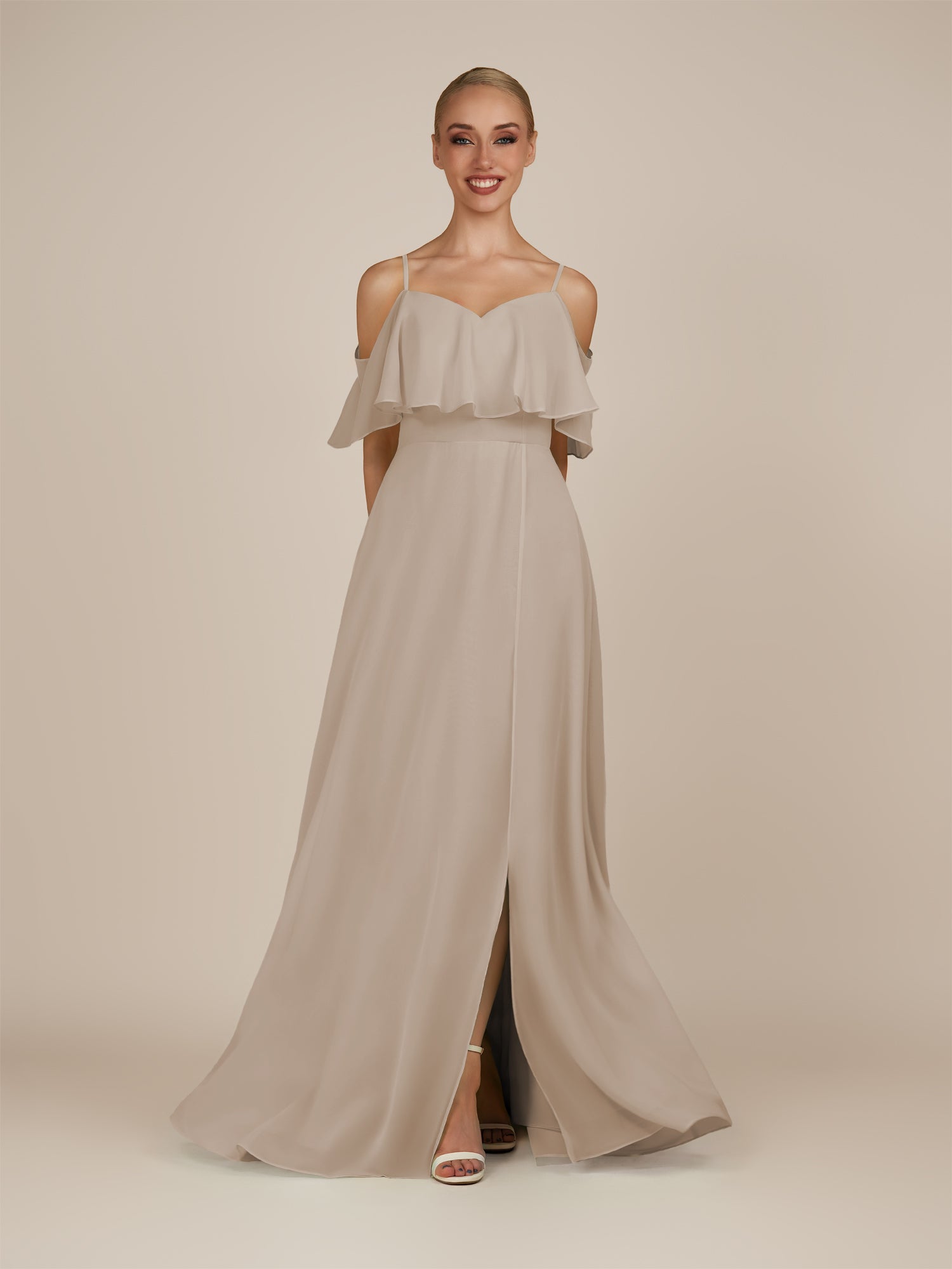 Eira is a romantic and graceful choice for your bridesmaids. Designed in airy chiffon, she features an off-the-shoulder neckline with a soft ruffled overlay that flatters the neckline and shoulders. The fitted bodice flows into a floor-length A-line skirt, complete with a chic side slit that adds ease of movement and a hint of allure. Finished with a sleek zipper back, Eira captures timeless elegance with a touch of modern charm — perfect for any wedding celebration.