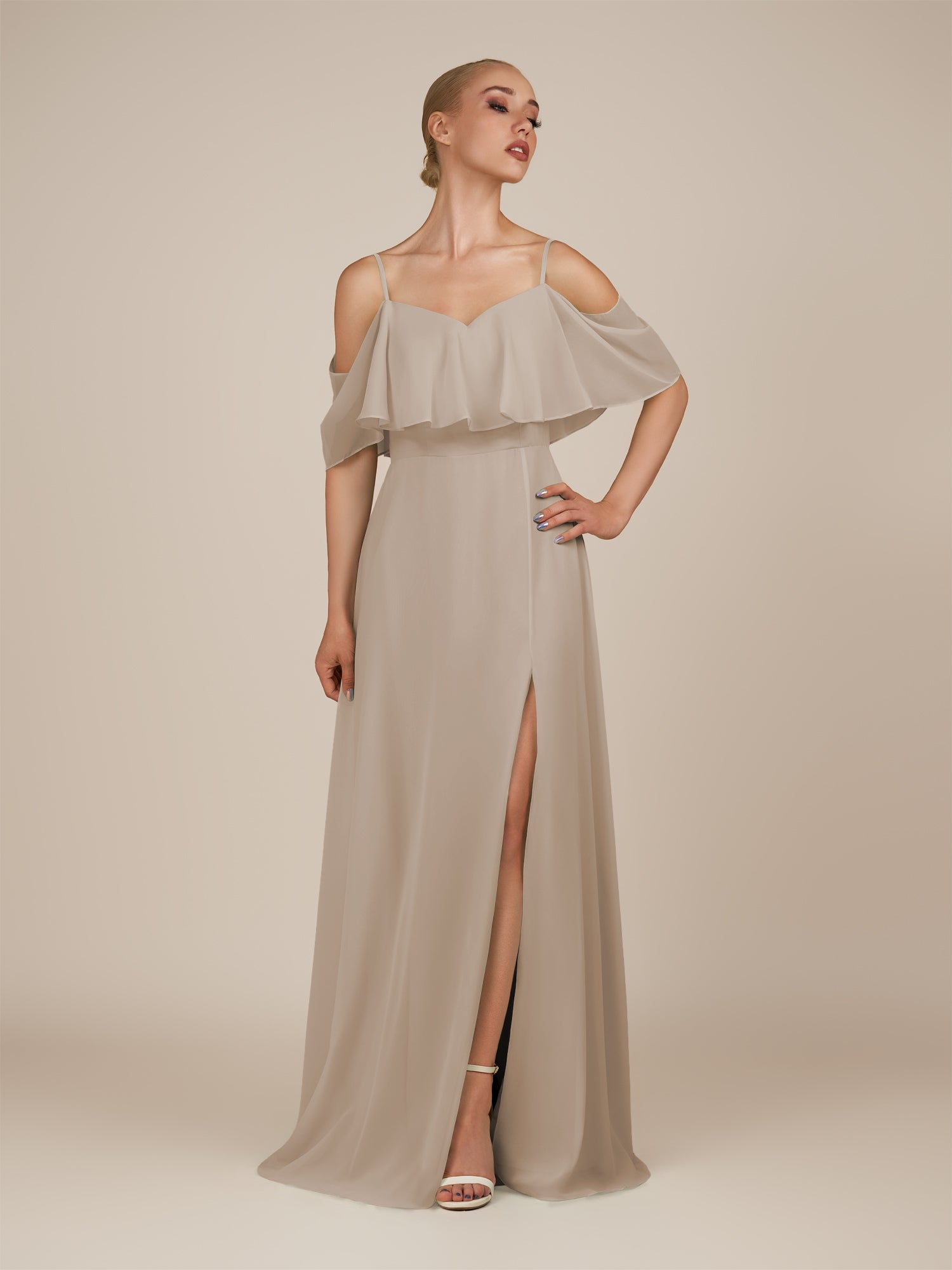 Eira | Almond - A Line Chiffon Off the Shoulder Ruffled Overlay Long Bridesmaid Dress with Slit