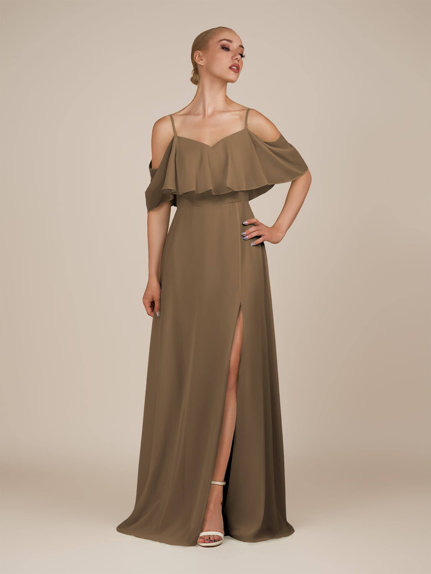 Eira is a romantic and graceful choice for your bridesmaids. Designed in airy chiffon, she features an off-the-shoulder neckline with a soft ruffled overlay that flatters the neckline and shoulders. The fitted bodice flows into a floor-length A-line skirt, complete with a chic side slit that adds ease of movement and a hint of allure. Finished with a sleek zipper back, Eira captures timeless elegance with a touch of modern charm — perfect for any wedding celebration.