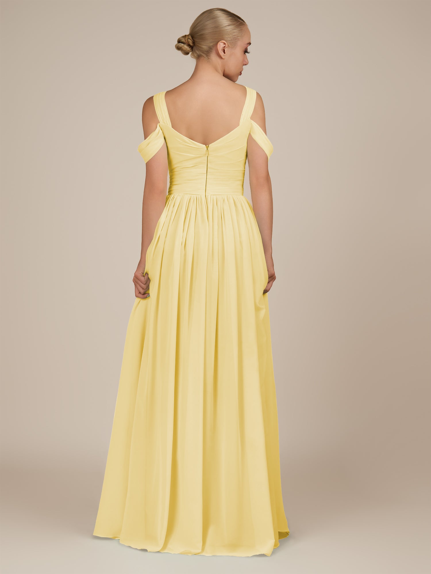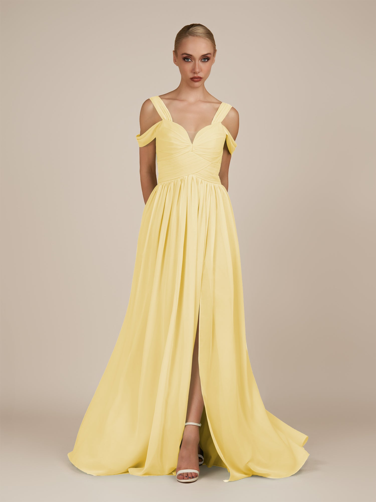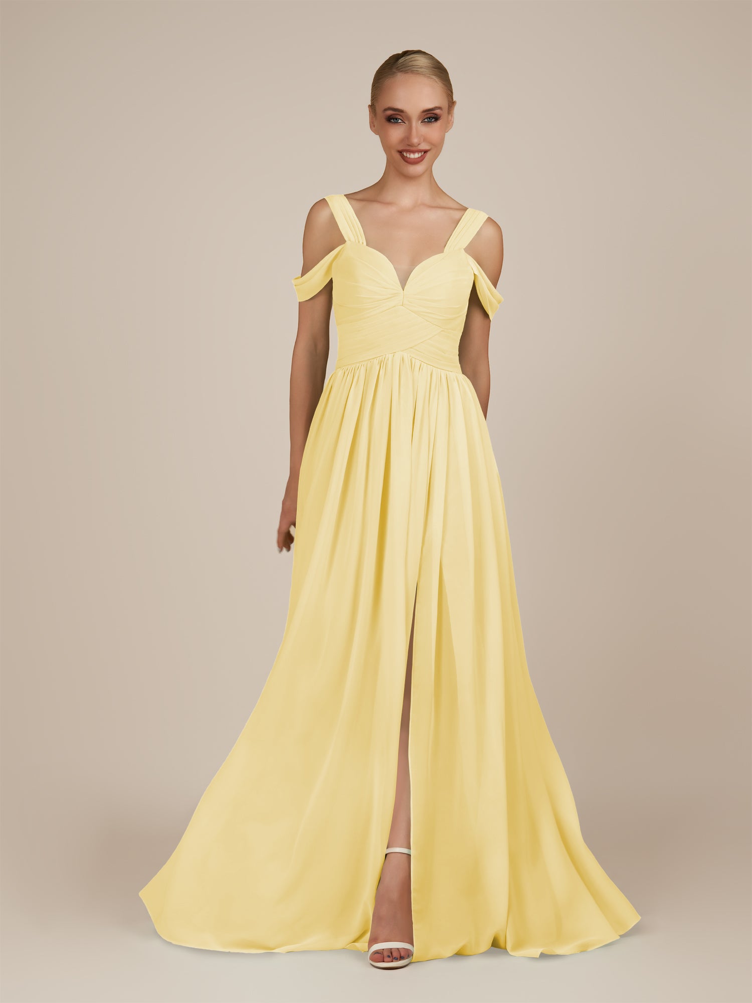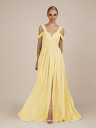Faye | Pastel Yellow - A Line Chiffon Off the Shoulder Pleated Long Bridesmaid Dress with Slit