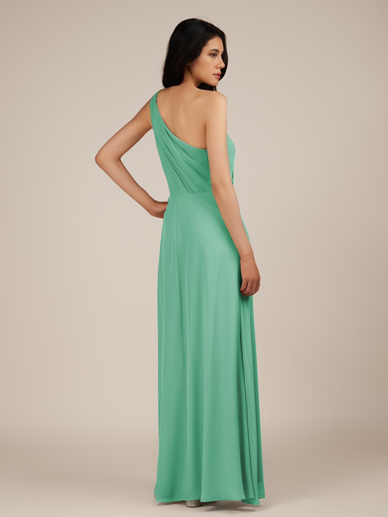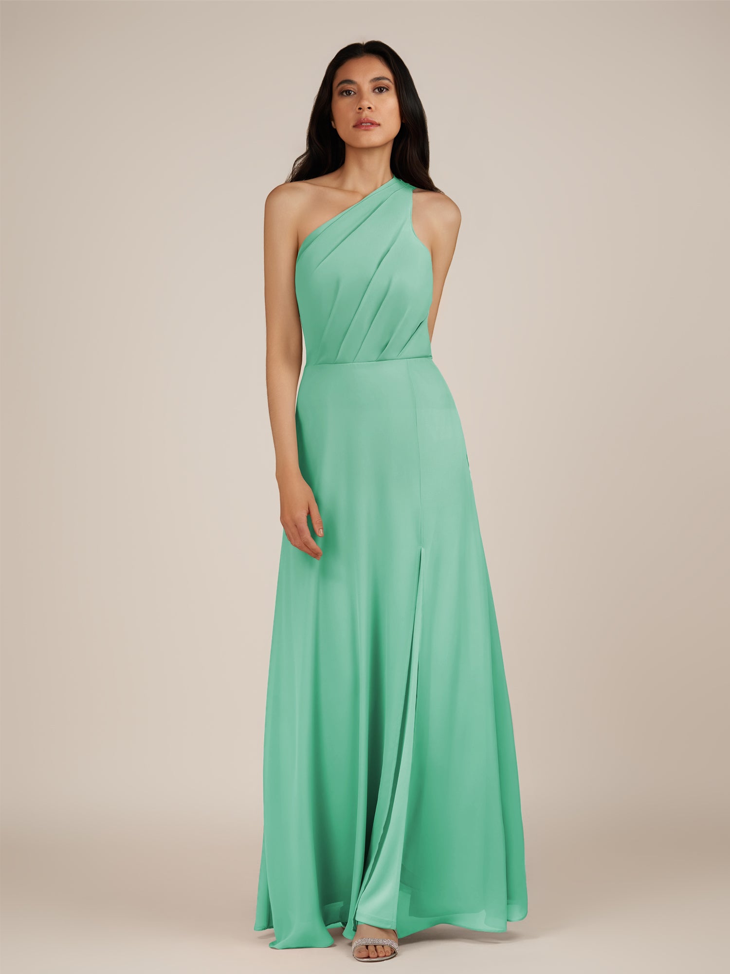 Gaura is a sophisticated and elegant choice for your bridal party. Crafted from soft chiffon, she features a flattering one-shoulder neckline and a sleeveless bodice for a modern, graceful look. Her floor-length A-line skirt flows effortlessly with every step, enhanced by delicate pleats and a subtle side slit for added movement and charm. Finished with a smooth zipper back, Gaura combines timeless elegance with contemporary style, perfect for weddings and special occasions.