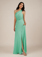 Gaura | Turquoise - A Line Chiffon One Shoulder Pleated Long Bridesmaid Dress with Slit