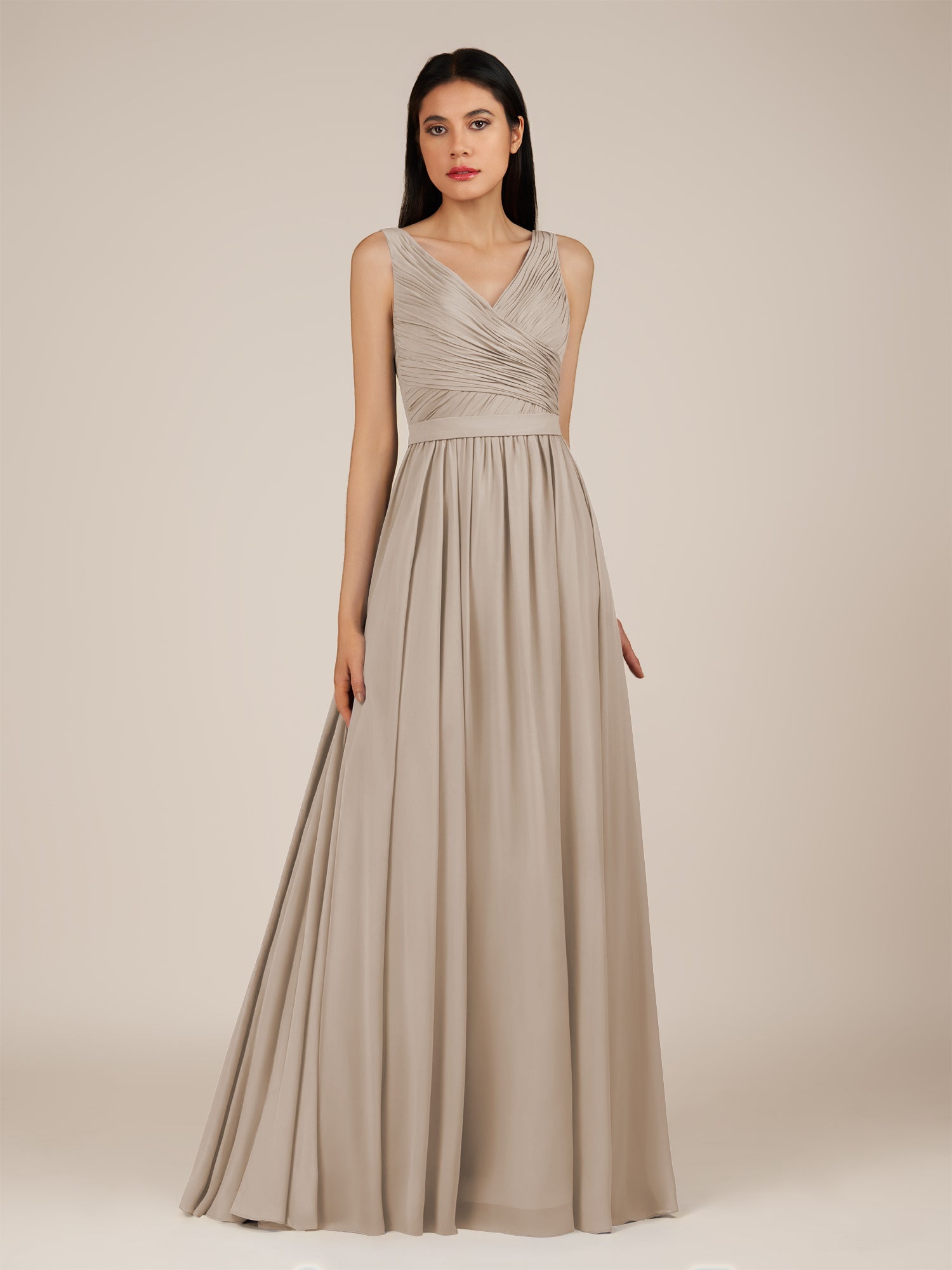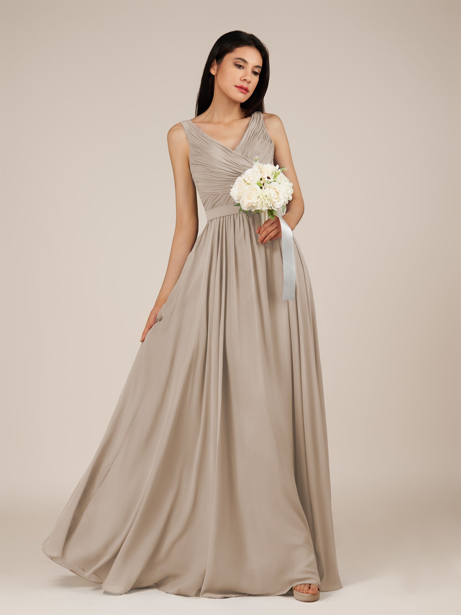Lysander | Almond - A Line Chiffon V Neck Pleated Long Bridesmaid Dress
