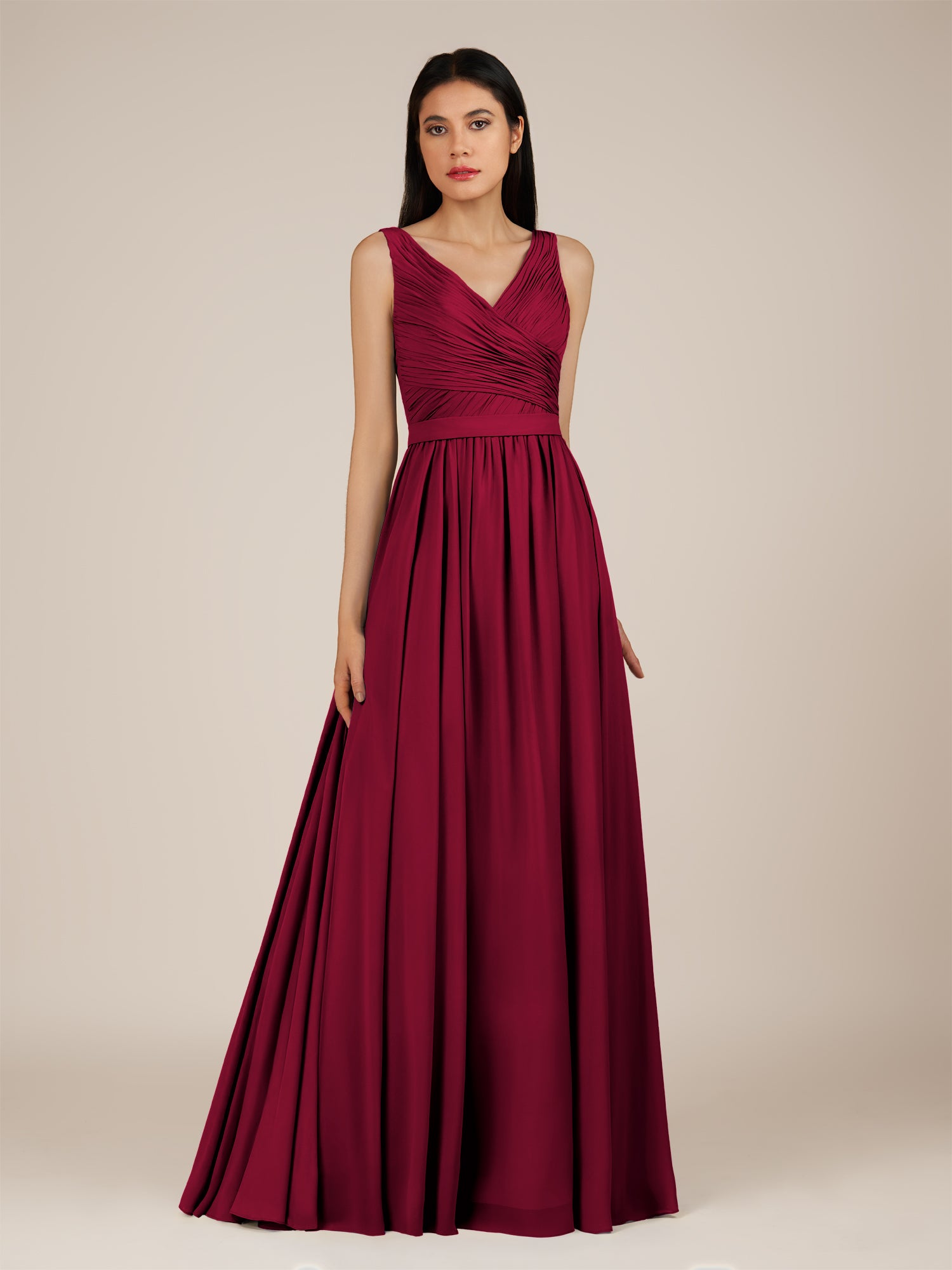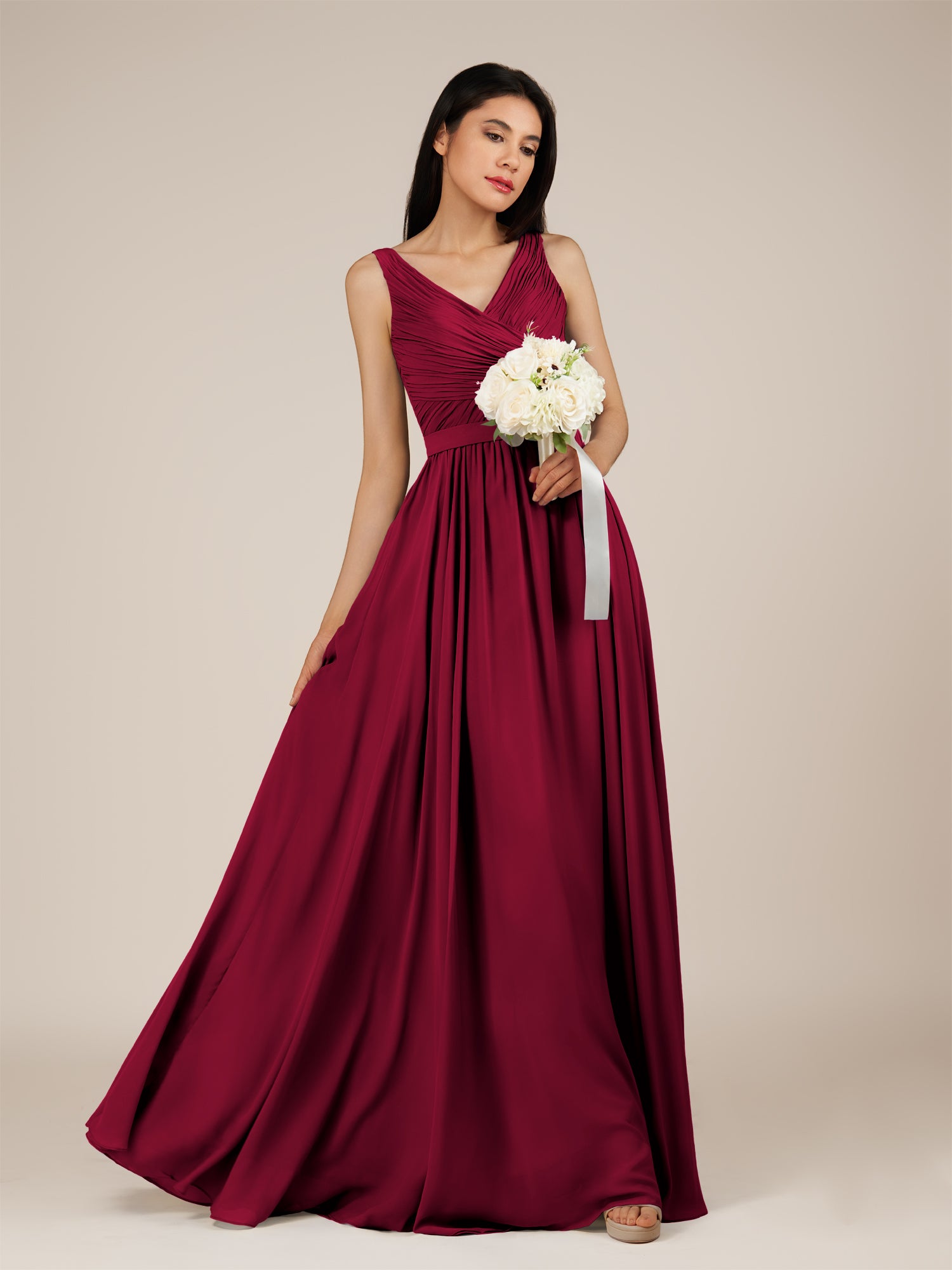 Lysander | Berry - A Line Chiffon V Neck Pleated Long Bridesmaid Dress