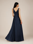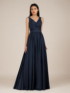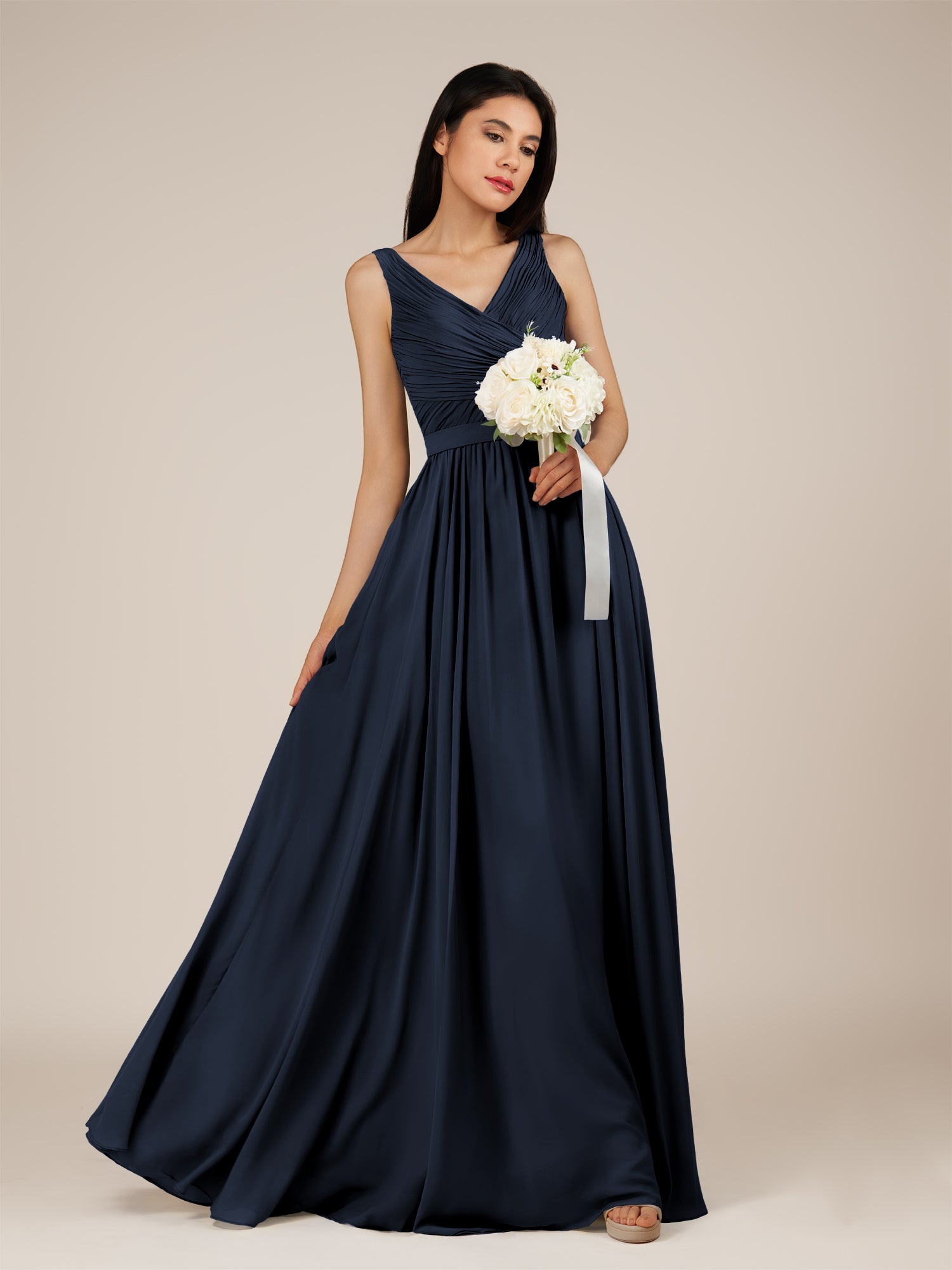 Lysander | Dark Navy - A Line Chiffon V Neck Pleated Long Bridesmaid Dress
