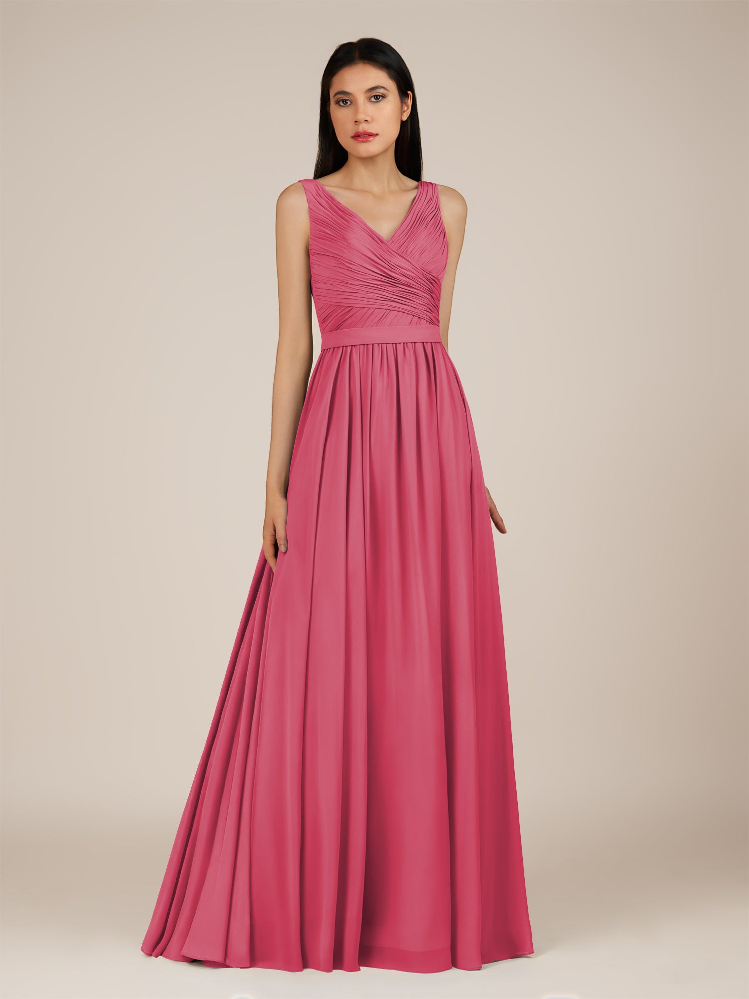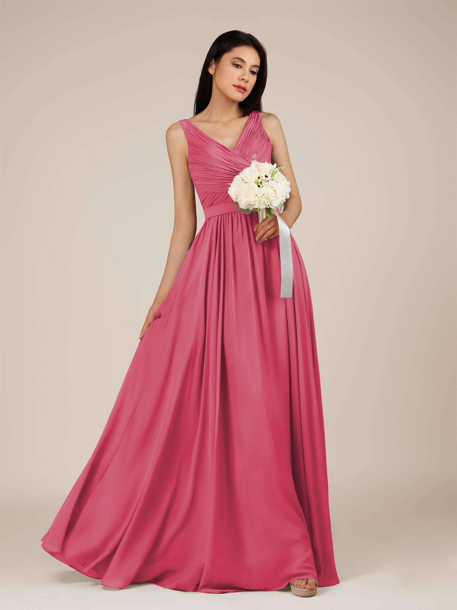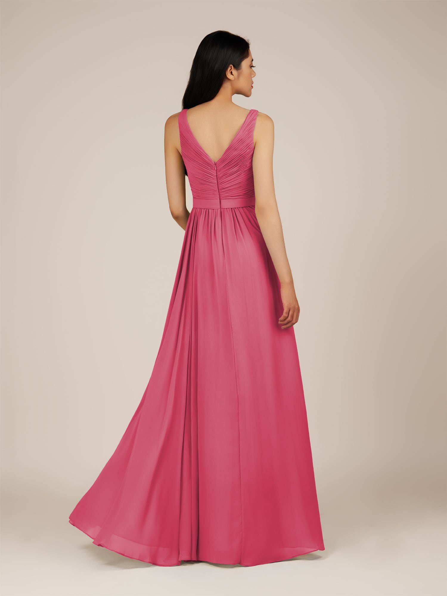 Lysander | Fuchsia - A Line Chiffon V Neck Pleated Long Bridesmaid Dress