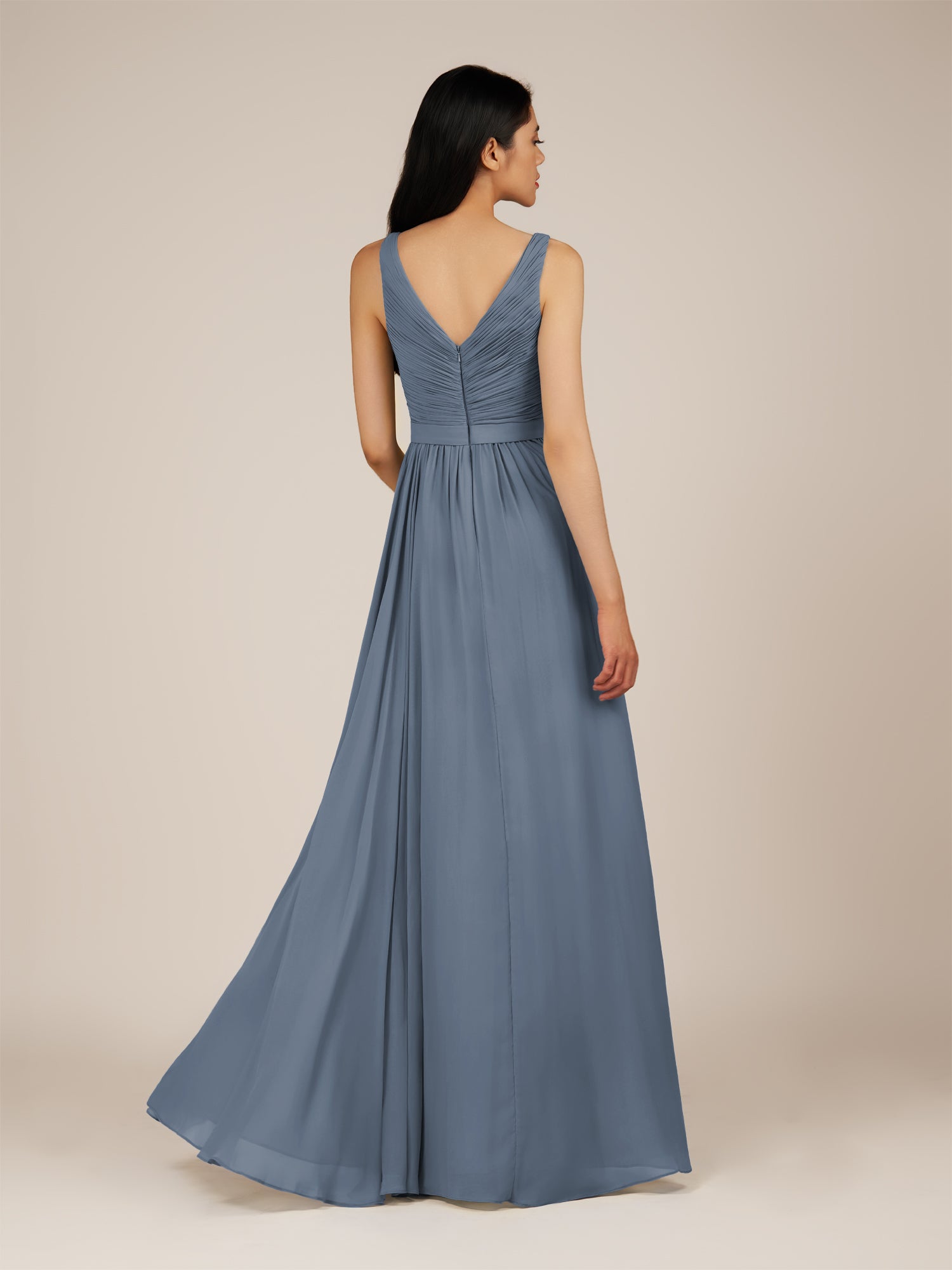 Lysander brings a timeless touch of elegance to your bridal party. Crafted from soft chiffon, this A-line bridesmaid dress features a flattering V-neckline and a pleated bodice that enhances the natural waistline. The floor-length skirt flows effortlessly, creating graceful movement with every step. Finished with a classic zipper back, Lysander offers a refined and romantic look that¡¯s perfect for any season or wedding theme.